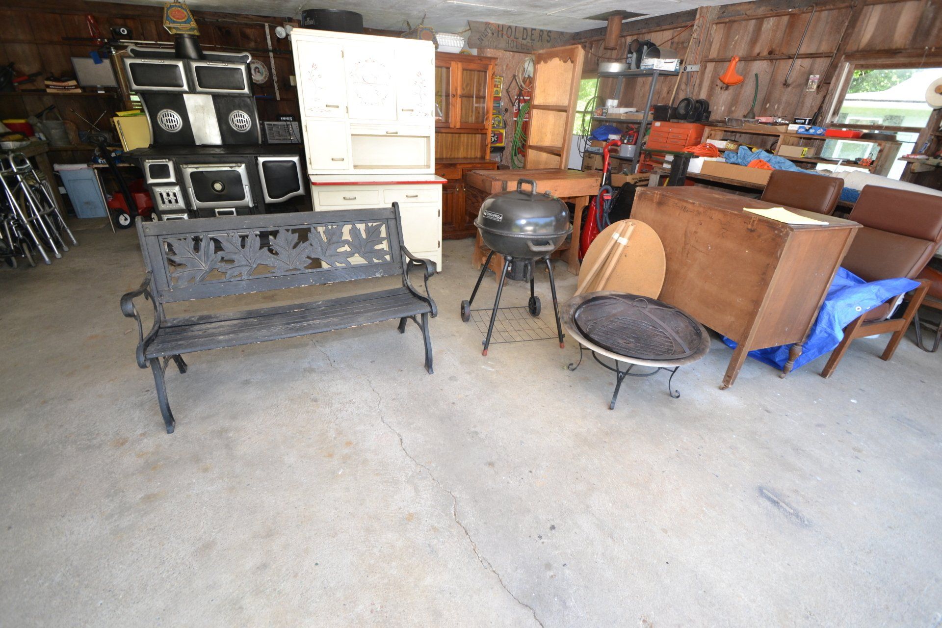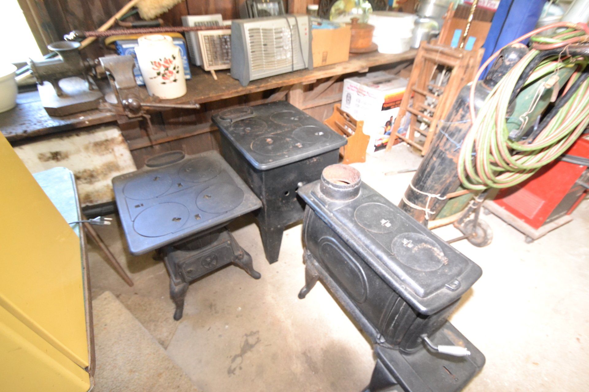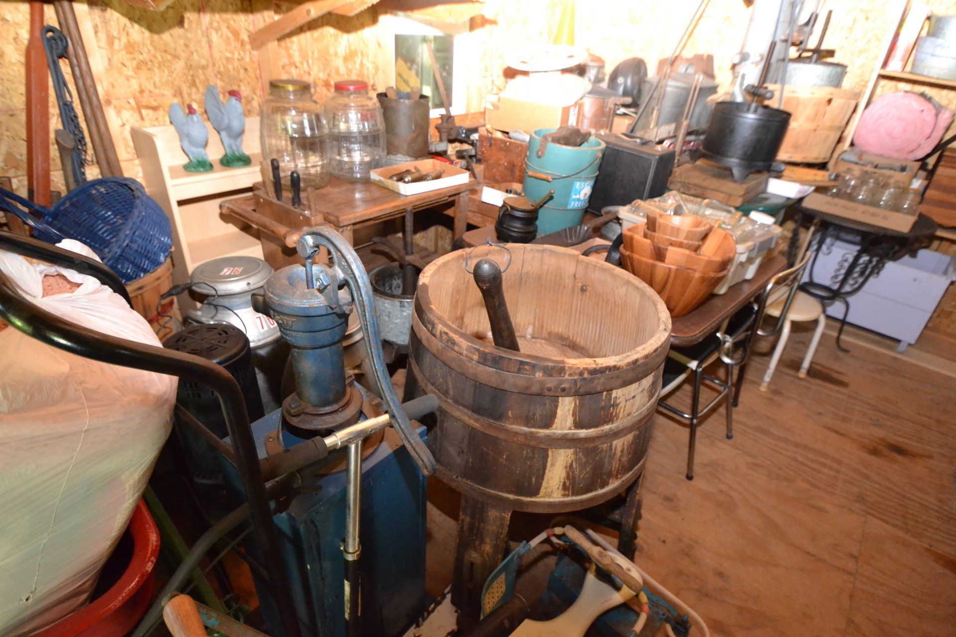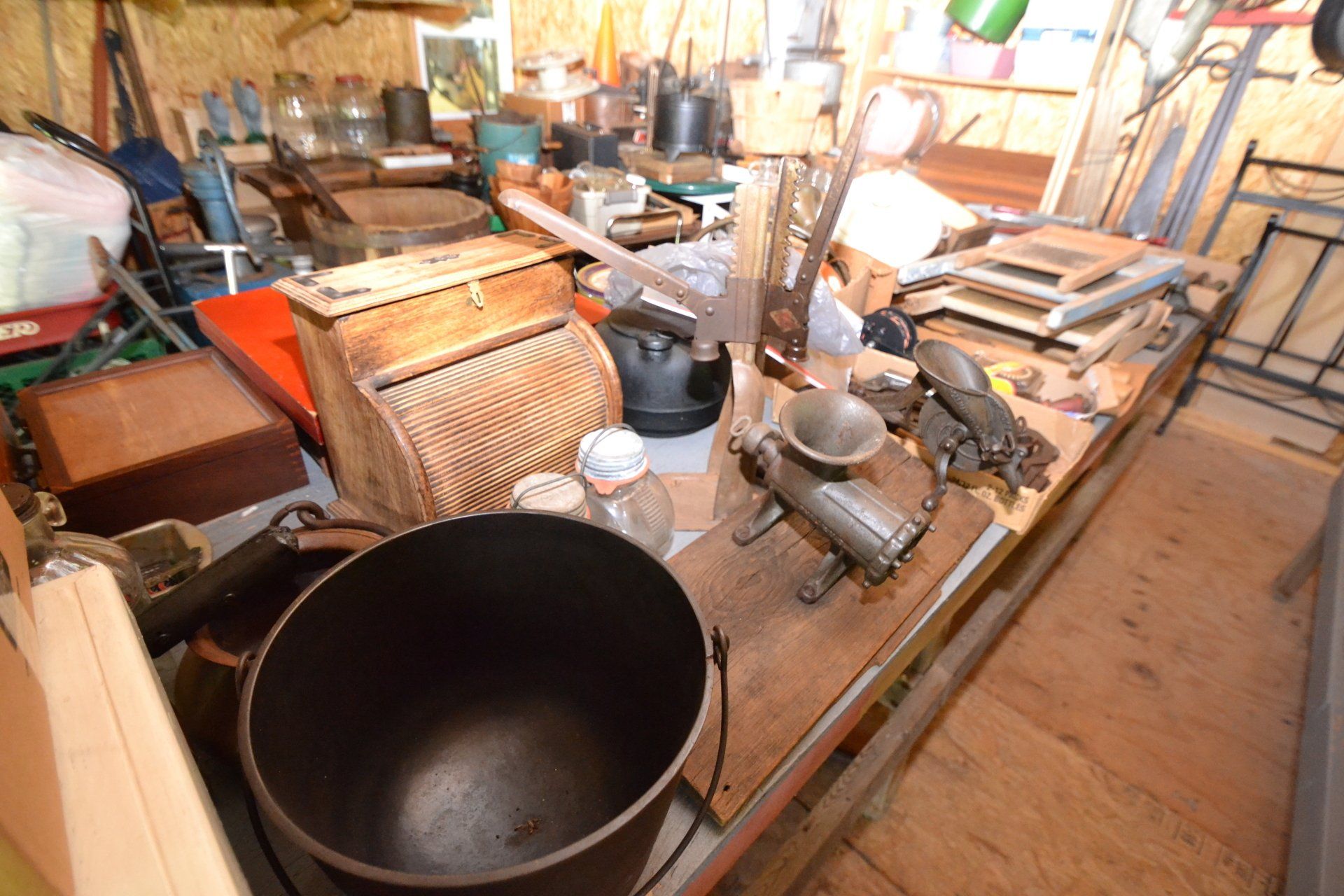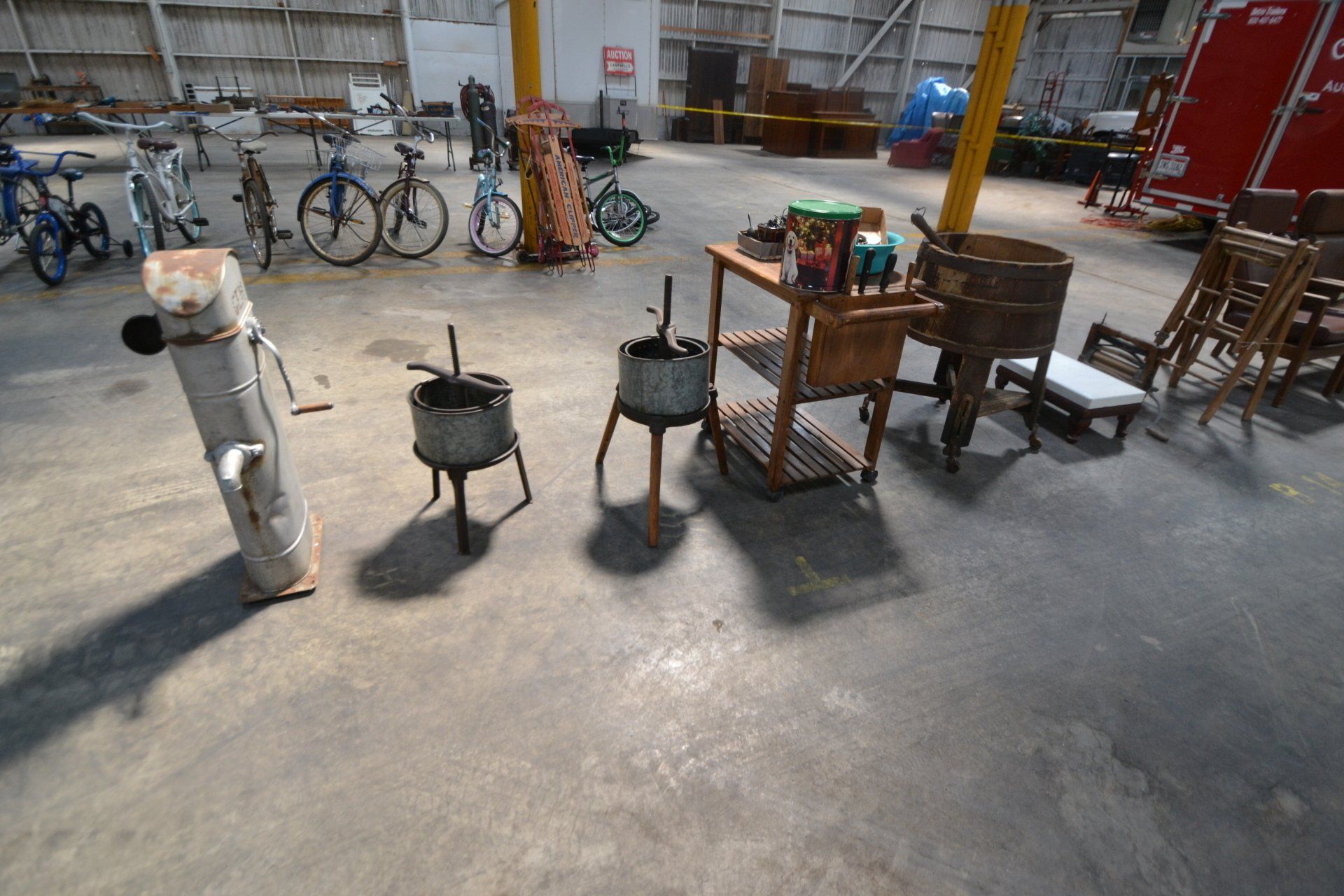 Copper Clad H-series, wood burning kitchen range, complete, functional and very nice; Sceinch kitchen cabinet w/ flour bin and sifter; butchers block; several small cast iron kitchen and laundry stoves; 25 cent Aristocrat slot machine; dozens and dozens cast skillets, Griswold, Wagner, etc; cast iron pitcher pump; large cast iron pots; several lard presses; nice cream and milk cans; wash boilers; Gem cistern pump; very large cast iron pot with spider, lid and handle; Crosley style baby stroller; brass oil can; zinc top jars; Radio Flyer wagon; several old wagons; large selection of great older bikes in good condition; corn sheller; old step stool; old automotive equipment; reel type mower; crockery; lanterns; several park benches; child’s park bench; brass; porcelain; sleds; laundry tubs with base and ringer; meat cleavers; some really nice fishing poles; small pot-belly stove; cast tea pot; collection of churns- Daisy, hand cranks, tumbler, dasher styles; meat saws; bells; tins; bottle capper; tobacco hand setter; cross cut saws wheat scythes; buck saw; meat grinders; tobacco grinder; cast iron bean pots; bee smoker; boxes of knives; cigarette lighters; wash boards; Audiovox display with several vintage radios and speakers; Troy-Bilt pressure washer; Acetylene tanks, torches and cart; garden tools; hand tools; hitches; chain fall; jacks tool boxes; mini roto-tiller; bull float; much more!