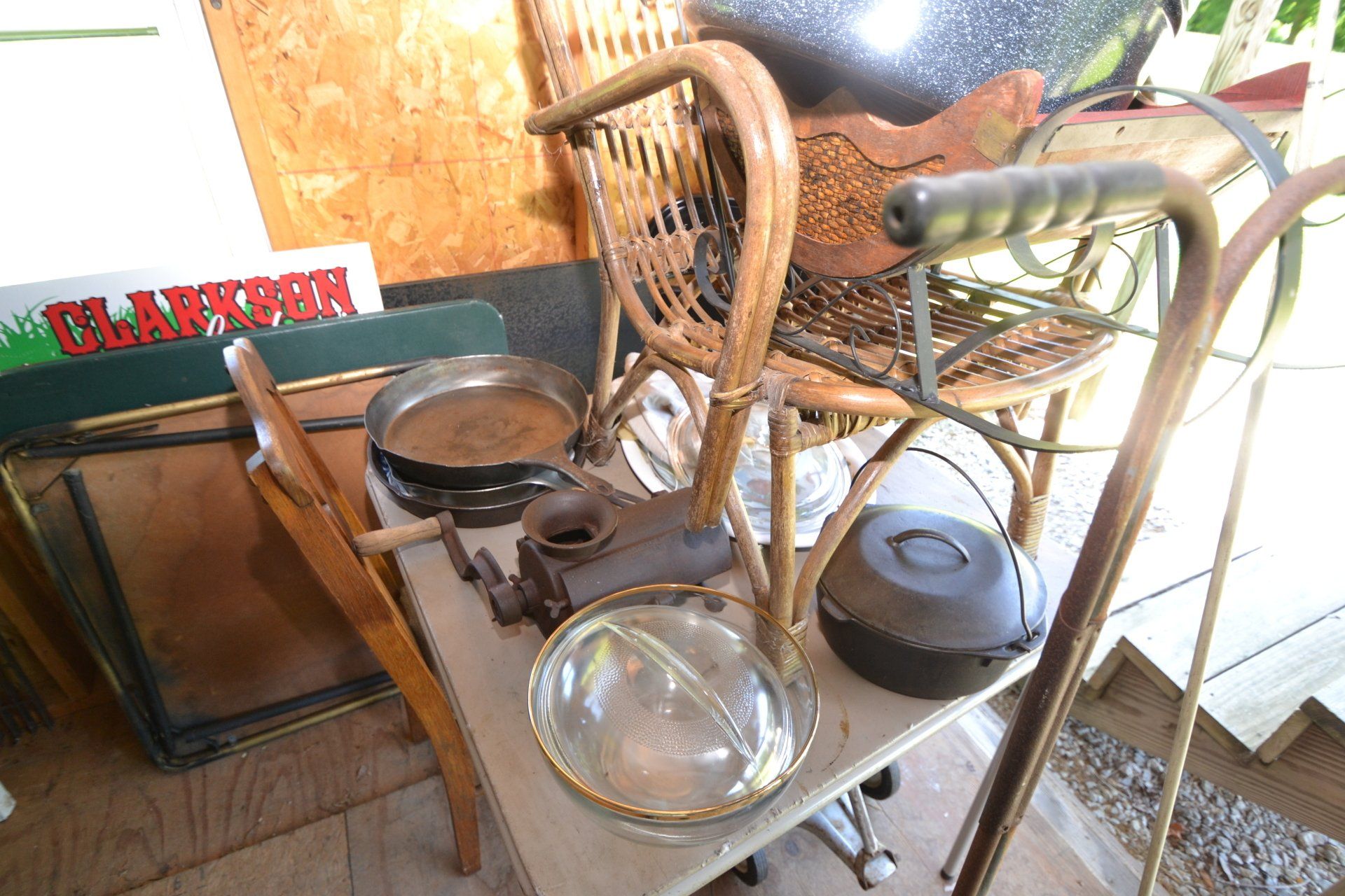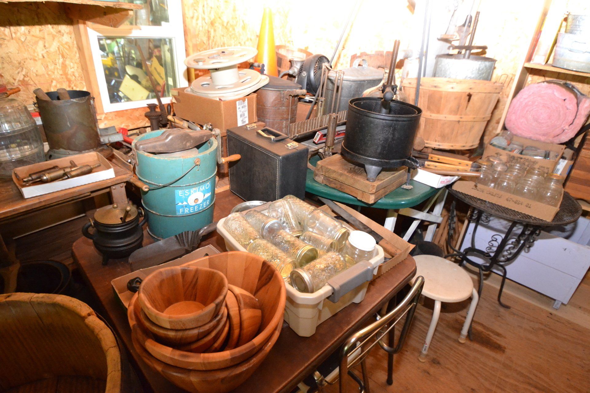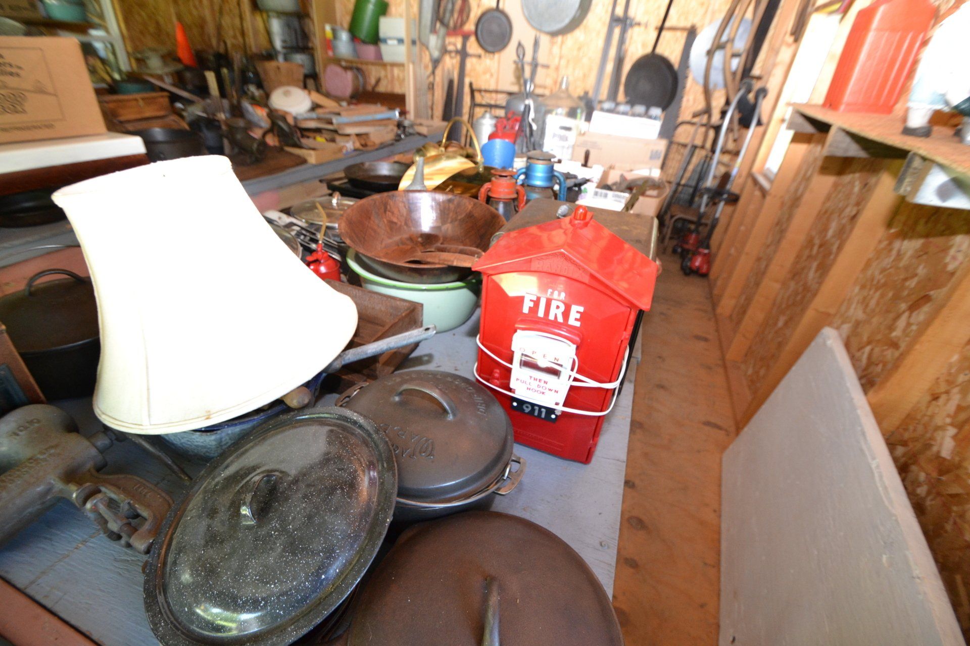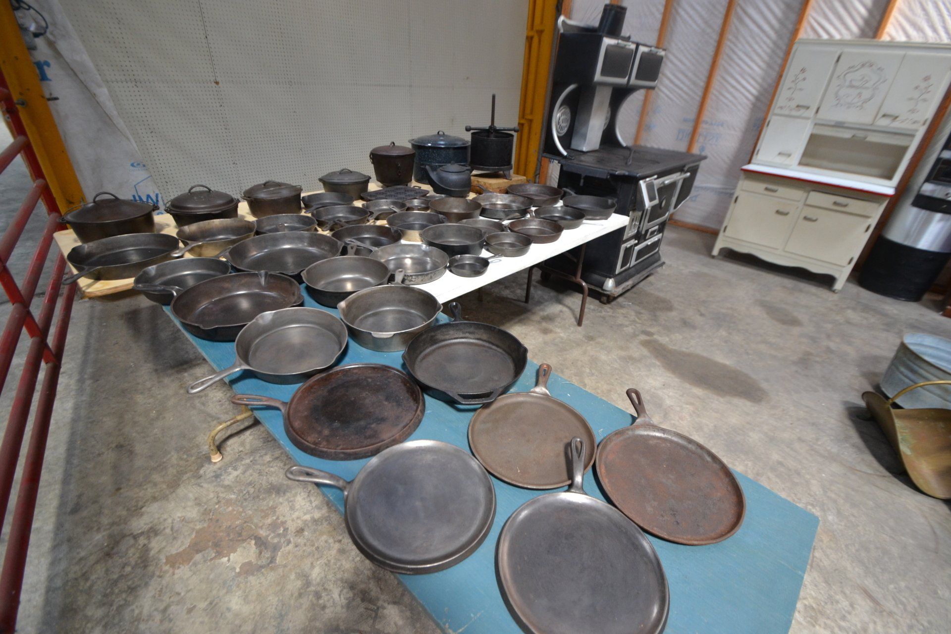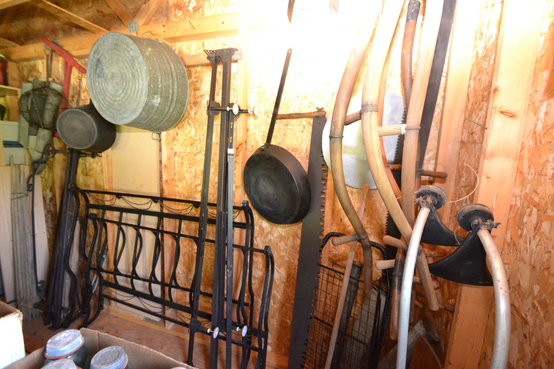Copper Clad H-series, wood burning kitchen range, complete, functional and very nice; Sceinch kitchen cabinet w/ flour bin and sifter; butchers block; several small cast iron kitchen and laundry stoves; 25 cent Aristocrat slot machine; dozens and dozens cast skillets, Griswold, Wagner, etc; cast iron pitcher pump; large cast iron pots; several lard presses; nice cream and milk cans; wash boilers; Gem cistern pump; very large cast iron pot with spider, lid and handle; Crosley style baby stroller; brass oil can; zinc top jars; Radio Flyer wagon; several old wagons; large selection of great older bikes in good condition; corn sheller; old step stool; old automotive equipment; reel type mower; crockery; lanterns; several park benches; child’s park bench; brass; porcelain; sleds; laundry tubs with base and ringer; meat cleavers; some really nice fishing poles; small pot-belly stove; cast tea pot; collection of churns- Daisy, hand cranks, tumbler, dasher styles; meat saws; bells; tins; bottle capper; tobacco hand setter; cross cut saws wheat scythes; buck saw; meat grinders; tobacco grinder; cast iron bean pots; bee smoker; boxes of knives; cigarette lighters; wash boards; Audiovox display with several vintage radios and speakers; Troy-Bilt pressure washer; Acetylene tanks, torches and cart; garden tools; hand tools; hitches; chain fall; jacks tool boxes; mini roto-tiller; bull float; much more!