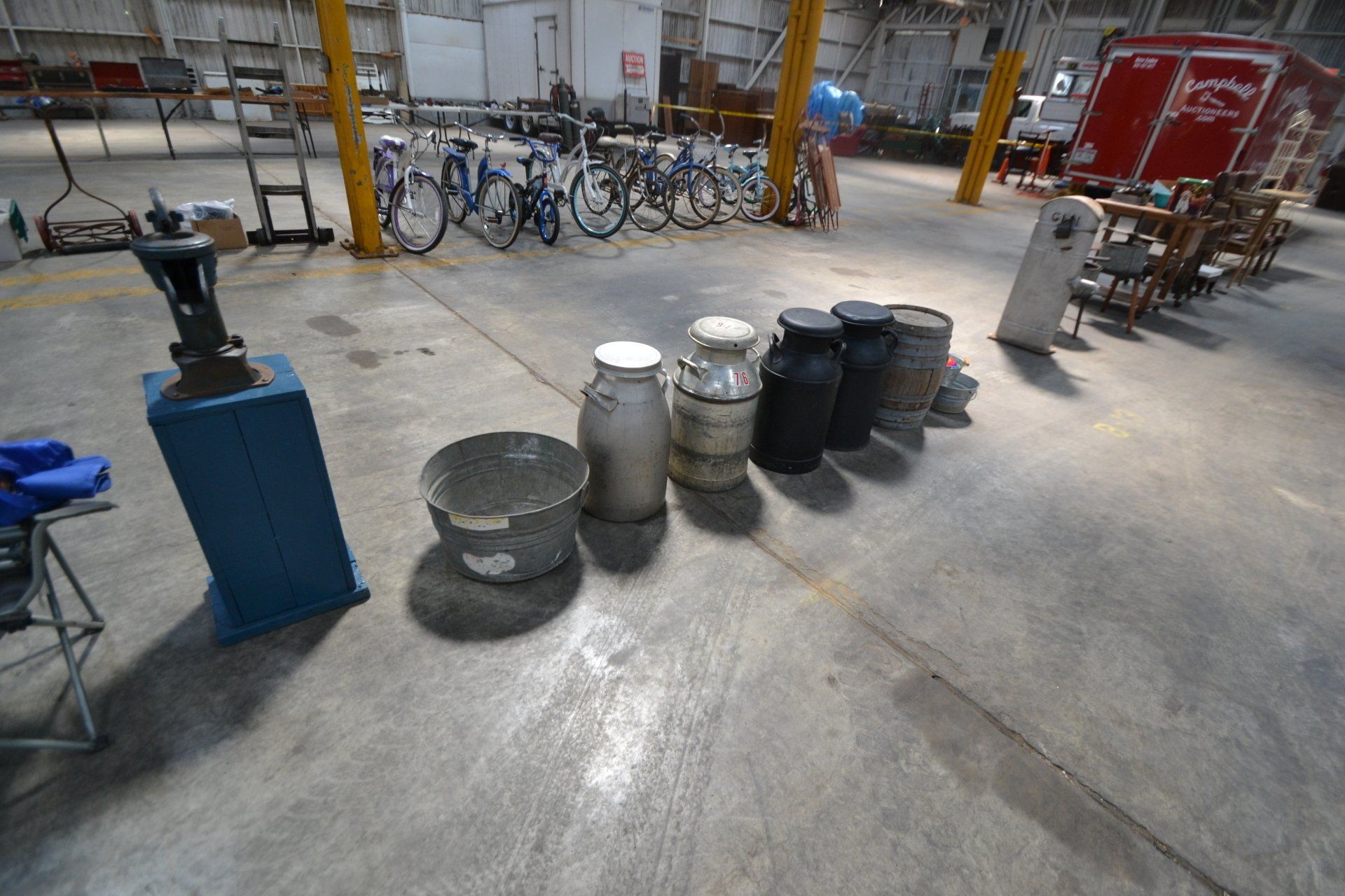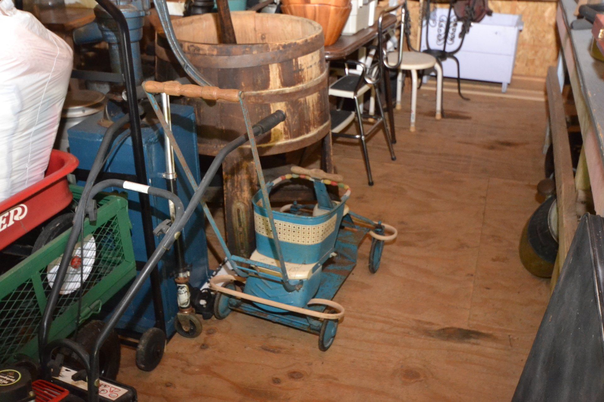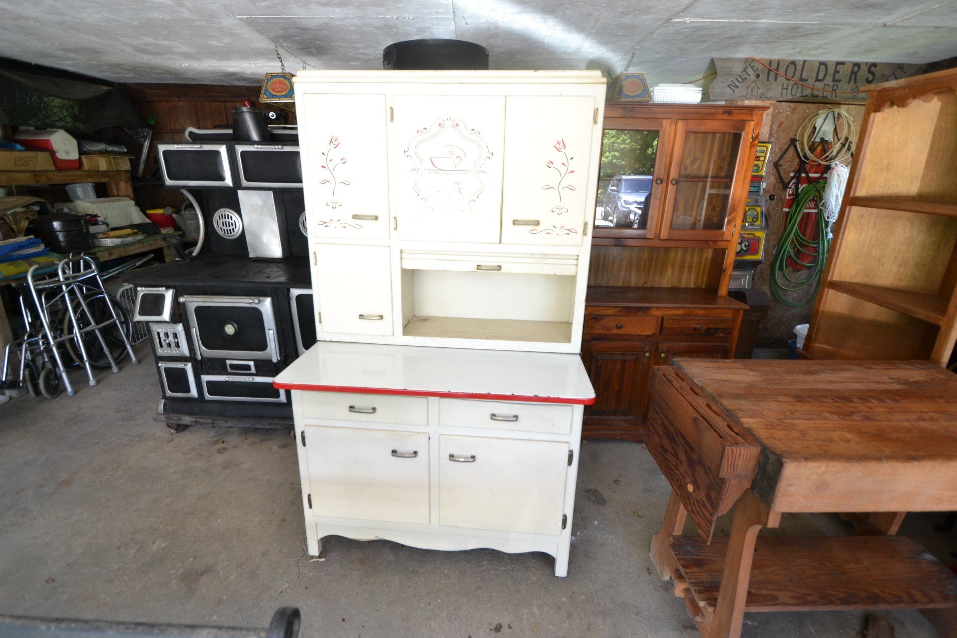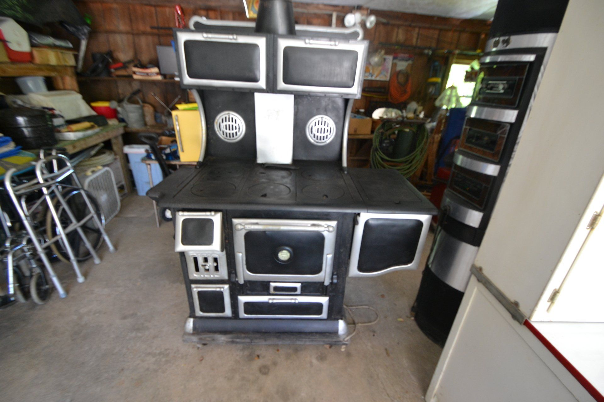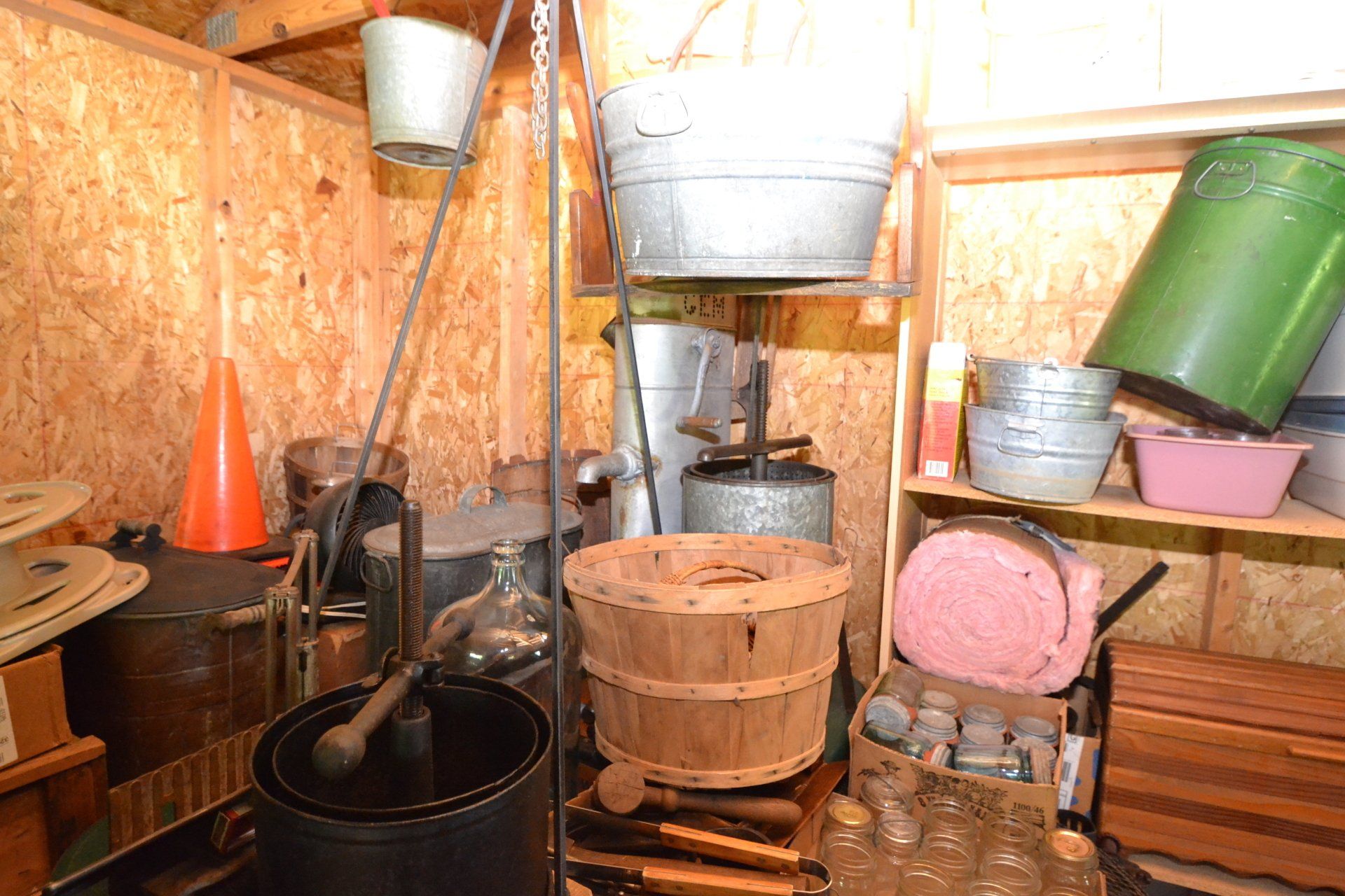 Copper Clad H-series, wood burning kitchen range, complete, functional and very nice; Sceinch kitchen cabinet w/ flour bin and sifter; butchers block; several small cast iron kitchen and laundry stoves; 25 cent Aristocrat slot machine; dozens and dozens cast skillets, Griswold, Wagner, etc; cast iron pitcher pump; large cast iron pots; several lard presses; nice cream and milk cans; wash boilers; Gem cistern pump; very large cast iron pot with spider, lid and handle; Crosley style baby stroller; brass oil can; zinc top jars; Radio Flyer wagon; several old wagons; large selection of great older bikes in good condition; corn sheller; old step stool; old automotive equipment; reel type mower; crockery; lanterns; several park benches; child’s park bench; brass; porcelain; sleds; laundry tubs with base and ringer; meat cleavers; some really nice fishing poles; small pot-belly stove; cast tea pot; collection of churns- Daisy, hand cranks, tumbler, dasher styles; meat saws; bells; tins; bottle capper; tobacco hand setter; cross cut saws wheat scythes; buck saw; meat grinders; tobacco grinder; cast iron bean pots; bee smoker; boxes of knives; cigarette lighters; wash boards; Audiovox display with several vintage radios and speakers; Troy-Bilt pressure washer; Acetylene tanks, torches and cart; garden tools; hand tools; hitches; chain fall; jacks tool boxes; mini roto-tiller; bull float; much more!