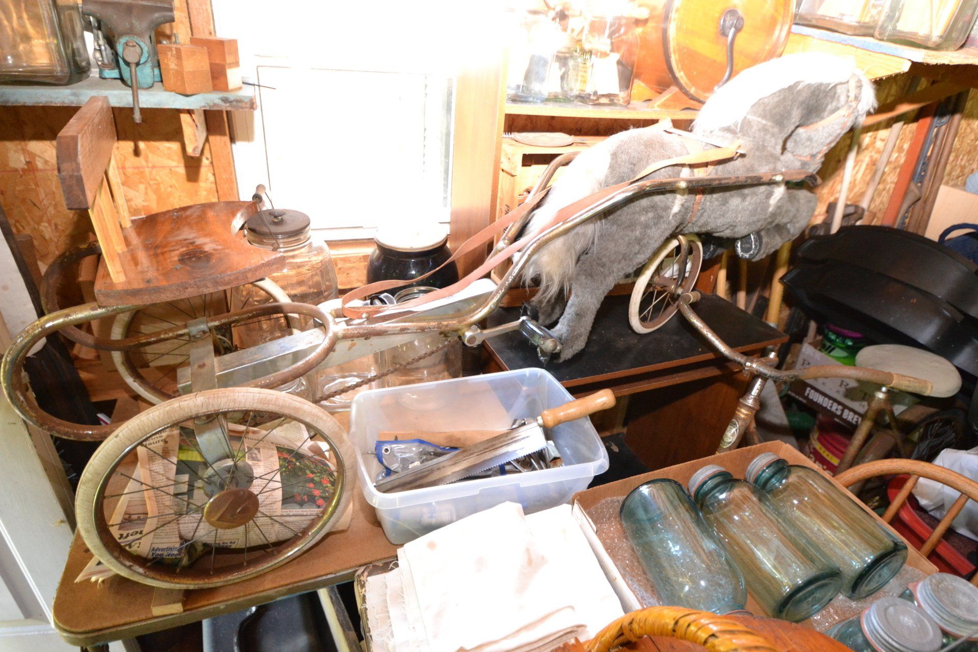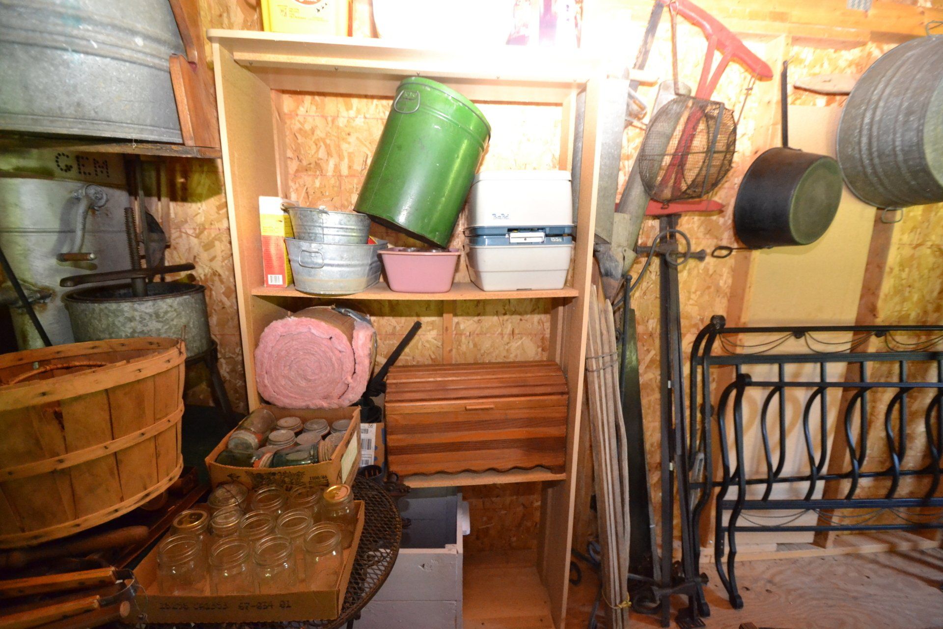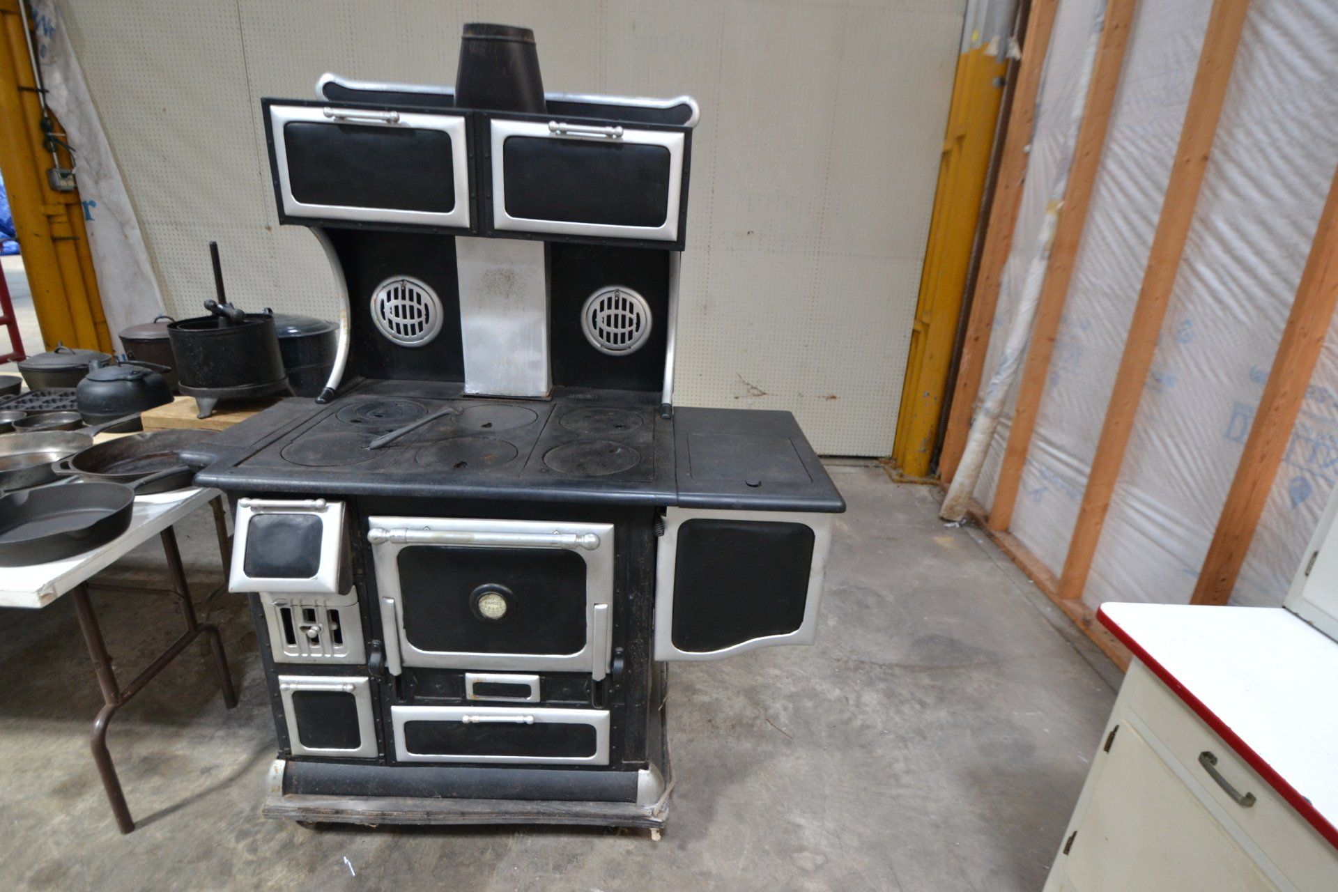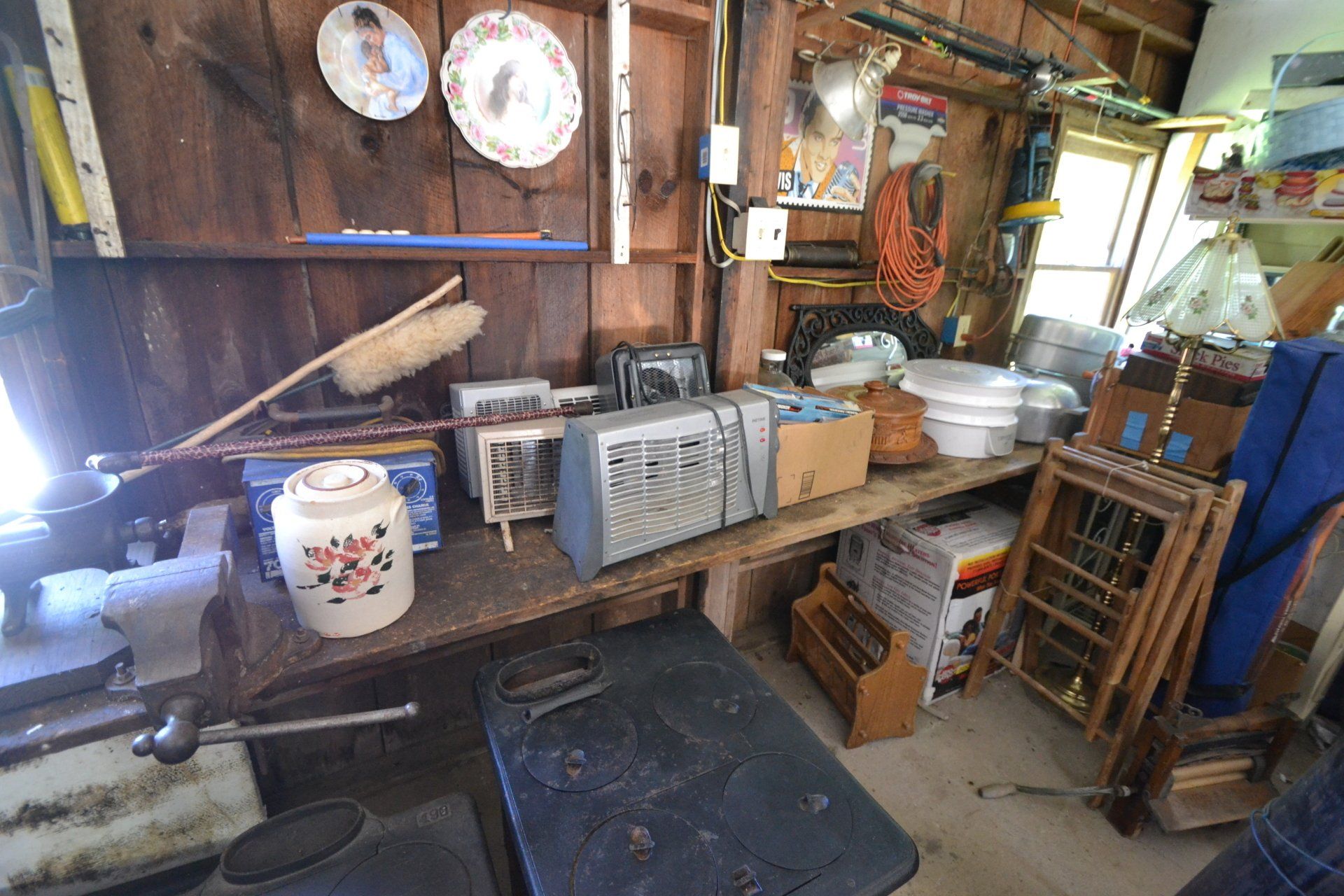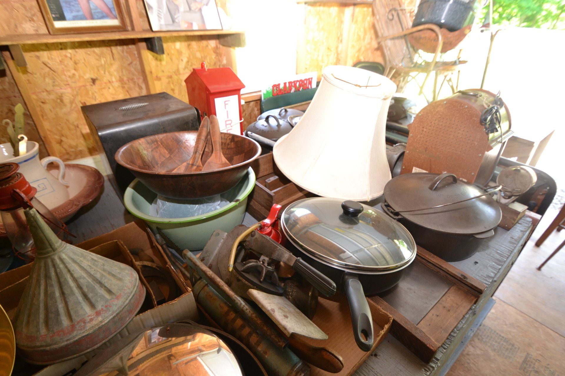 Copper Clad H-series, wood burning kitchen range, complete, functional and very nice; Sceinch kitchen cabinet w/ flour bin and sifter; butchers block; several small cast iron kitchen and laundry stoves; 25 cent Aristocrat slot machine; dozens and dozens cast skillets, Griswold, Wagner, etc; cast iron pitcher pump; large cast iron pots; several lard presses; nice cream and milk cans; wash boilers; Gem cistern pump; very large cast iron pot with spider, lid and handle; Crosley style baby stroller; brass oil can; zinc top jars; Radio Flyer wagon; several old wagons; large selection of great older bikes in good condition; corn sheller; old step stool; old automotive equipment; reel type mower; crockery; lanterns; several park benches; child’s park bench; brass; porcelain; sleds; laundry tubs with base and ringer; meat cleavers; some really nice fishing poles; small pot-belly stove; cast tea pot; collection of churns- Daisy, hand cranks, tumbler, dasher styles; meat saws; bells; tins; bottle capper; tobacco hand setter; cross cut saws wheat scythes; buck saw; meat grinders; tobacco grinder; cast iron bean pots; bee smoker; boxes of knives; cigarette lighters; wash boards; Audiovox display with several vintage radios and speakers; Troy-Bilt pressure washer; Acetylene tanks, torches and cart; garden tools; hand tools; hitches; chain fall; jacks tool boxes; mini roto-tiller; bull float; much more!