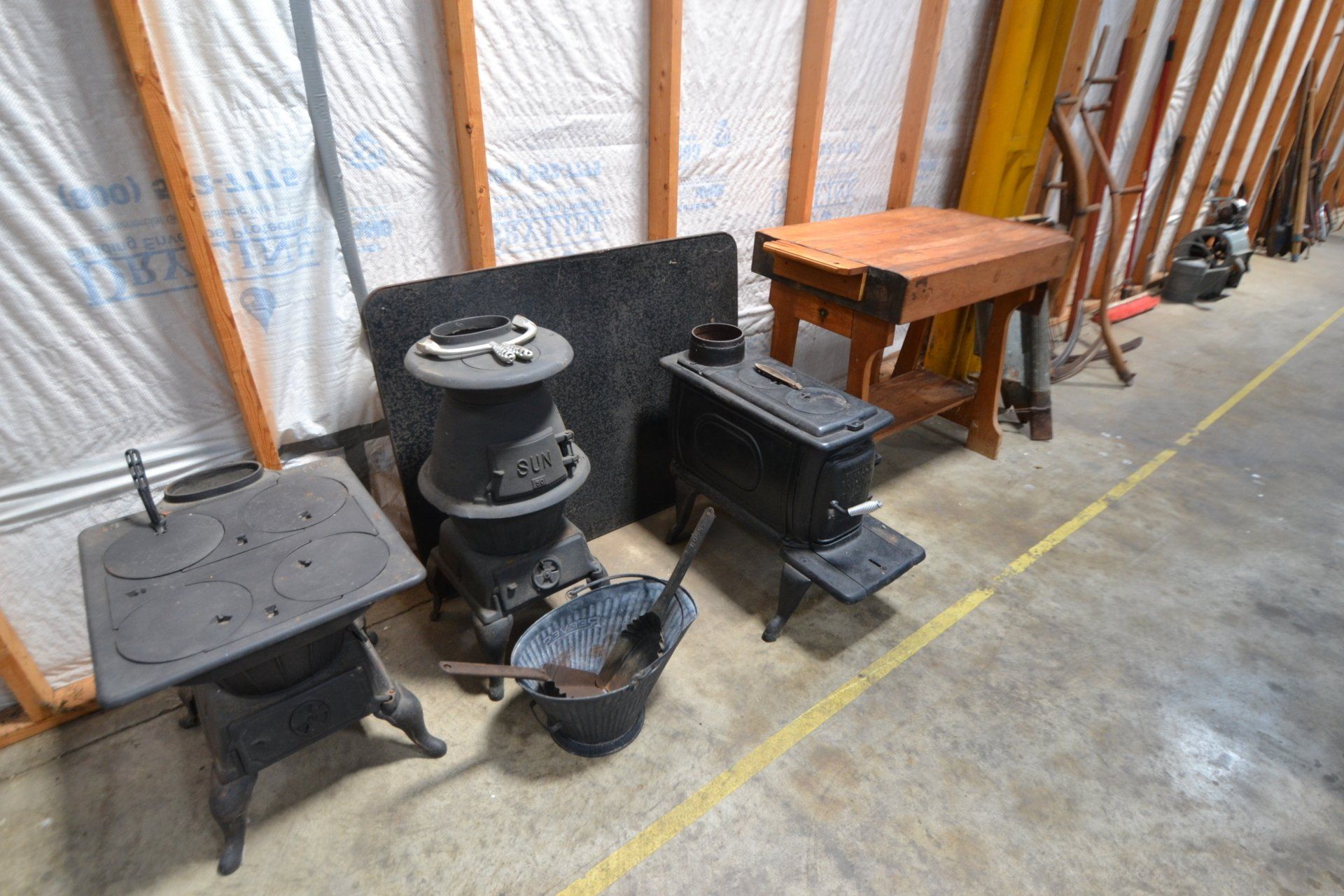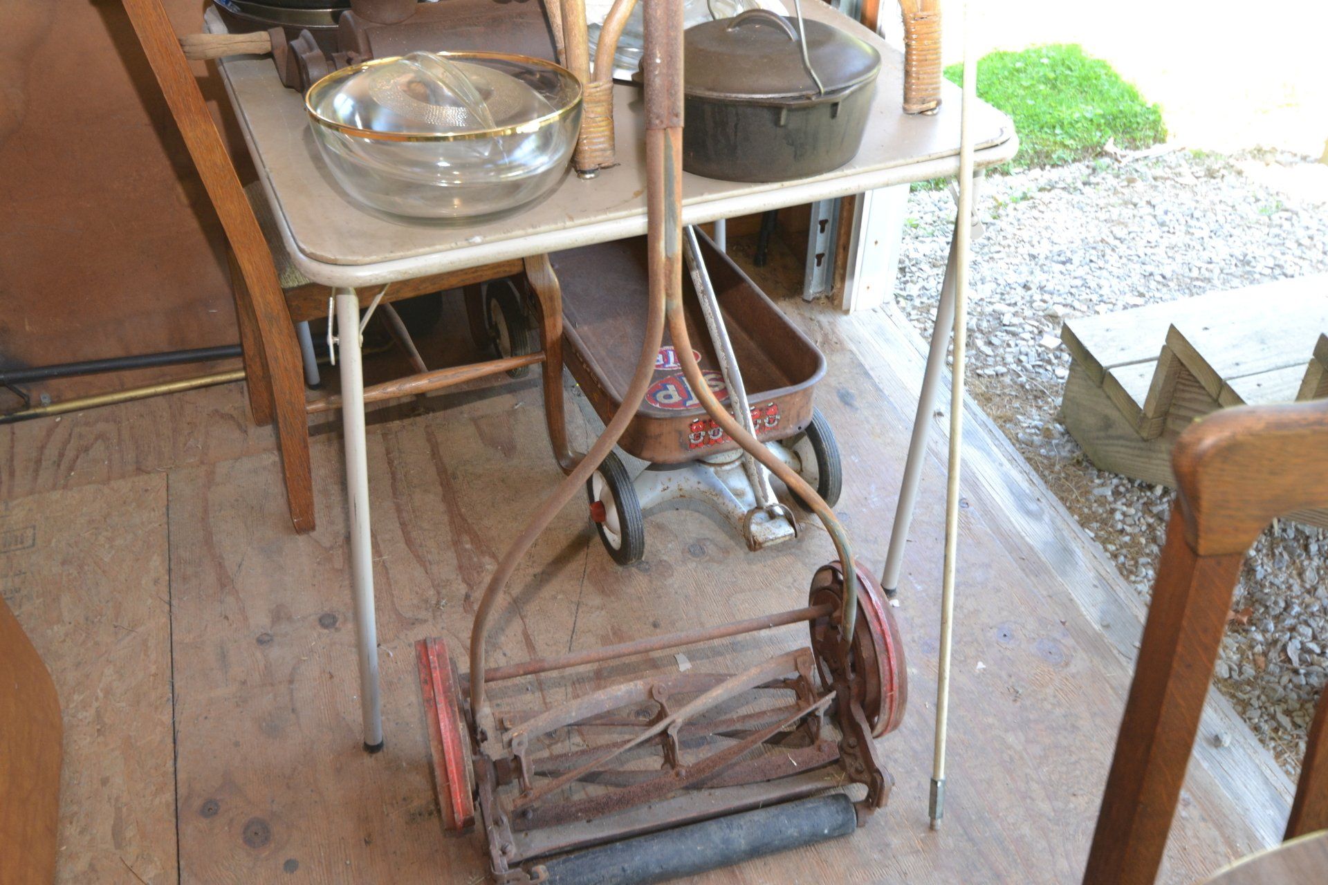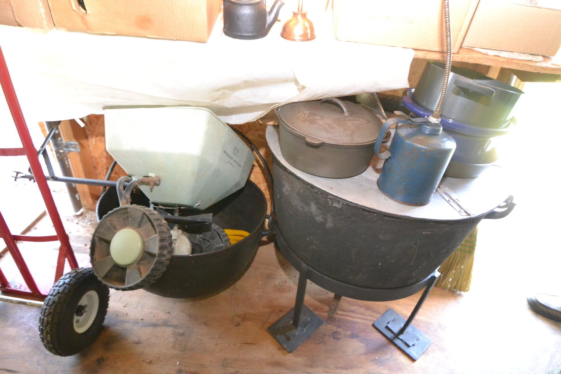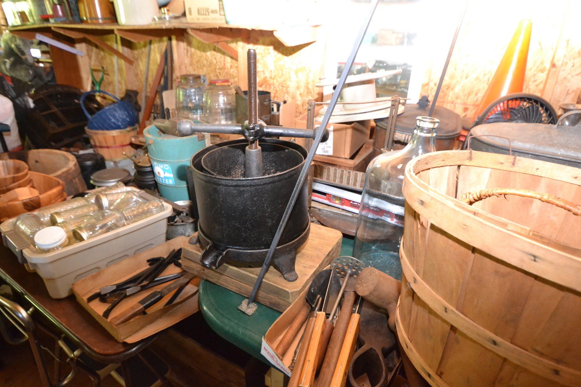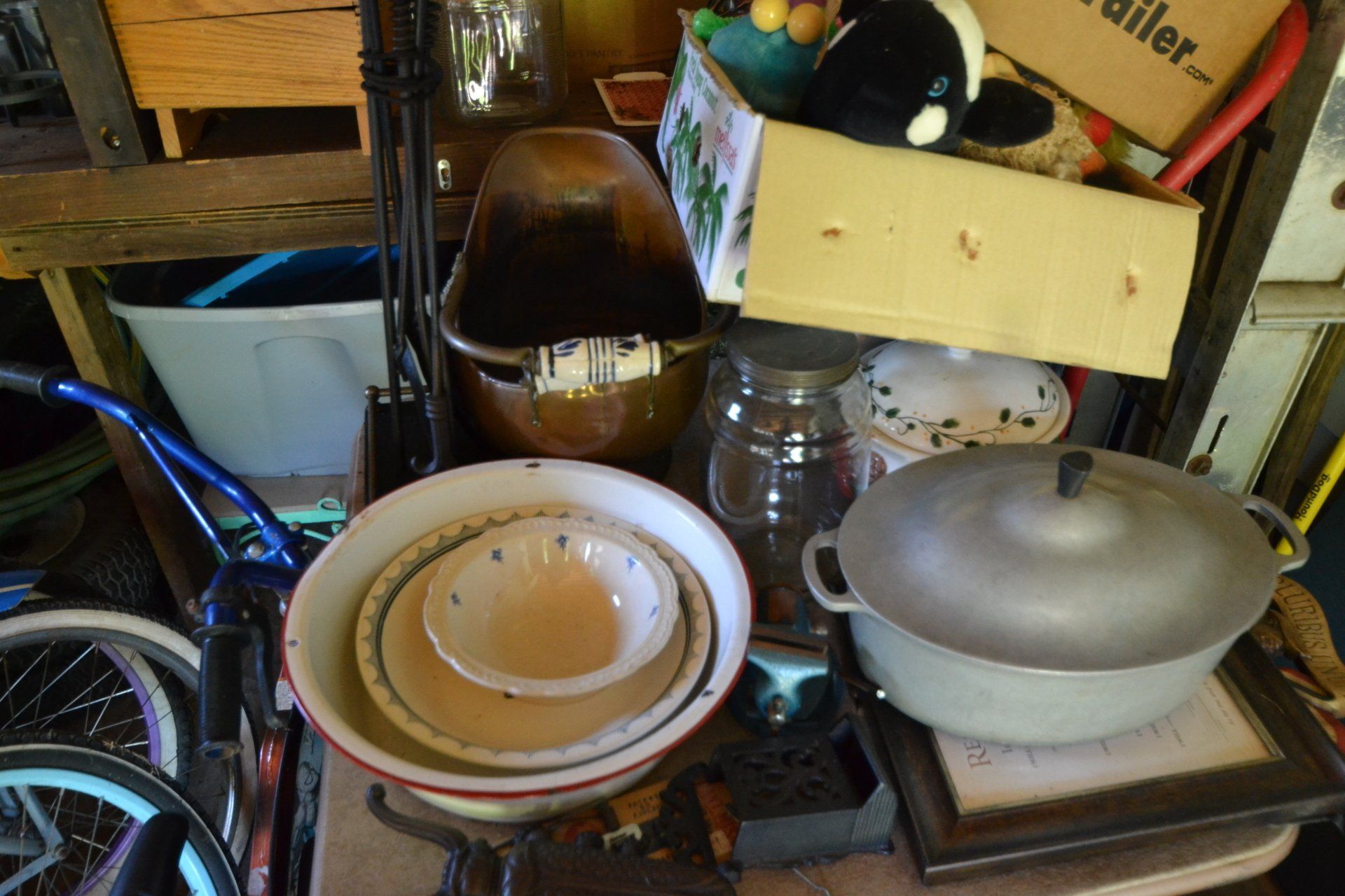 Copper Clad H-series, wood burning kitchen range, complete, functional and very nice; Sceinch kitchen cabinet w/ flour bin and sifter; butchers block; several small cast iron kitchen and laundry stoves; 25 cent Aristocrat slot machine; dozens and dozens cast skillets, Griswold, Wagner, etc; cast iron pitcher pump; large cast iron pots; several lard presses; nice cream and milk cans; wash boilers; Gem cistern pump; very large cast iron pot with spider, lid and handle; Crosley style baby stroller; brass oil can; zinc top jars; Radio Flyer wagon; several old wagons; large selection of great older bikes in good condition; corn sheller; old step stool; old automotive equipment; reel type mower; crockery; lanterns; several park benches; child’s park bench; brass; porcelain; sleds; laundry tubs with base and ringer; meat cleavers; some really nice fishing poles; small pot-belly stove; cast tea pot; collection of churns- Daisy, hand cranks, tumbler, dasher styles; meat saws; bells; tins; bottle capper; tobacco hand setter; cross cut saws wheat scythes; buck saw; meat grinders; tobacco grinder; cast iron bean pots; bee smoker; boxes of knives; cigarette lighters; wash boards; Audiovox display with several vintage radios and speakers; Troy-Bilt pressure washer; Acetylene tanks, torches and cart; garden tools; hand tools; hitches; chain fall; jacks tool boxes; mini roto-tiller; bull float; much more!