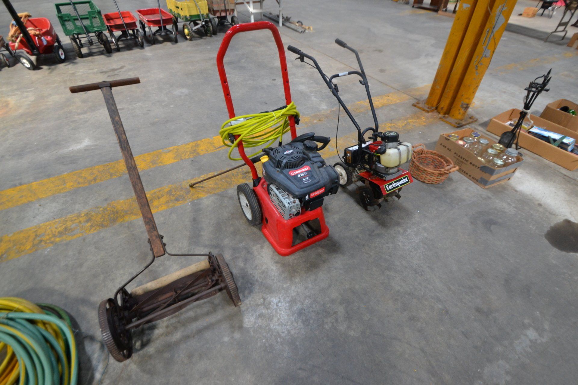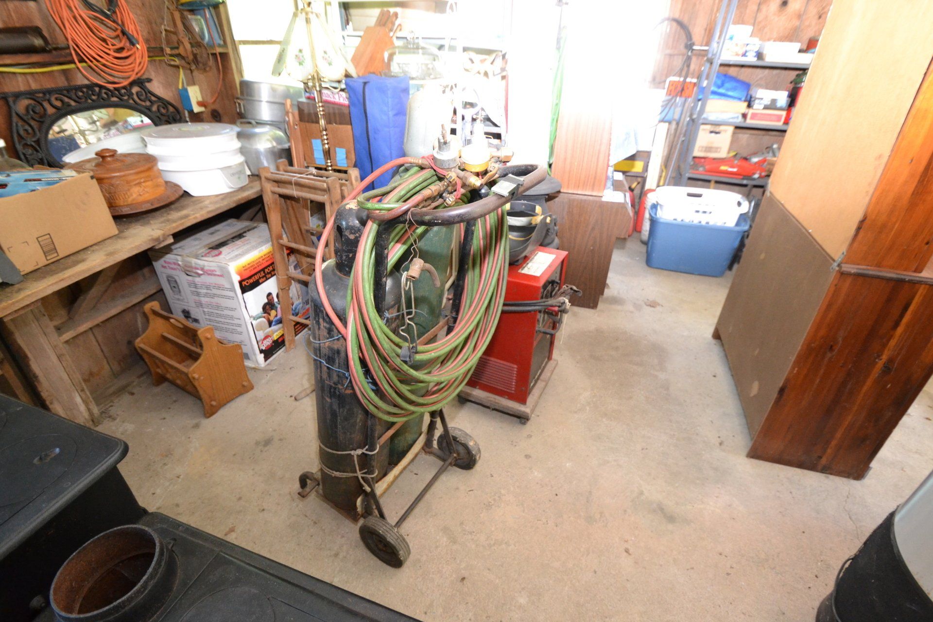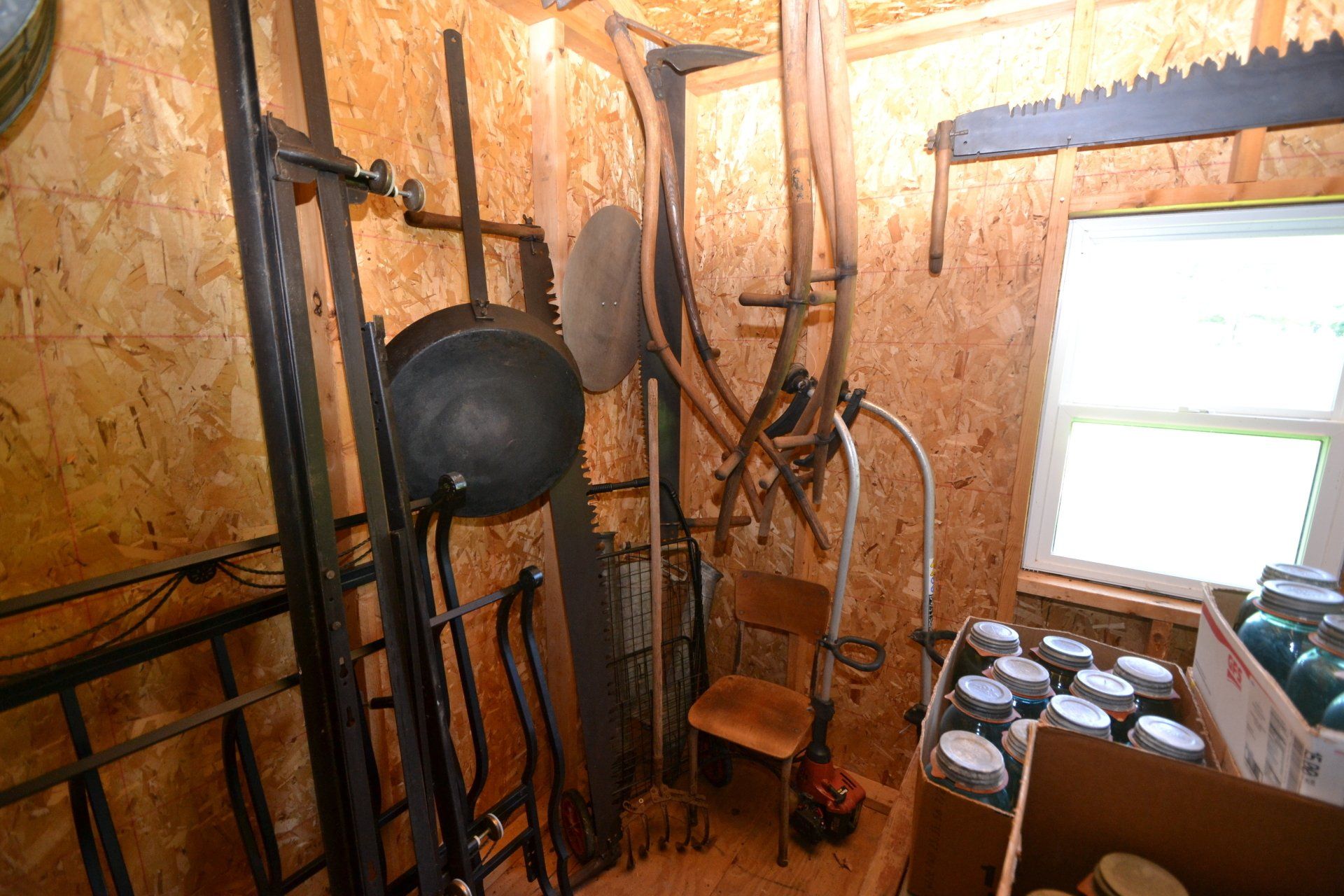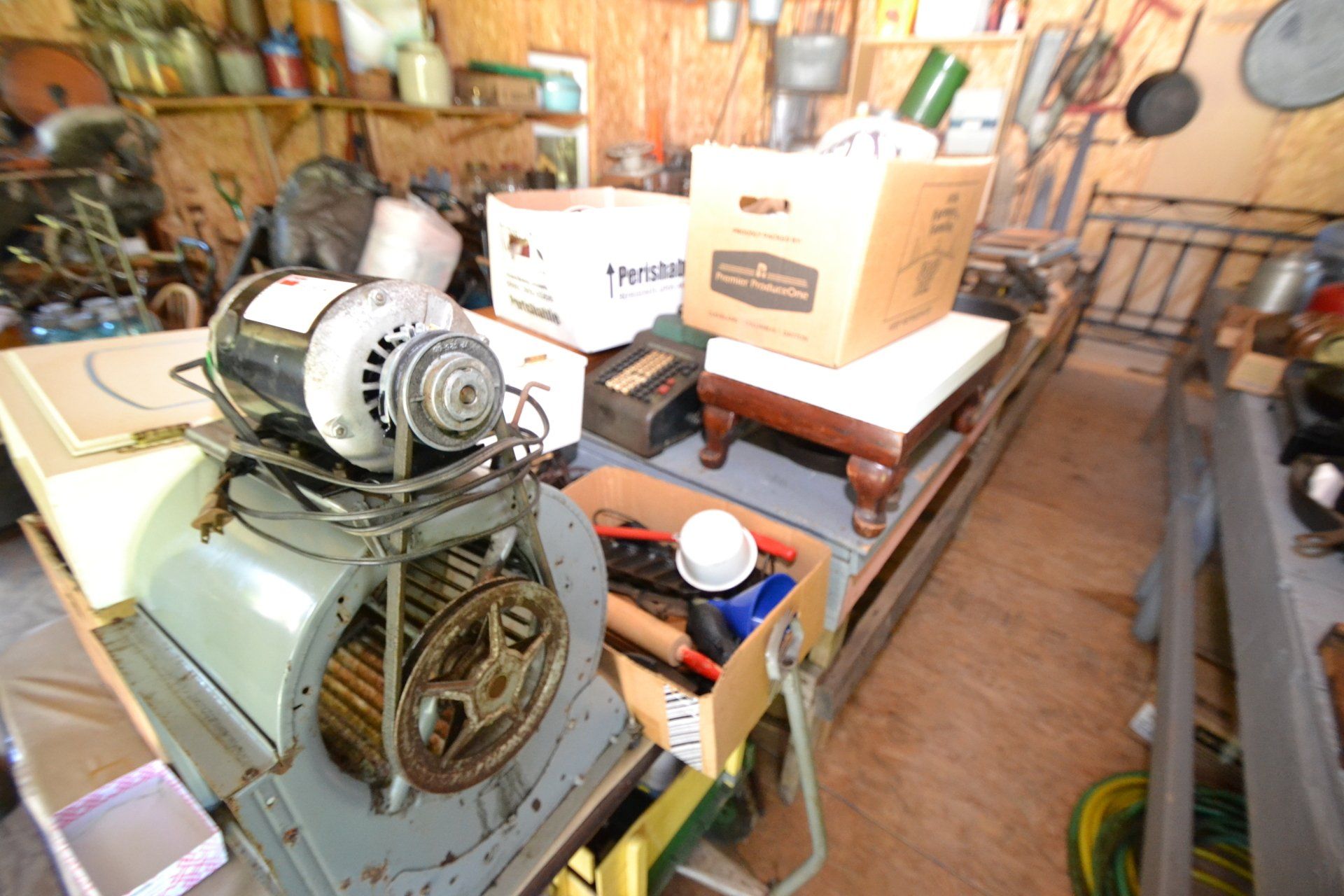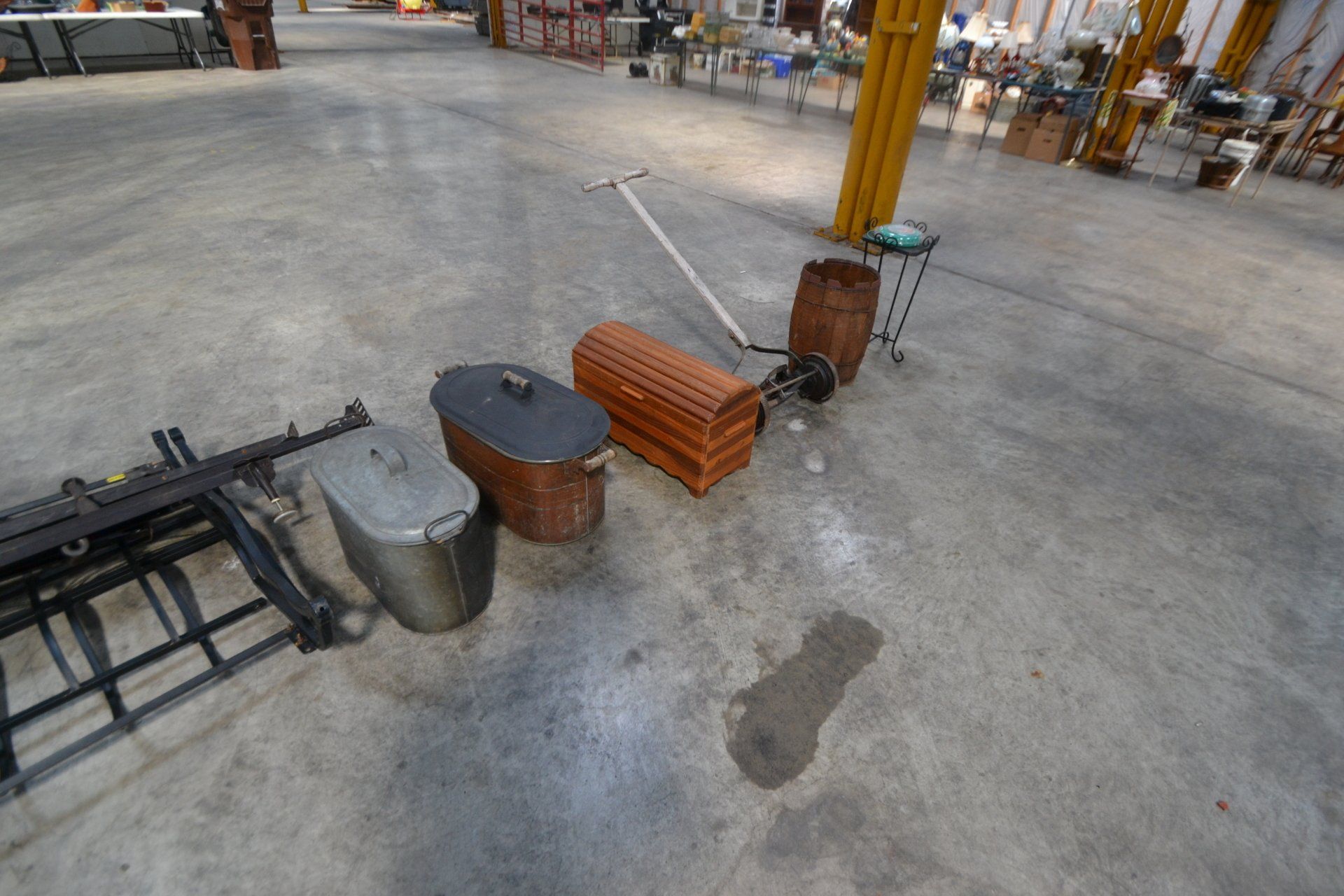 Copper Clad H-series, wood burning kitchen range, complete, functional and very nice; Sceinch kitchen cabinet w/ flour bin and sifter; butchers block; several small cast iron kitchen and laundry stoves; 25 cent Aristocrat slot machine; dozens and dozens cast skillets, Griswold, Wagner, etc; cast iron pitcher pump; large cast iron pots; several lard presses; nice cream and milk cans; wash boilers; Gem cistern pump; very large cast iron pot with spider, lid and handle; Crosley style baby stroller; brass oil can; zinc top jars; Radio Flyer wagon; several old wagons; large selection of great older bikes in good condition; corn sheller; old step stool; old automotive equipment; reel type mower; crockery; lanterns; several park benches; child’s park bench; brass; porcelain; sleds; laundry tubs with base and ringer; meat cleavers; some really nice fishing poles; small pot-belly stove; cast tea pot; collection of churns- Daisy, hand cranks, tumbler, dasher styles; meat saws; bells; tins; bottle capper; tobacco hand setter; cross cut saws wheat scythes; buck saw; meat grinders; tobacco grinder; cast iron bean pots; bee smoker; boxes of knives; cigarette lighters; wash boards; Audiovox display with several vintage radios and speakers; Troy-Bilt pressure washer; Acetylene tanks, torches and cart; garden tools; hand tools; hitches; chain fall; jacks tool boxes; mini roto-tiller; bull float; much more!