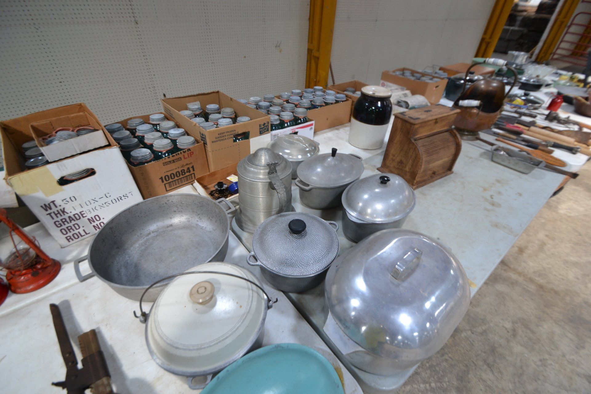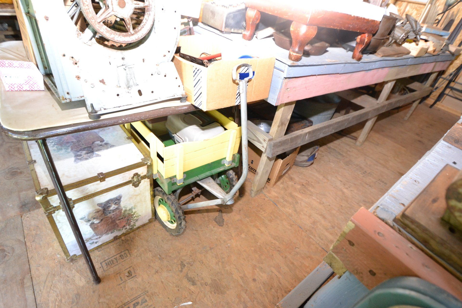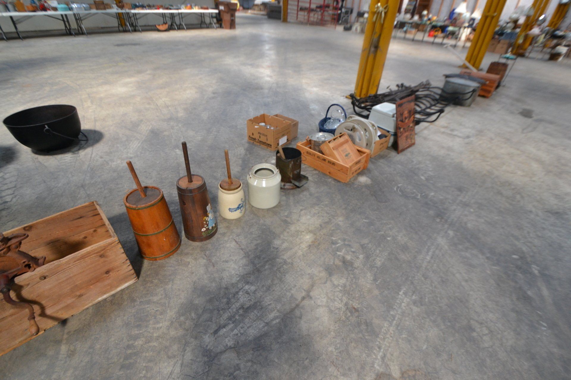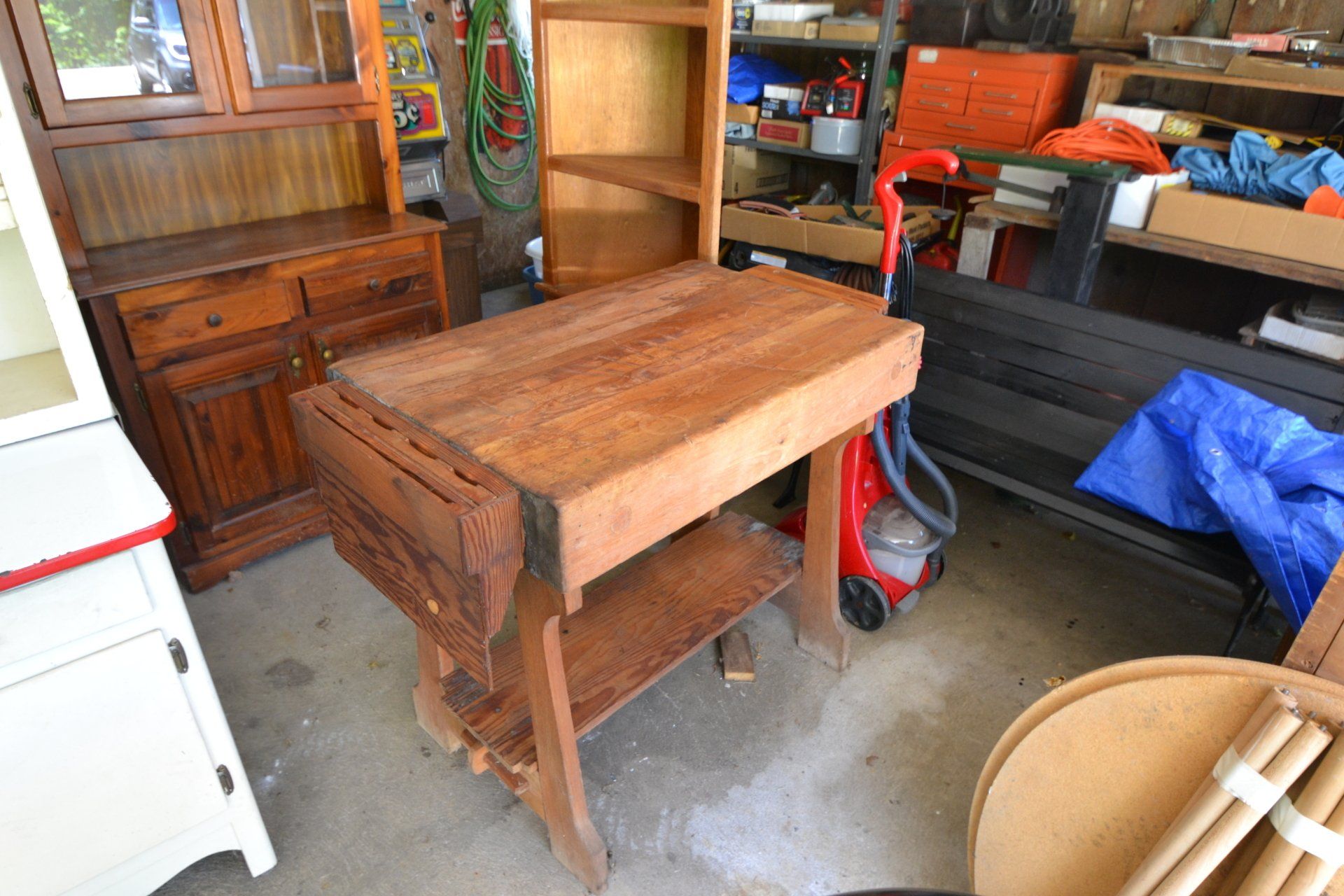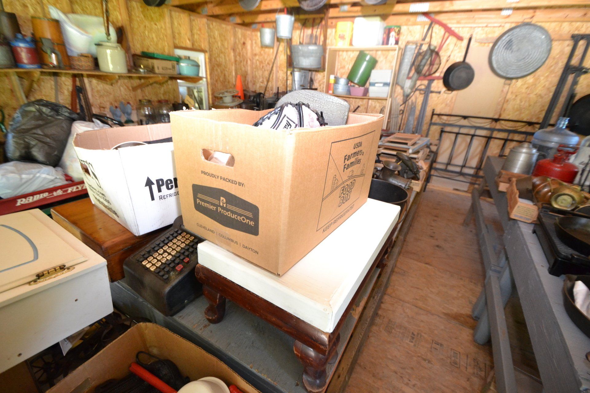 Copper Clad H-series, wood burning kitchen range, complete, functional and very nice; Sceinch kitchen cabinet w/ flour bin and sifter; butchers block; several small cast iron kitchen and laundry stoves; 25 cent Aristocrat slot machine; dozens and dozens cast skillets, Griswold, Wagner, etc; cast iron pitcher pump; large cast iron pots; several lard presses; nice cream and milk cans; wash boilers; Gem cistern pump; very large cast iron pot with spider, lid and handle; Crosley style baby stroller; brass oil can; zinc top jars; Radio Flyer wagon; several old wagons; large selection of great older bikes in good condition; corn sheller; old step stool; old automotive equipment; reel type mower; crockery; lanterns; several park benches; child’s park bench; brass; porcelain; sleds; laundry tubs with base and ringer; meat cleavers; some really nice fishing poles; small pot-belly stove; cast tea pot; collection of churns- Daisy, hand cranks, tumbler, dasher styles; meat saws; bells; tins; bottle capper; tobacco hand setter; cross cut saws wheat scythes; buck saw; meat grinders; tobacco grinder; cast iron bean pots; bee smoker; boxes of knives; cigarette lighters; wash boards; Audiovox display with several vintage radios and speakers; Troy-Bilt pressure washer; Acetylene tanks, torches and cart; garden tools; hand tools; hitches; chain fall; jacks tool boxes; mini roto-tiller; bull float; much more!