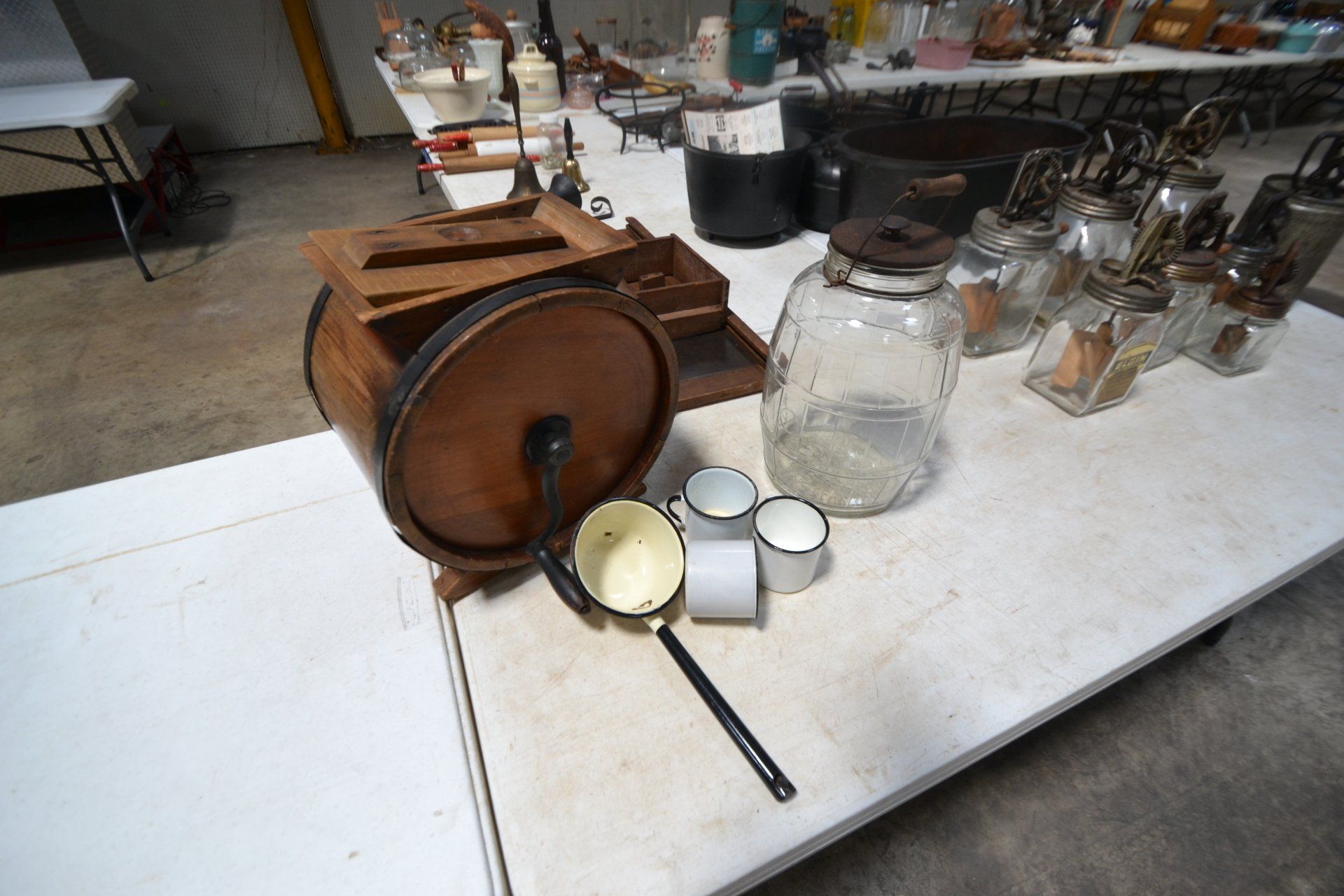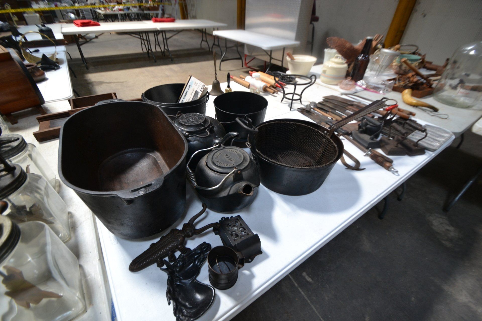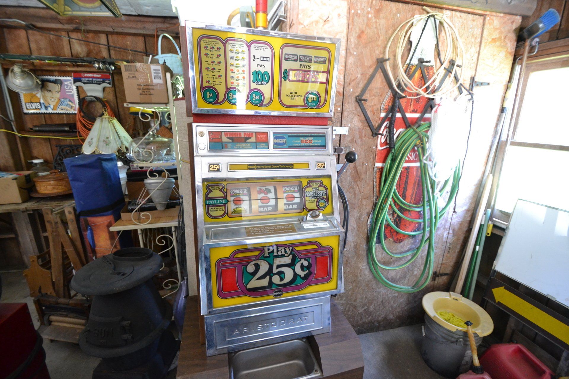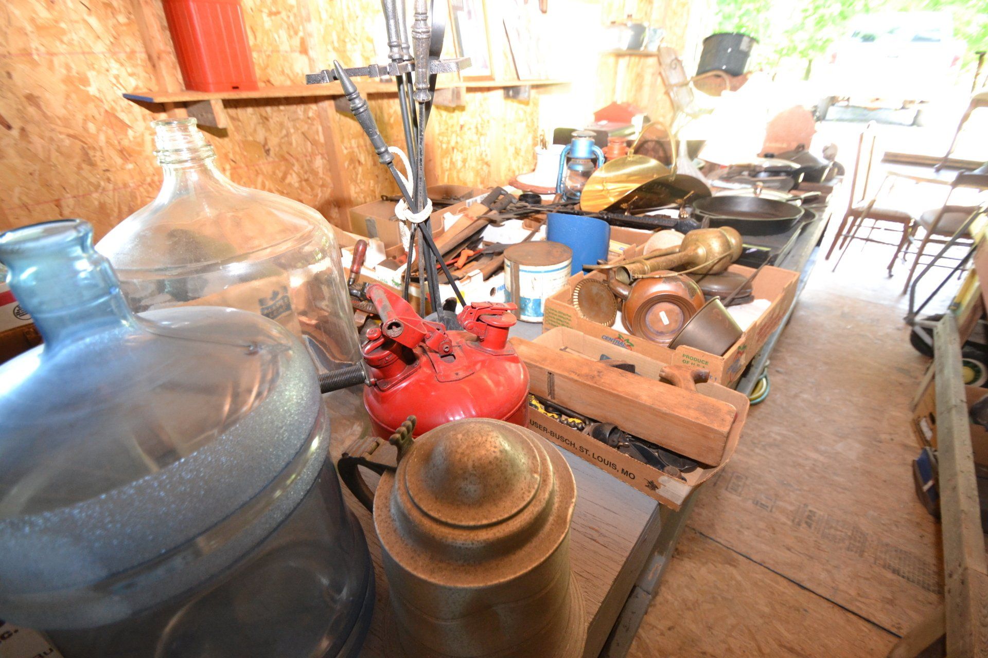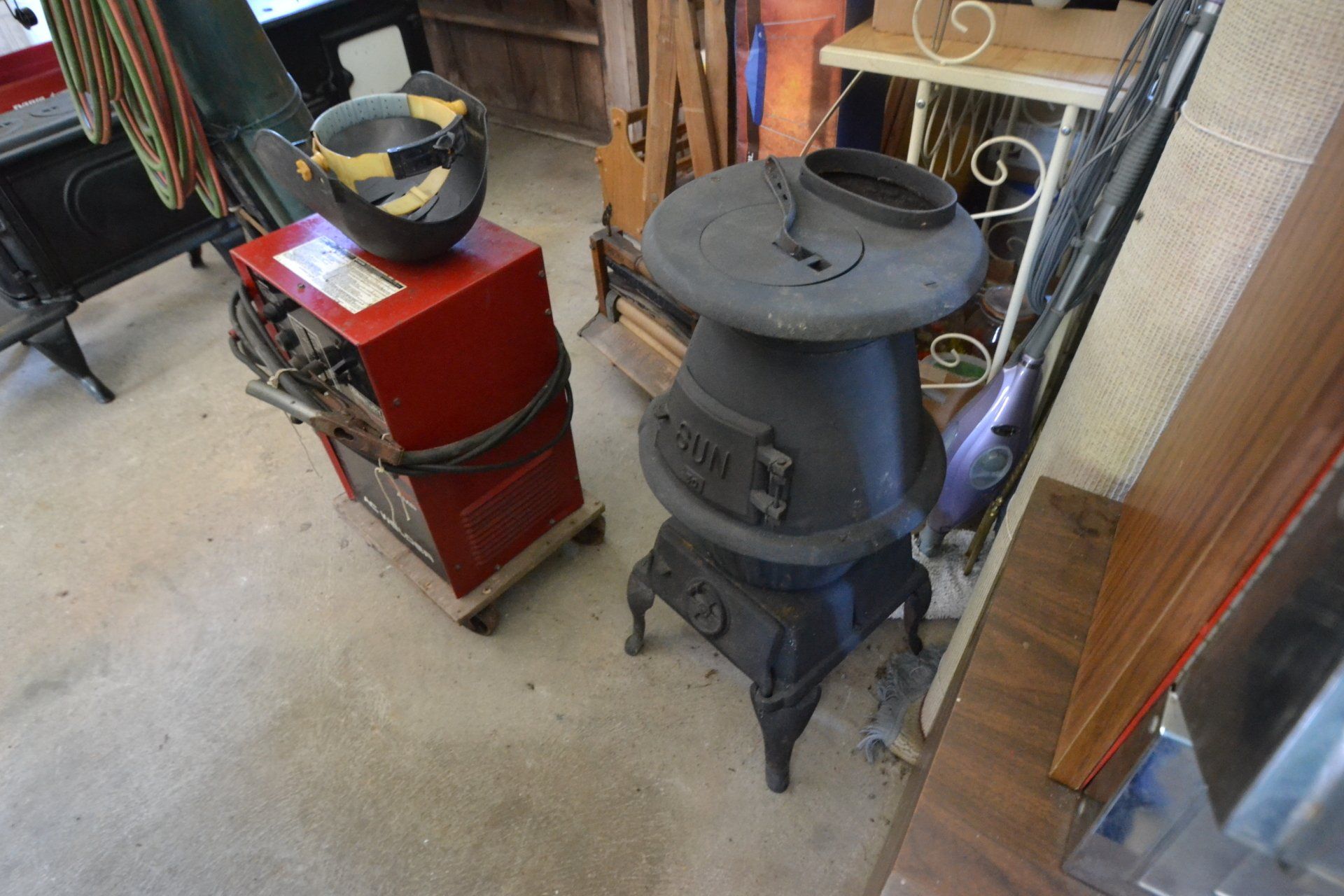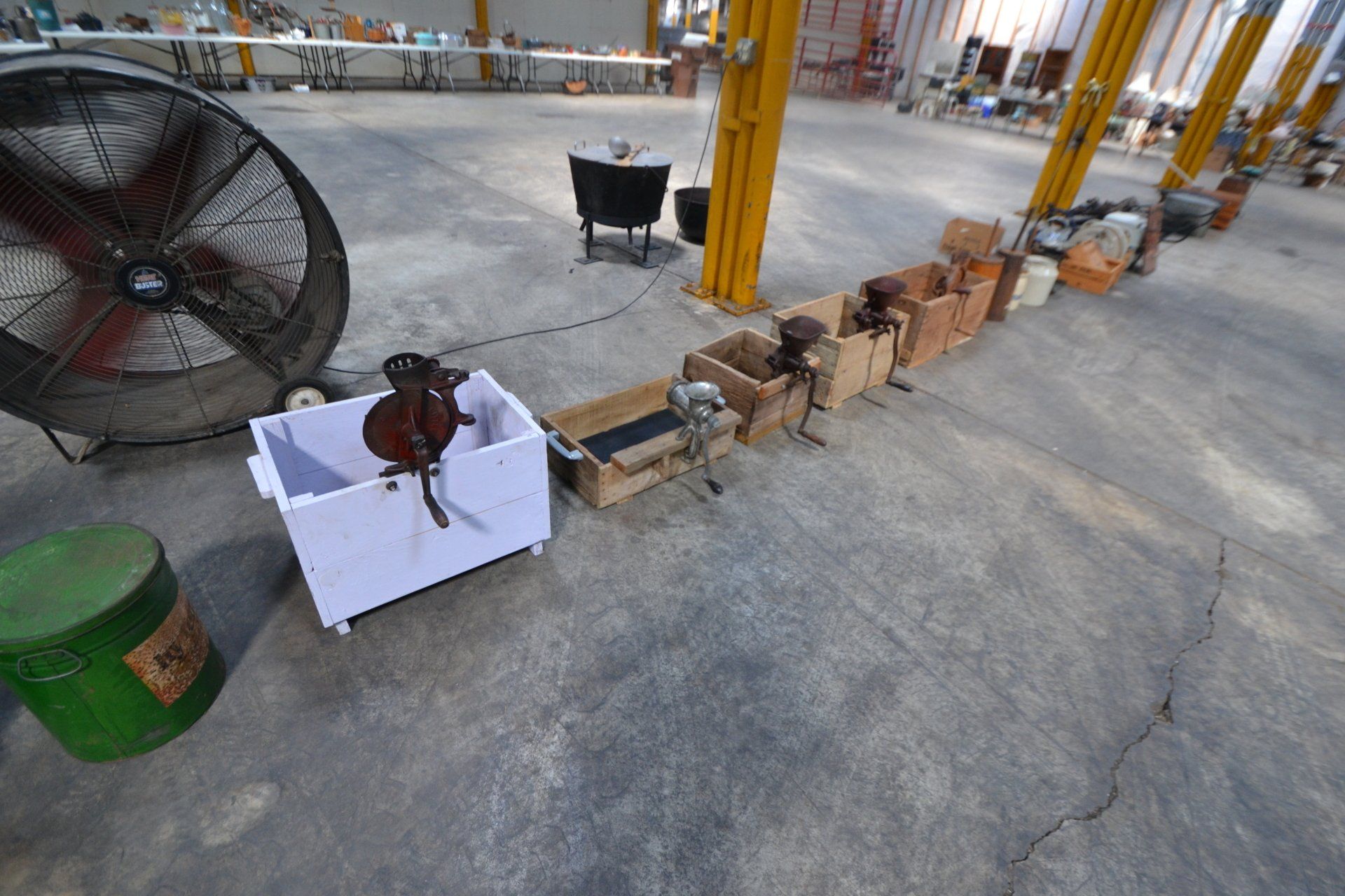 Copper Clad H-series, wood burning kitchen range, complete, functional and very nice; Sceinch kitchen cabinet w/ flour bin and sifter; butchers block; several small cast iron kitchen and laundry stoves; 25 cent Aristocrat slot machine; dozens and dozens cast skillets, Griswold, Wagner, etc; cast iron pitcher pump; large cast iron pots; several lard presses; nice cream and milk cans; wash boilers; Gem cistern pump; very large cast iron pot with spider, lid and handle; Crosley style baby stroller; brass oil can; zinc top jars; Radio Flyer wagon; several old wagons; large selection of great older bikes in good condition; corn sheller; old step stool; old automotive equipment; reel type mower; crockery; lanterns; several park benches; child’s park bench; brass; porcelain; sleds; laundry tubs with base and ringer; meat cleavers; some really nice fishing poles; small pot-belly stove; cast tea pot; collection of churns- Daisy, hand cranks, tumbler, dasher styles; meat saws; bells; tins; bottle capper; tobacco hand setter; cross cut saws wheat scythes; buck saw; meat grinders; tobacco grinder; cast iron bean pots; bee smoker; boxes of knives; cigarette lighters; wash boards; Audiovox display with several vintage radios and speakers; Troy-Bilt pressure washer; Acetylene tanks, torches and cart; garden tools; hand tools; hitches; chain fall; jacks tool boxes; mini roto-tiller; bull float; much more!