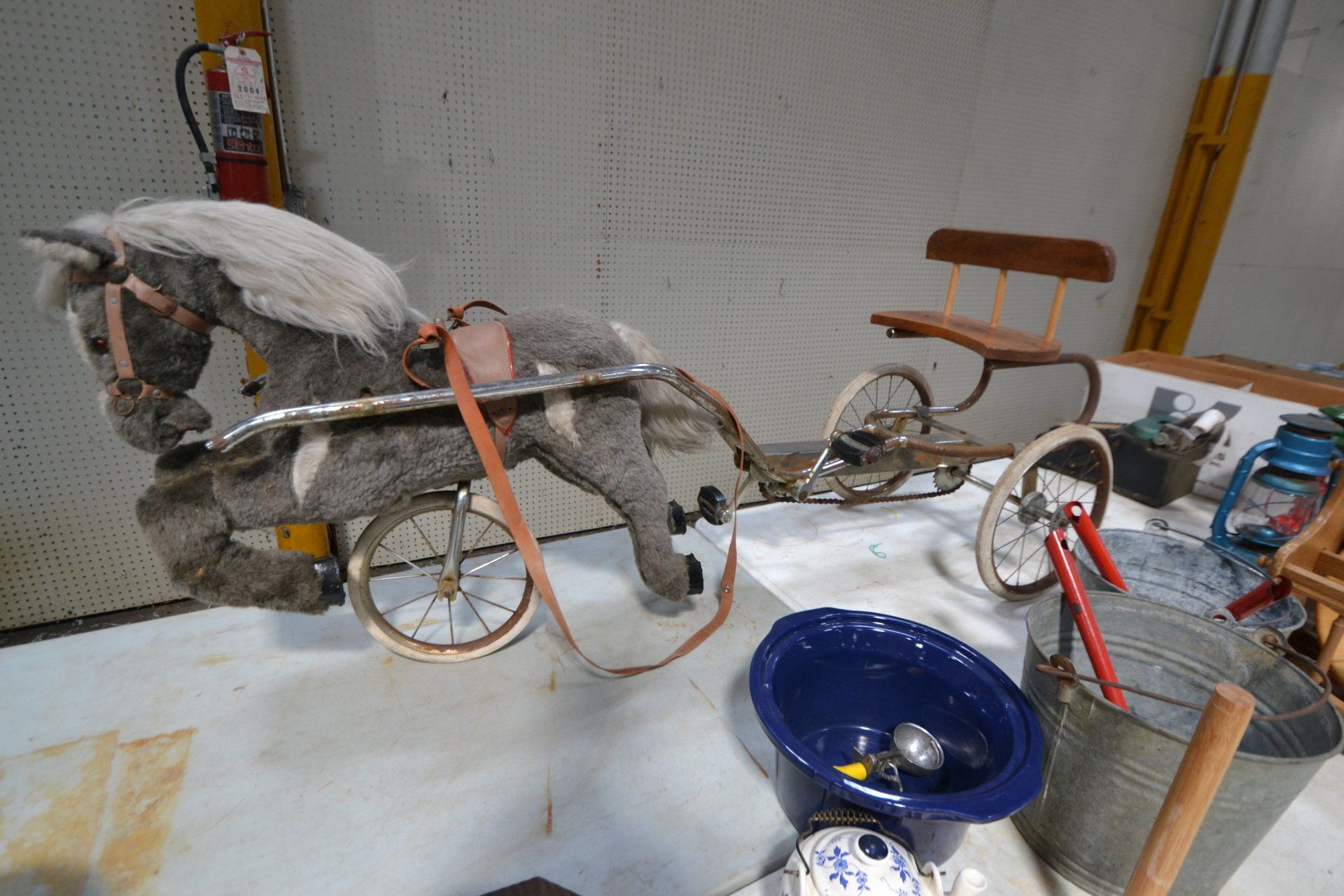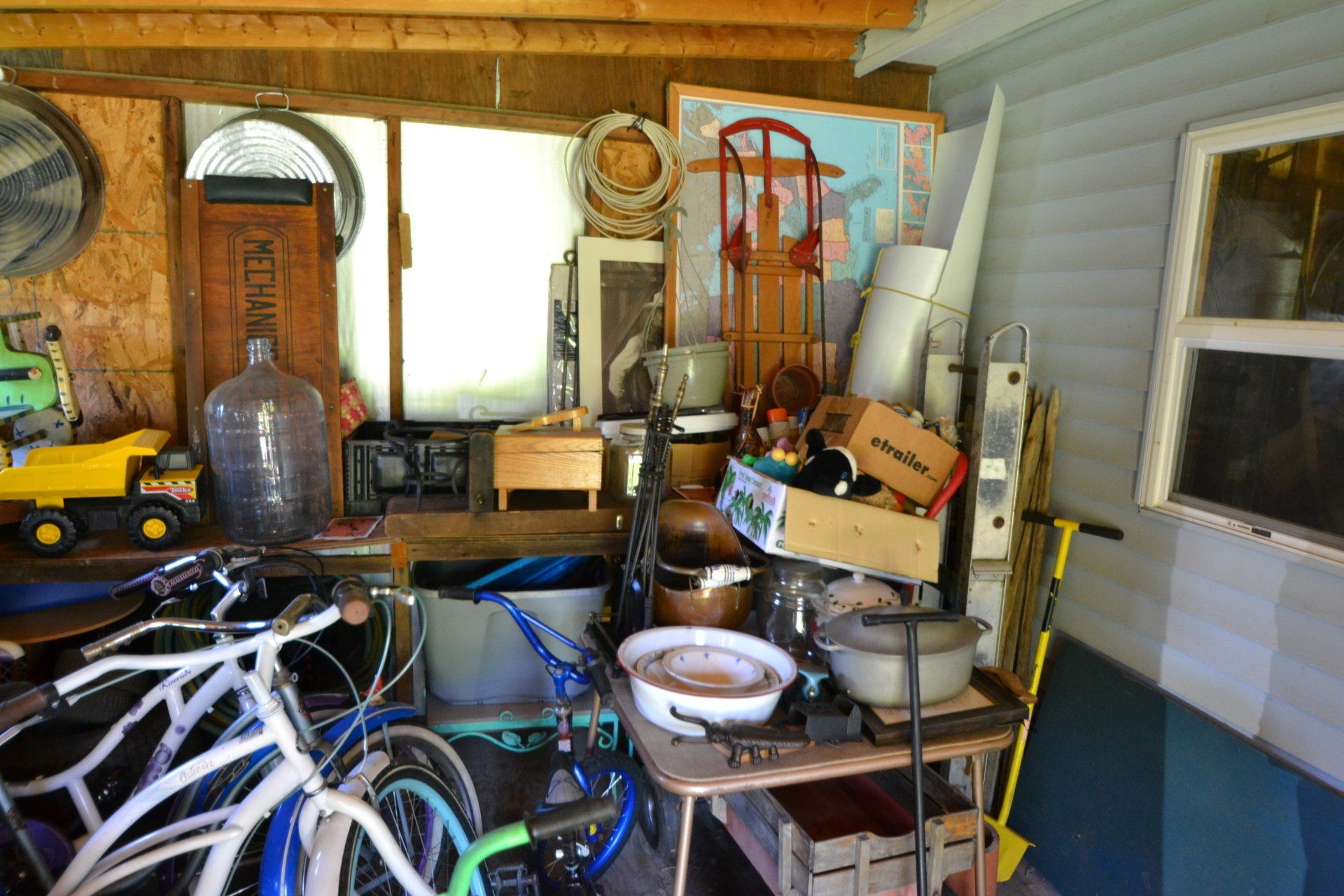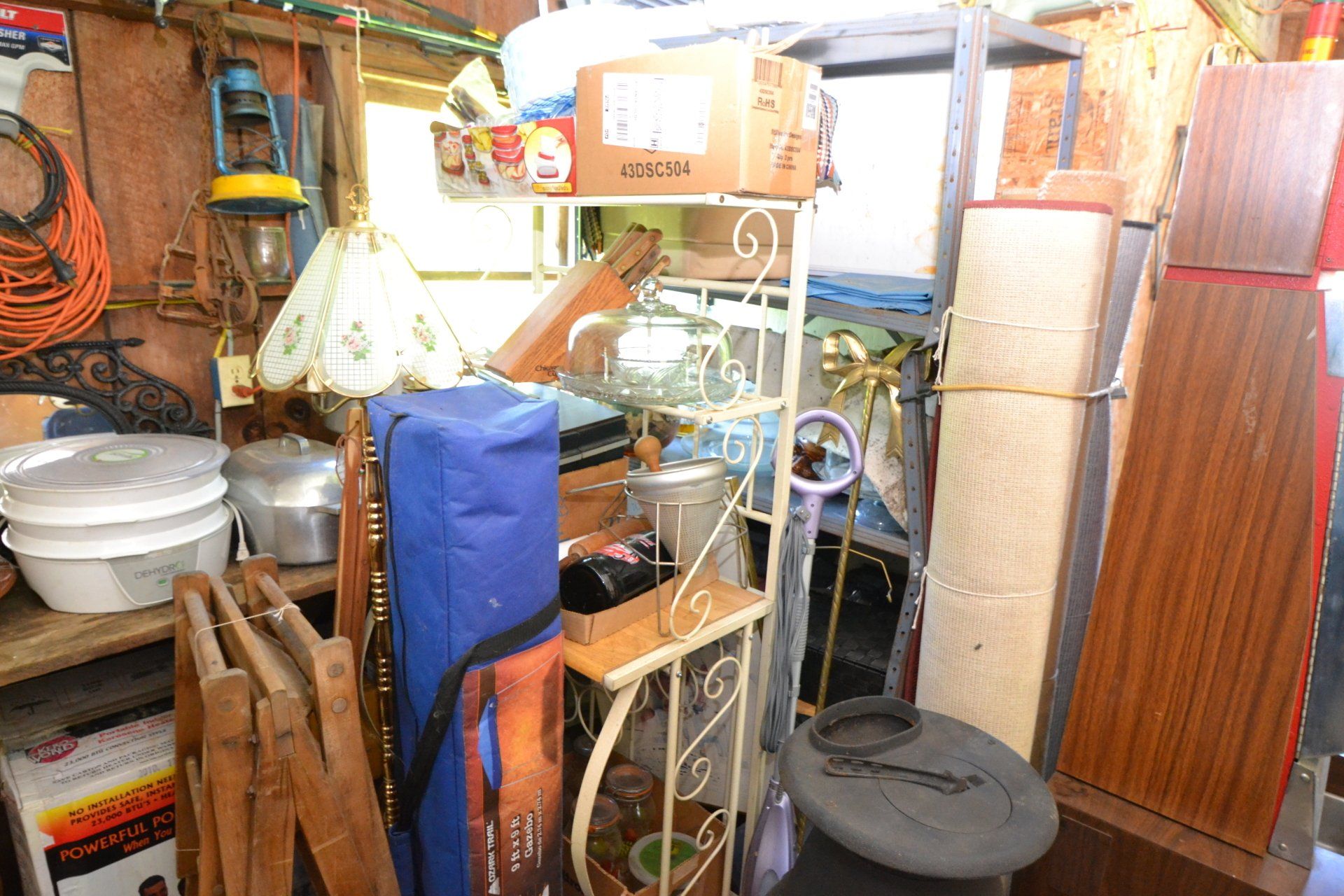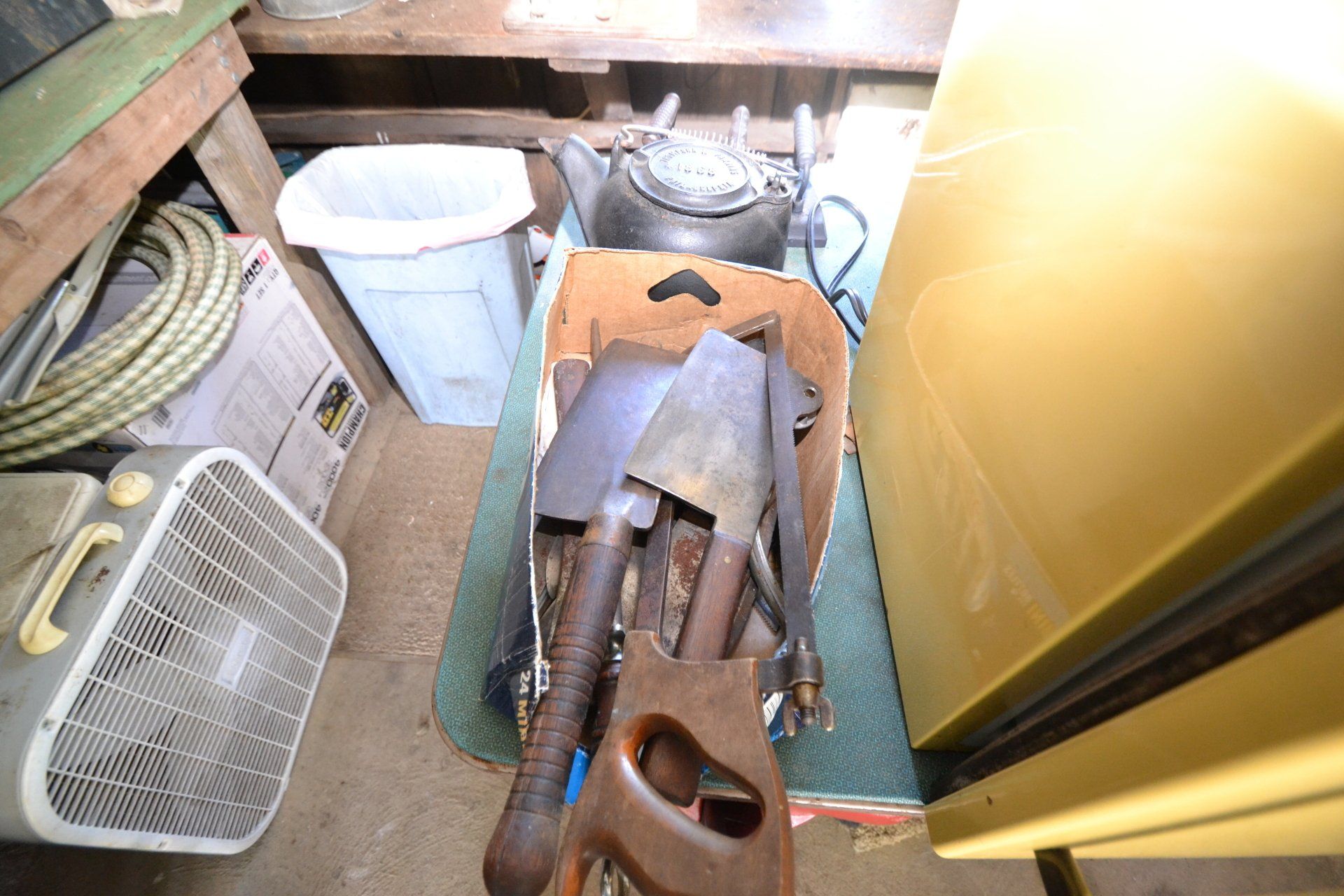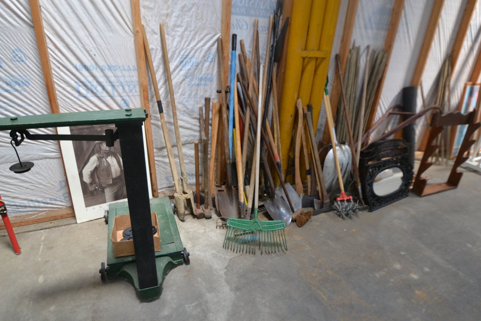 Copper Clad H-series, wood burning kitchen range, complete, functional and very nice; Sceinch kitchen cabinet w/ flour bin and sifter; butchers block; several small cast iron kitchen and laundry stoves; 25 cent Aristocrat slot machine; dozens and dozens cast skillets, Griswold, Wagner, etc; cast iron pitcher pump; large cast iron pots; several lard presses; nice cream and milk cans; wash boilers; Gem cistern pump; very large cast iron pot with spider, lid and handle; Crosley style baby stroller; brass oil can; zinc top jars; Radio Flyer wagon; several old wagons; large selection of great older bikes in good condition; corn sheller; old step stool; old automotive equipment; reel type mower; crockery; lanterns; several park benches; child’s park bench; brass; porcelain; sleds; laundry tubs with base and ringer; meat cleavers; some really nice fishing poles; small pot-belly stove; cast tea pot; collection of churns- Daisy, hand cranks, tumbler, dasher styles; meat saws; bells; tins; bottle capper; tobacco hand setter; cross cut saws wheat scythes; buck saw; meat grinders; tobacco grinder; cast iron bean pots; bee smoker; boxes of knives; cigarette lighters; wash boards; Audiovox display with several vintage radios and speakers; Troy-Bilt pressure washer; Acetylene tanks, torches and cart; garden tools; hand tools; hitches; chain fall; jacks tool boxes; mini roto-tiller; bull float; much more!