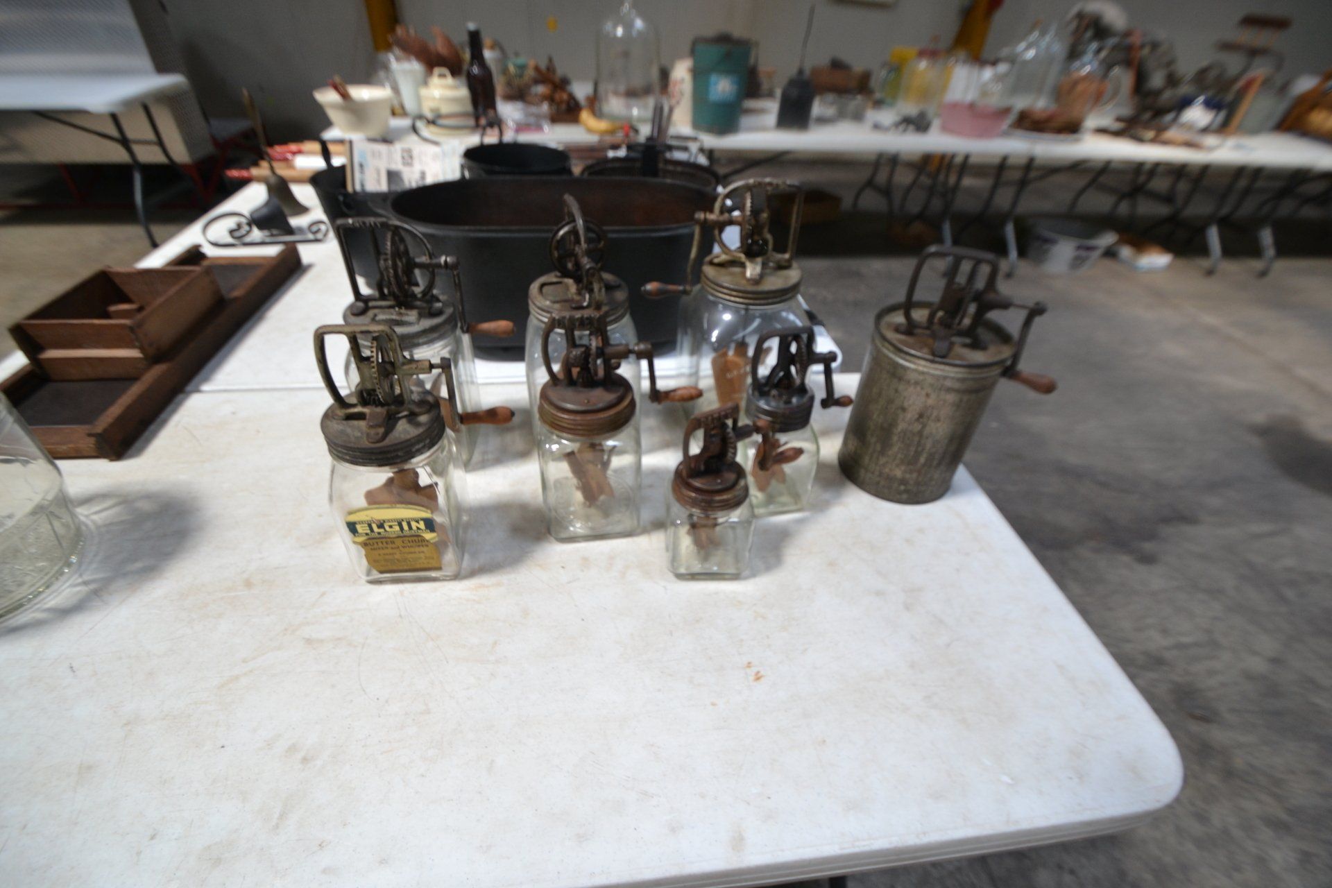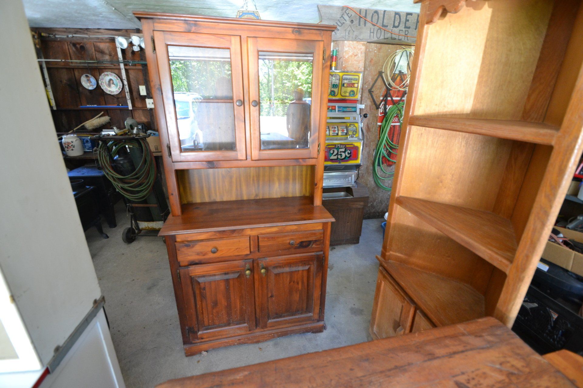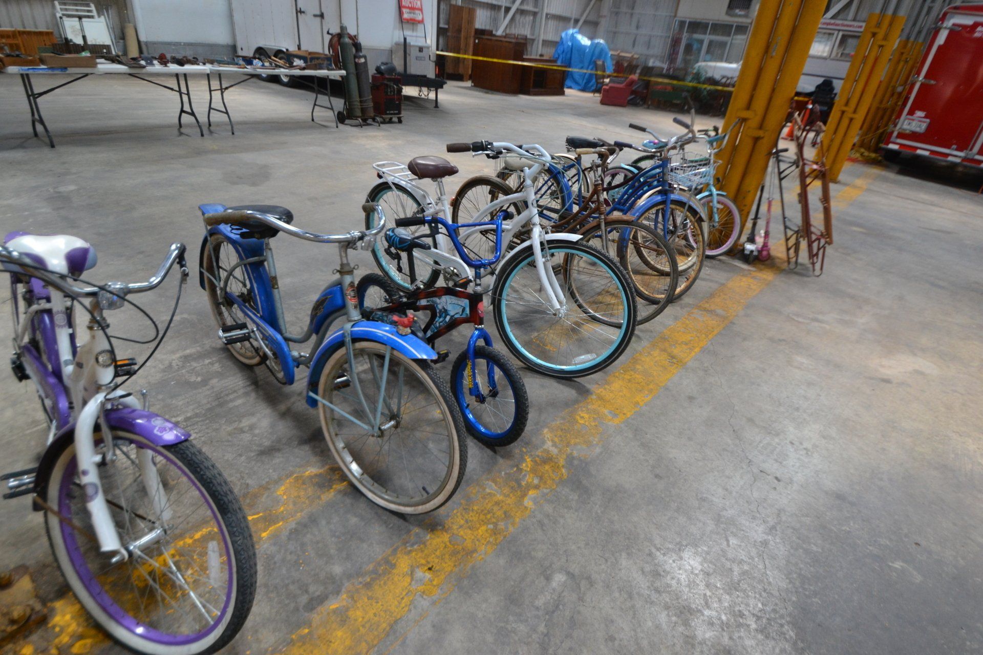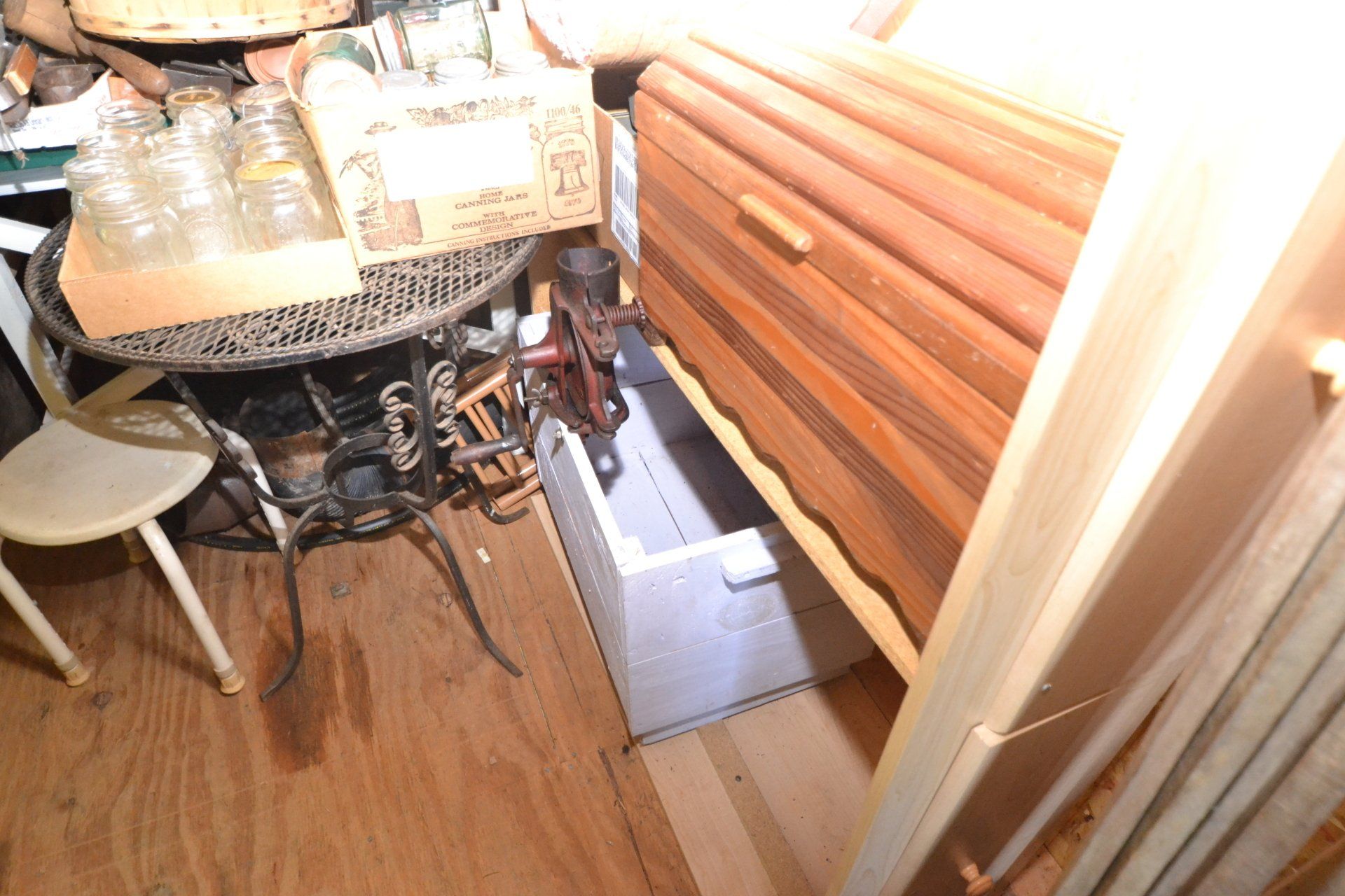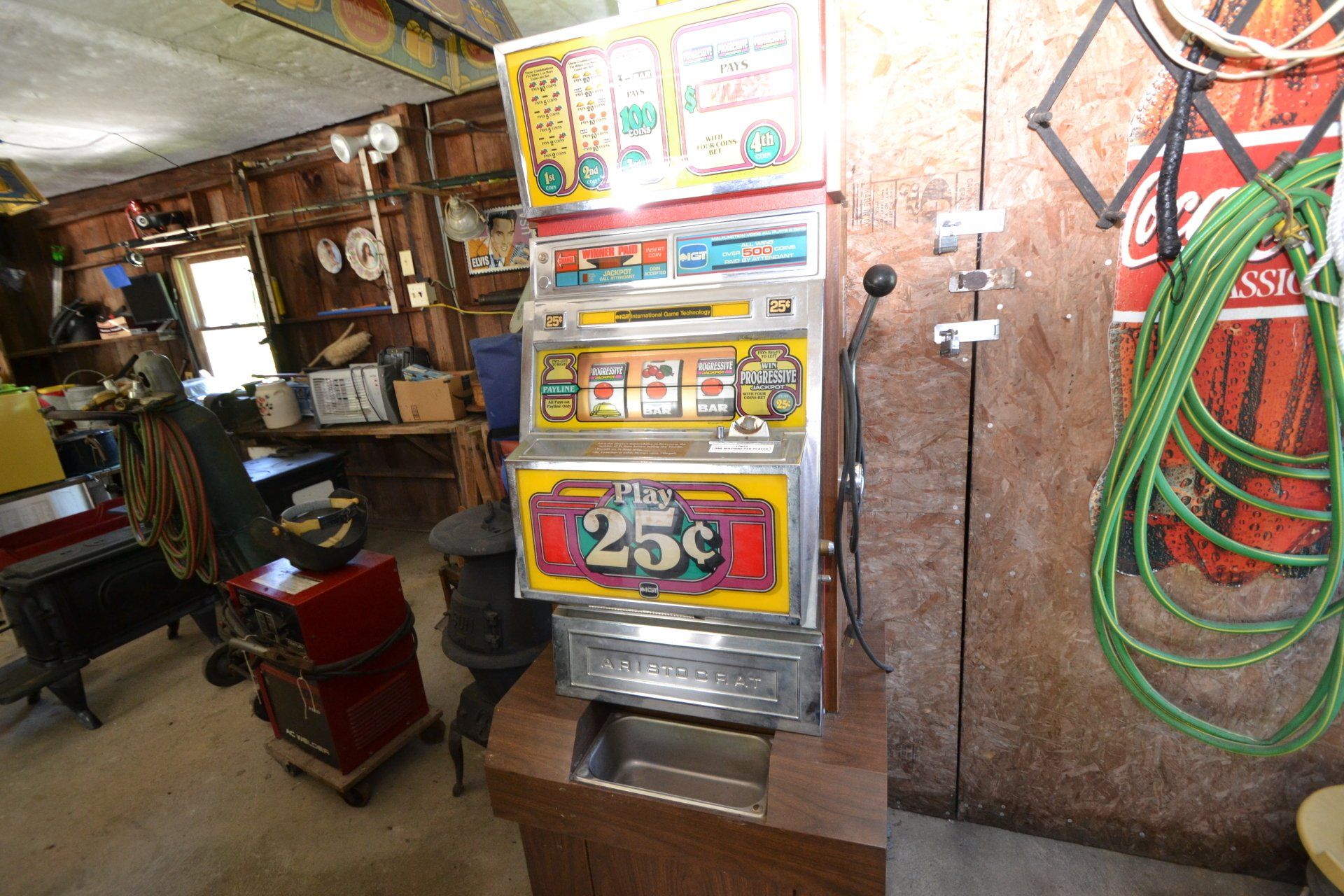 Copper Clad H-series, wood burning kitchen range, complete, functional and very nice; Sceinch kitchen cabinet w/ flour bin and sifter; butchers block; several small cast iron kitchen and laundry stoves; 25 cent Aristocrat slot machine; dozens and dozens cast skillets, Griswold, Wagner, etc; cast iron pitcher pump; large cast iron pots; several lard presses; nice cream and milk cans; wash boilers; Gem cistern pump; very large cast iron pot with spider, lid and handle; Crosley style baby stroller; brass oil can; zinc top jars; Radio Flyer wagon; several old wagons; large selection of great older bikes in good condition; corn sheller; old step stool; old automotive equipment; reel type mower; crockery; lanterns; several park benches; child’s park bench; brass; porcelain; sleds; laundry tubs with base and ringer; meat cleavers; some really nice fishing poles; small pot-belly stove; cast tea pot; collection of churns- Daisy, hand cranks, tumbler, dasher styles; meat saws; bells; tins; bottle capper; tobacco hand setter; cross cut saws wheat scythes; buck saw; meat grinders; tobacco grinder; cast iron bean pots; bee smoker; boxes of knives; cigarette lighters; wash boards; Audiovox display with several vintage radios and speakers; Troy-Bilt pressure washer; Acetylene tanks, torches and cart; garden tools; hand tools; hitches; chain fall; jacks tool boxes; mini roto-tiller; bull float; much more!