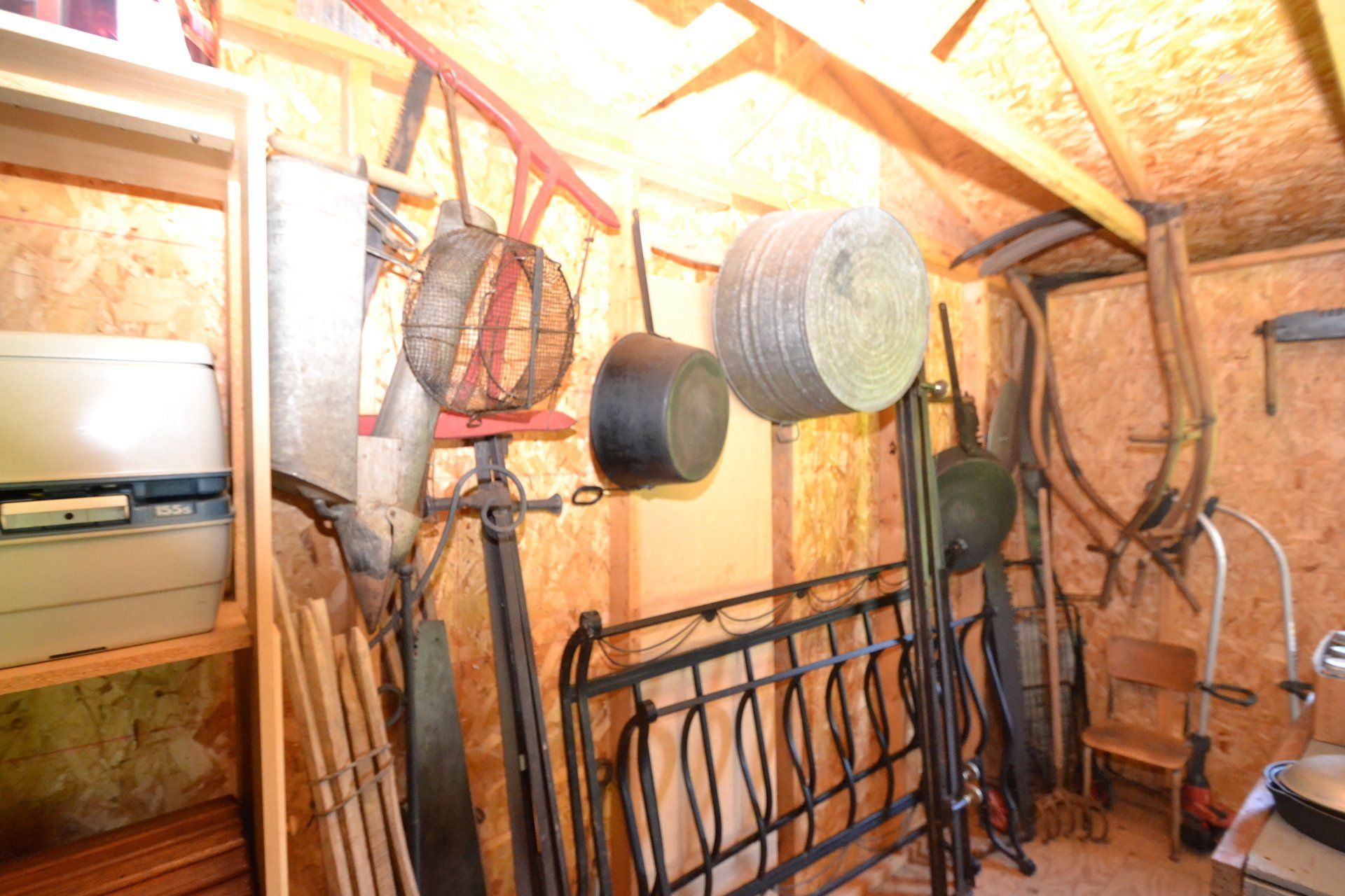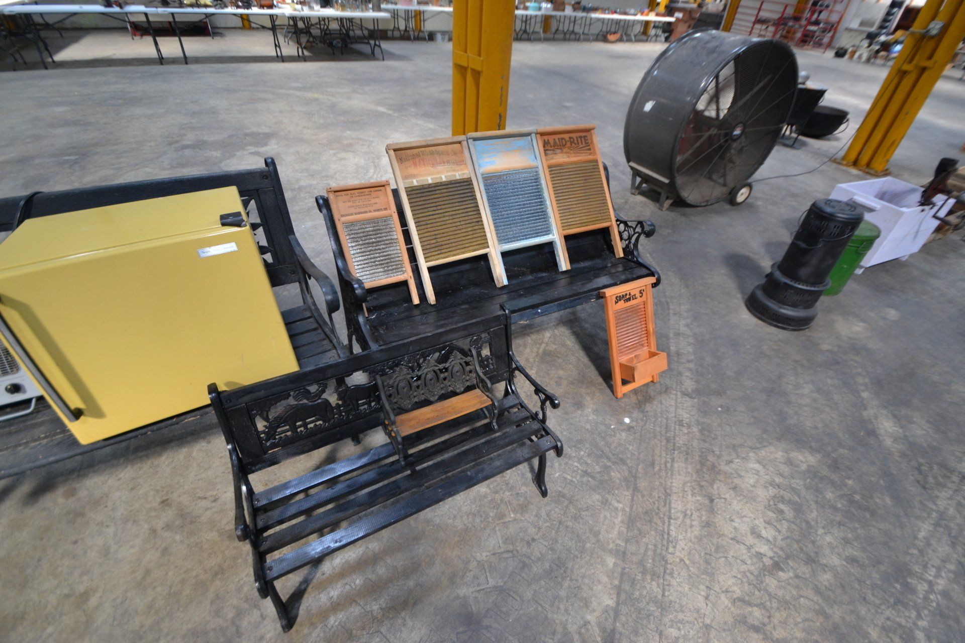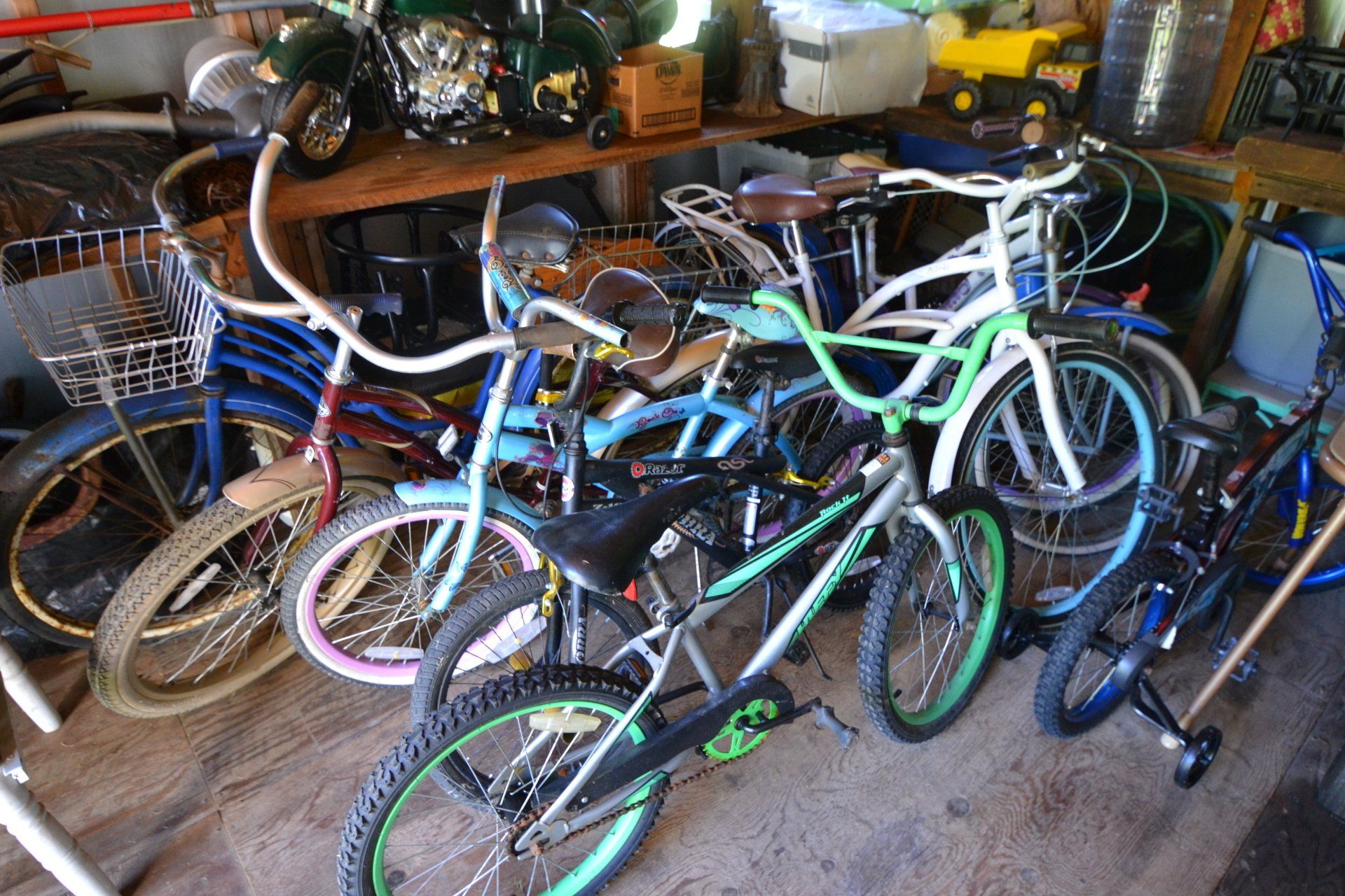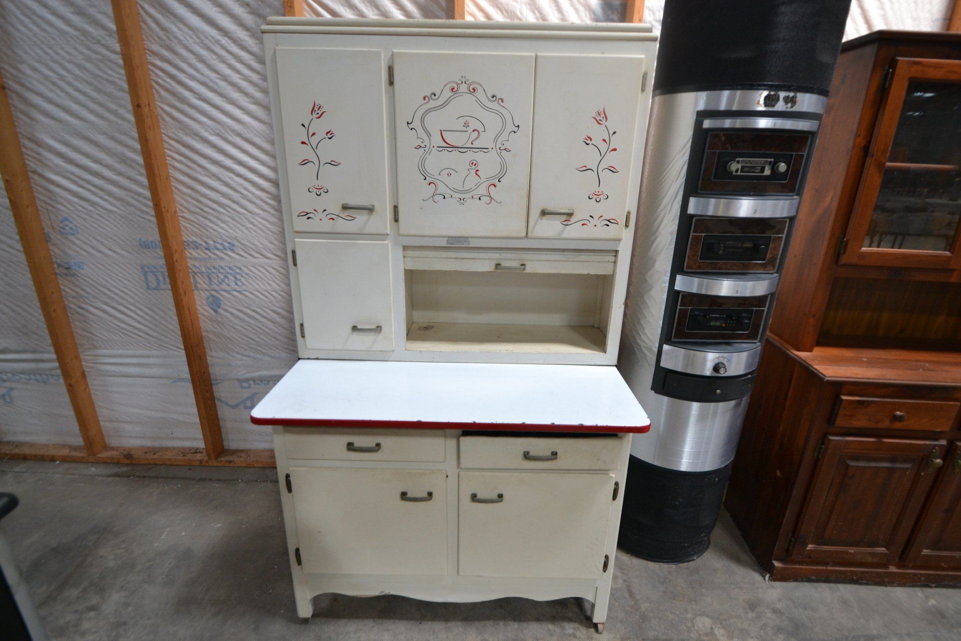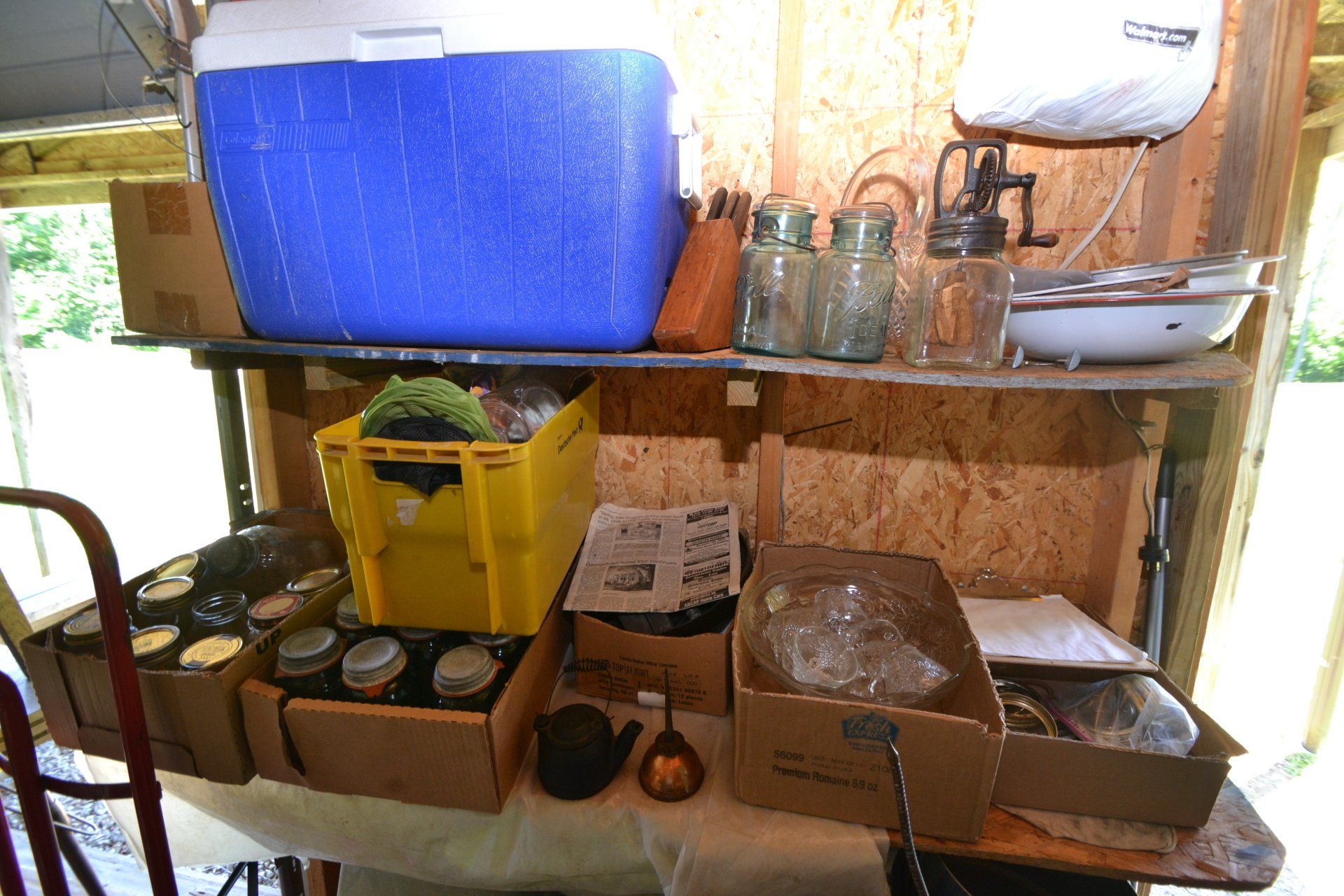 Copper Clad H-series, wood burning kitchen range, complete, functional and very nice; Sceinch kitchen cabinet w/ flour bin and sifter; butchers block; several small cast iron kitchen and laundry stoves; 25 cent Aristocrat slot machine; dozens and dozens cast skillets, Griswold, Wagner, etc; cast iron pitcher pump; large cast iron pots; several lard presses; nice cream and milk cans; wash boilers; Gem cistern pump; very large cast iron pot with spider, lid and handle; Crosley style baby stroller; brass oil can; zinc top jars; Radio Flyer wagon; several old wagons; large selection of great older bikes in good condition; corn sheller; old step stool; old automotive equipment; reel type mower; crockery; lanterns; several park benches; child’s park bench; brass; porcelain; sleds; laundry tubs with base and ringer; meat cleavers; some really nice fishing poles; small pot-belly stove; cast tea pot; collection of churns- Daisy, hand cranks, tumbler, dasher styles; meat saws; bells; tins; bottle capper; tobacco hand setter; cross cut saws wheat scythes; buck saw; meat grinders; tobacco grinder; cast iron bean pots; bee smoker; boxes of knives; cigarette lighters; wash boards; Audiovox display with several vintage radios and speakers; Troy-Bilt pressure washer; Acetylene tanks, torches and cart; garden tools; hand tools; hitches; chain fall; jacks tool boxes; mini roto-tiller; bull float; much more!