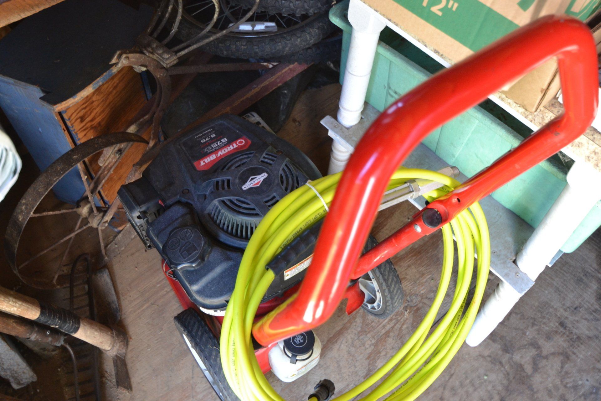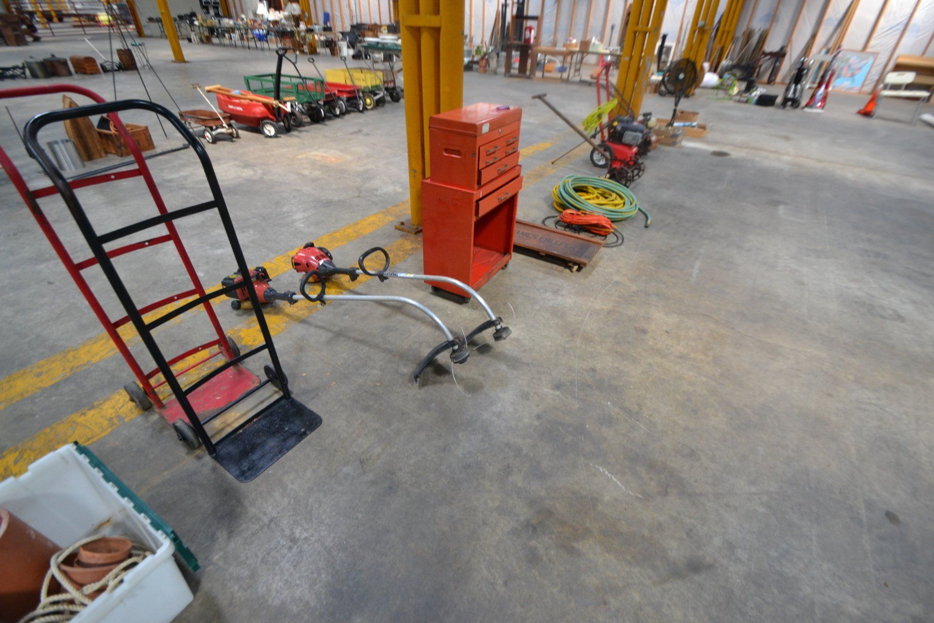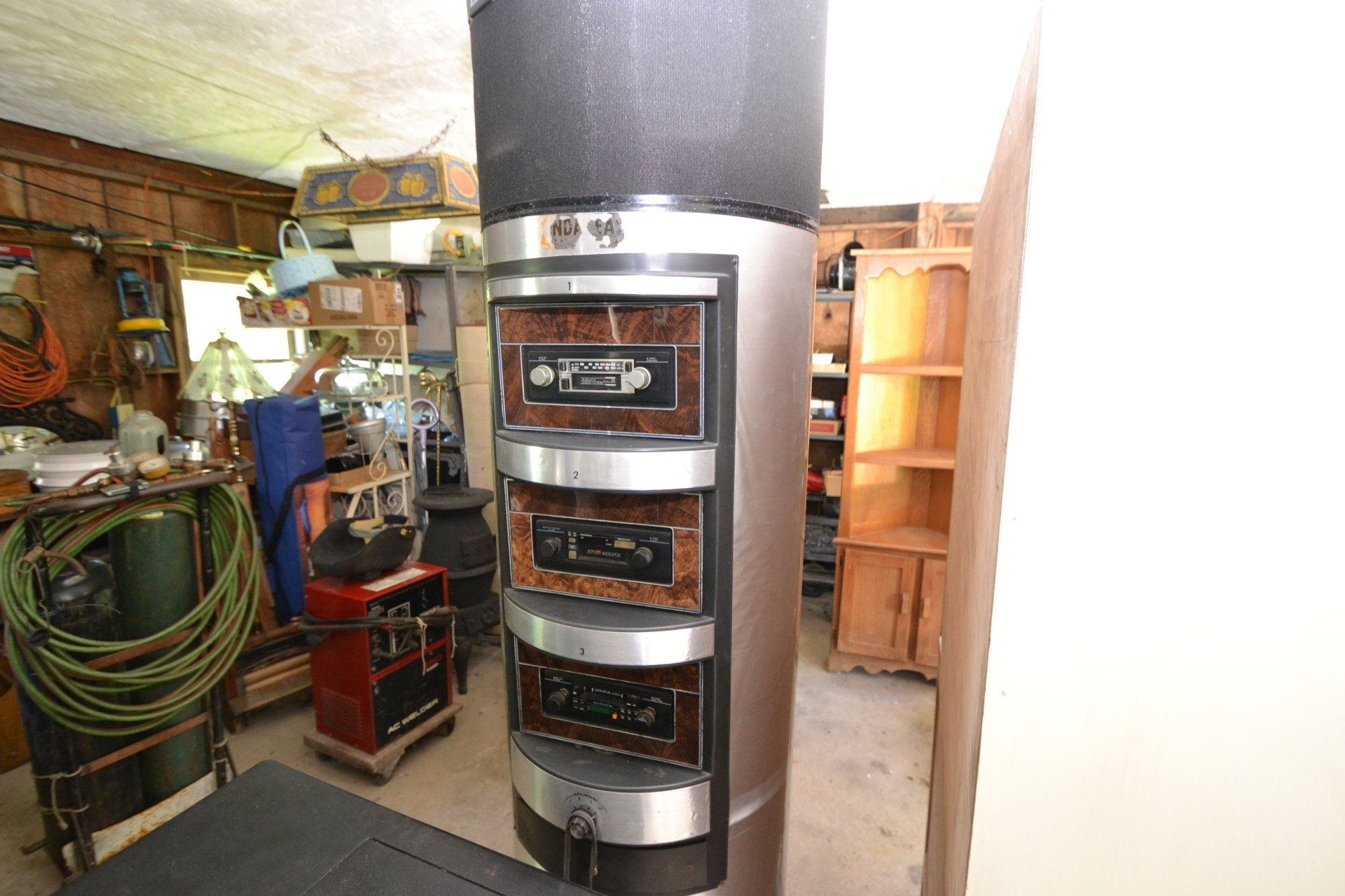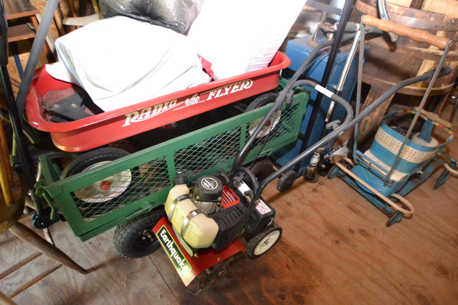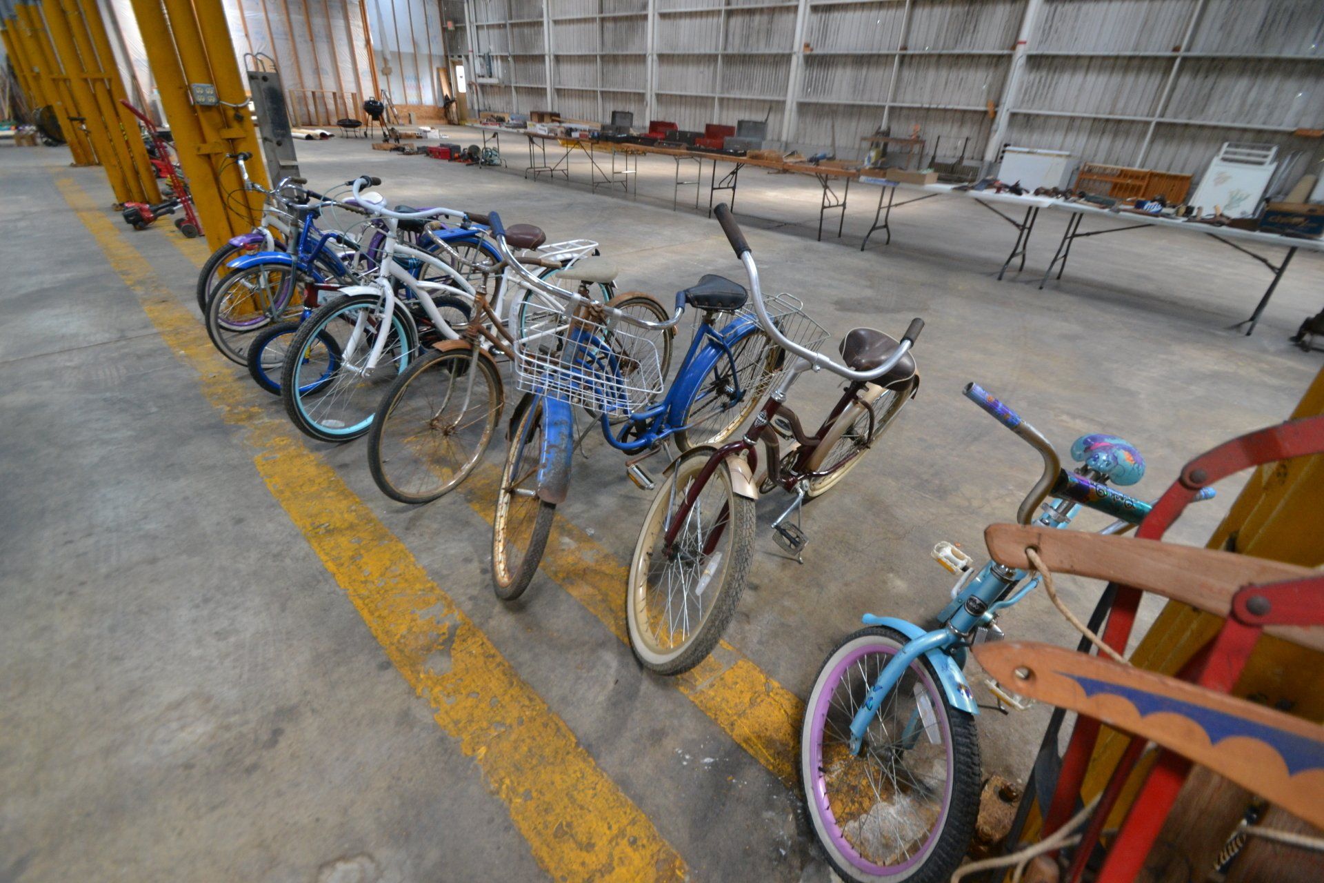 Copper Clad H-series, wood burning kitchen range, complete, functional and very nice; Sceinch kitchen cabinet w/ flour bin and sifter; butchers block; several small cast iron kitchen and laundry stoves; 25 cent Aristocrat slot machine; dozens and dozens cast skillets, Griswold, Wagner, etc; cast iron pitcher pump; large cast iron pots; several lard presses; nice cream and milk cans; wash boilers; Gem cistern pump; very large cast iron pot with spider, lid and handle; Crosley style baby stroller; brass oil can; zinc top jars; Radio Flyer wagon; several old wagons; large selection of great older bikes in good condition; corn sheller; old step stool; old automotive equipment; reel type mower; crockery; lanterns; several park benches; child’s park bench; brass; porcelain; sleds; laundry tubs with base and ringer; meat cleavers; some really nice fishing poles; small pot-belly stove; cast tea pot; collection of churns- Daisy, hand cranks, tumbler, dasher styles; meat saws; bells; tins; bottle capper; tobacco hand setter; cross cut saws wheat scythes; buck saw; meat grinders; tobacco grinder; cast iron bean pots; bee smoker; boxes of knives; cigarette lighters; wash boards; Audiovox display with several vintage radios and speakers; Troy-Bilt pressure washer; Acetylene tanks, torches and cart; garden tools; hand tools; hitches; chain fall; jacks tool boxes; mini roto-tiller; bull float; much more!