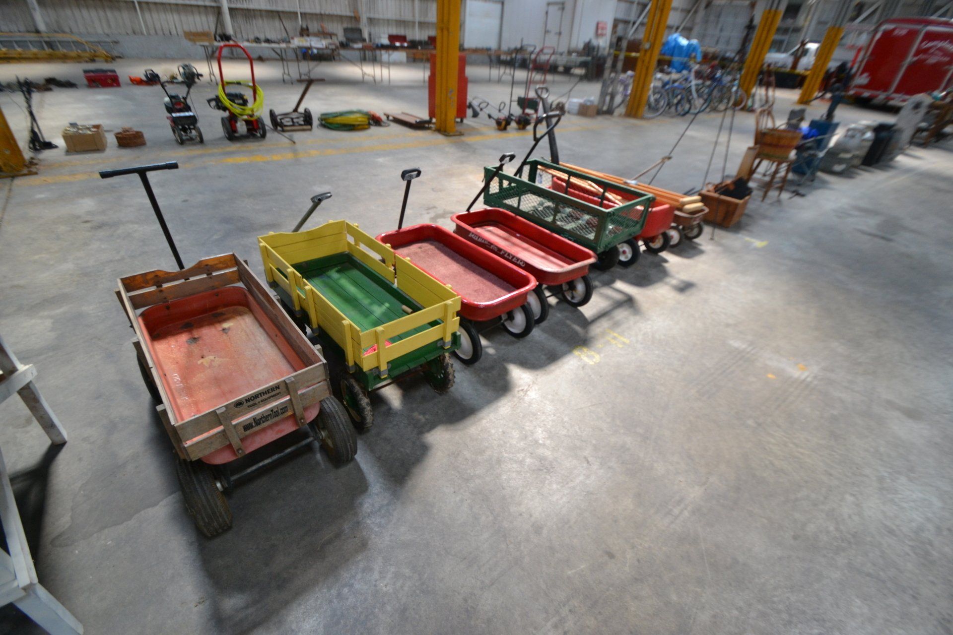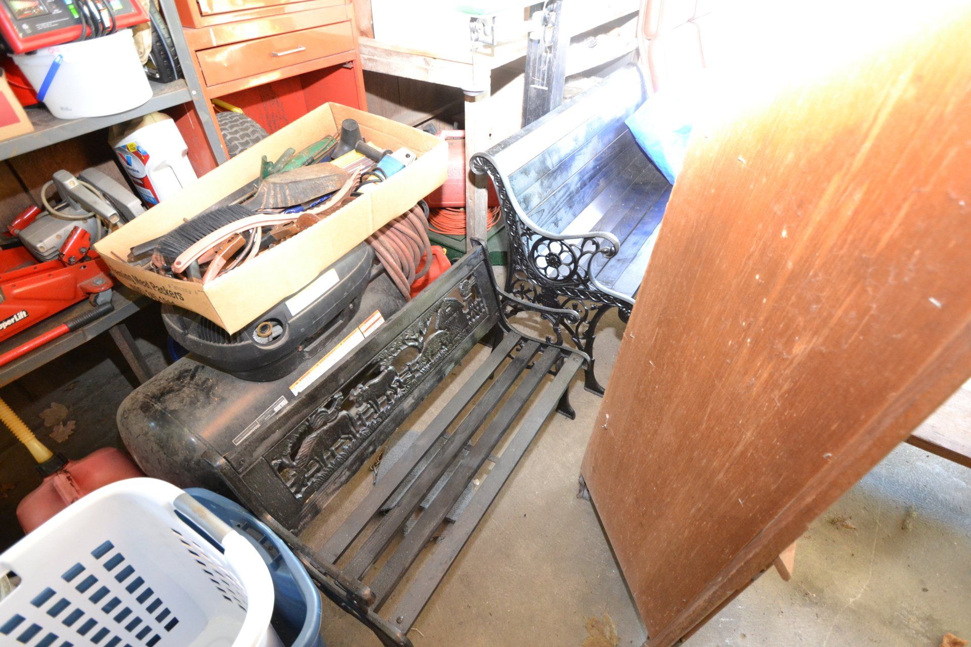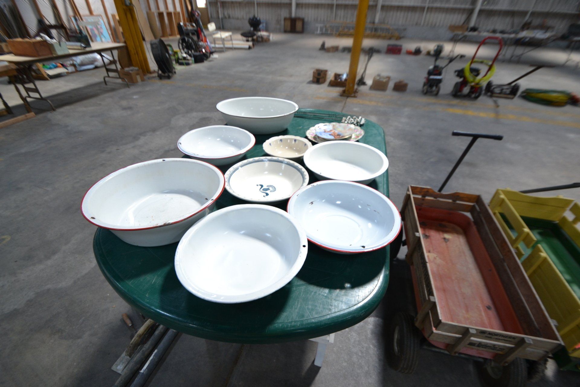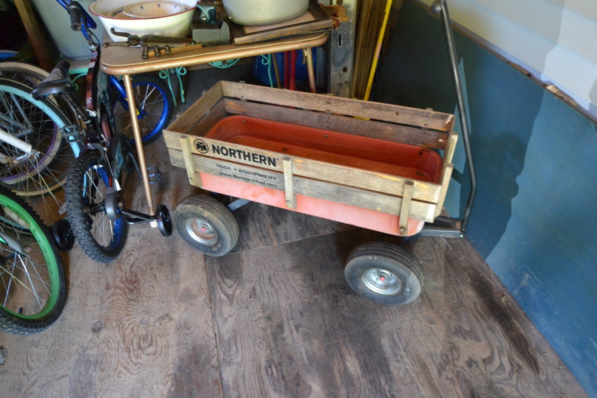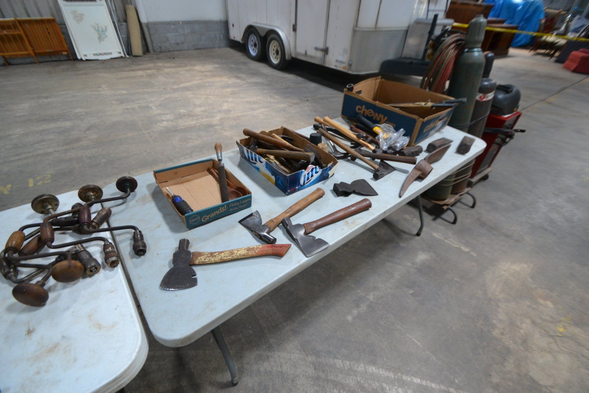 Copper Clad H-series, wood burning kitchen range, complete, functional and very nice; Sceinch kitchen cabinet w/ flour bin and sifter; butchers block; several small cast iron kitchen and laundry stoves; 25 cent Aristocrat slot machine; dozens and dozens cast skillets, Griswold, Wagner, etc; cast iron pitcher pump; large cast iron pots; several lard presses; nice cream and milk cans; wash boilers; Gem cistern pump; very large cast iron pot with spider, lid and handle; Crosley style baby stroller; brass oil can; zinc top jars; Radio Flyer wagon; several old wagons; large selection of great older bikes in good condition; corn sheller; old step stool; old automotive equipment; reel type mower; crockery; lanterns; several park benches; child’s park bench; brass; porcelain; sleds; laundry tubs with base and ringer; meat cleavers; some really nice fishing poles; small pot-belly stove; cast tea pot; collection of churns- Daisy, hand cranks, tumbler, dasher styles; meat saws; bells; tins; bottle capper; tobacco hand setter; cross cut saws wheat scythes; buck saw; meat grinders; tobacco grinder; cast iron bean pots; bee smoker; boxes of knives; cigarette lighters; wash boards; Audiovox display with several vintage radios and speakers; Troy-Bilt pressure washer; Acetylene tanks, torches and cart; garden tools; hand tools; hitches; chain fall; jacks tool boxes; mini roto-tiller; bull float; much more!