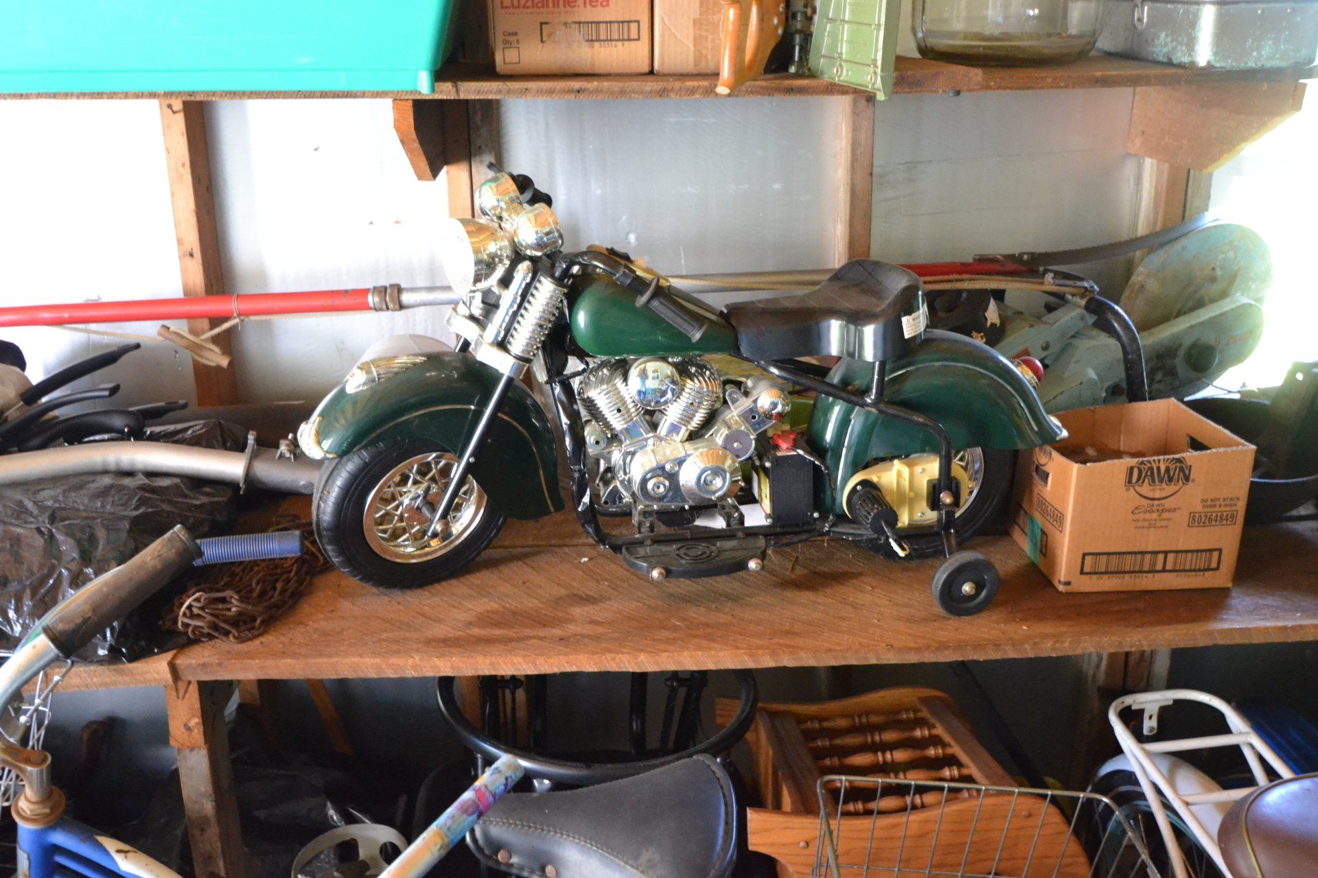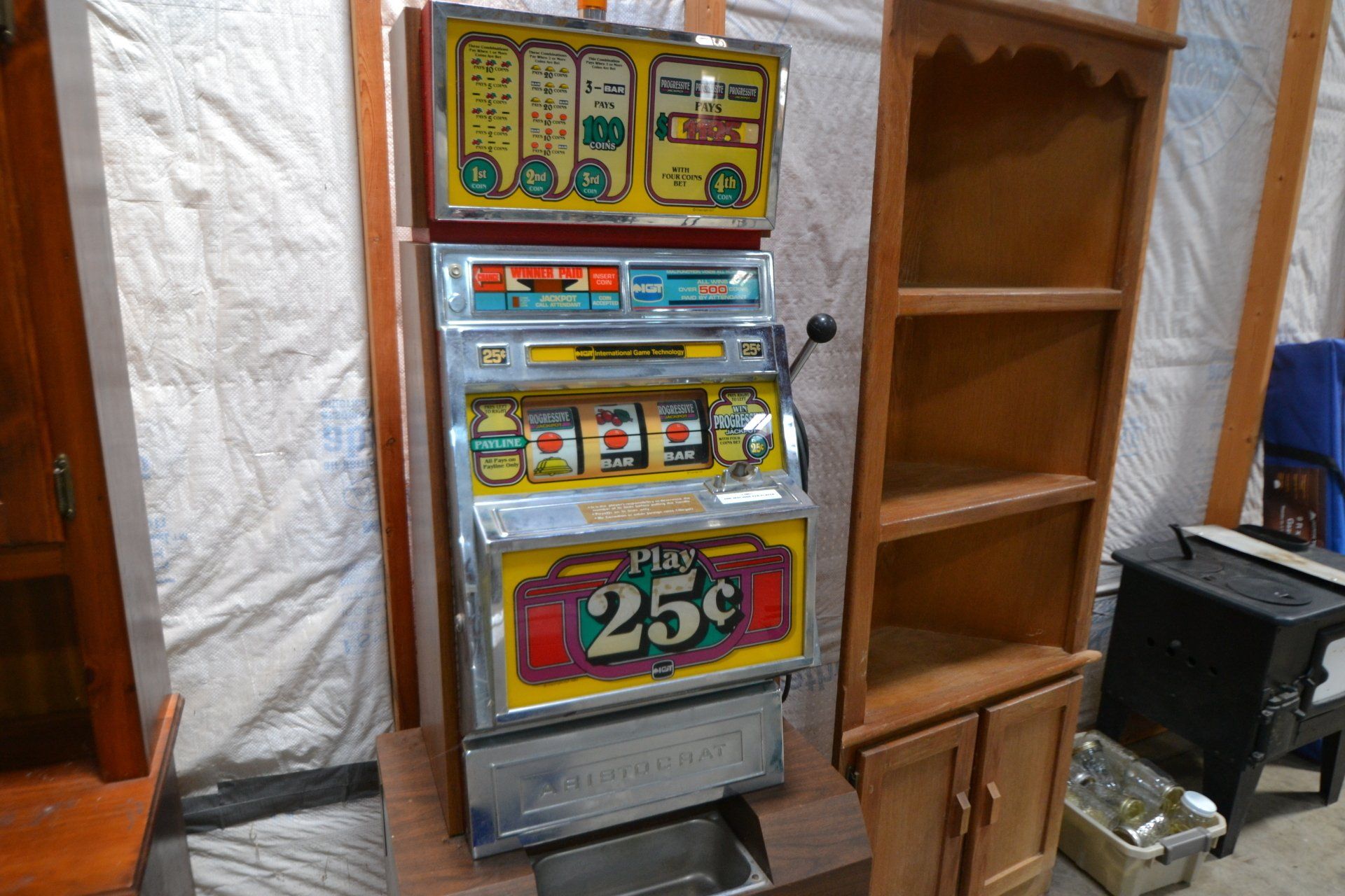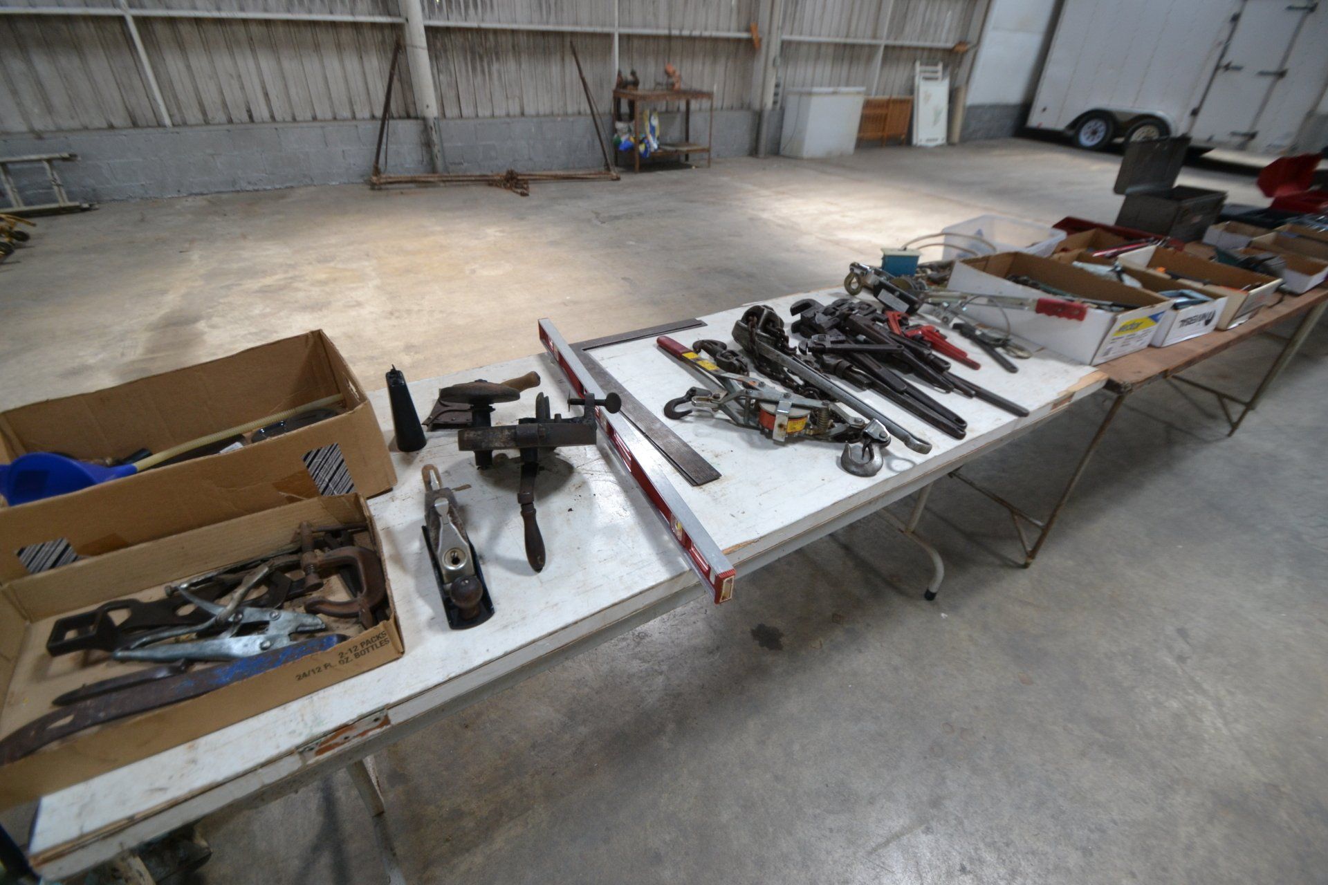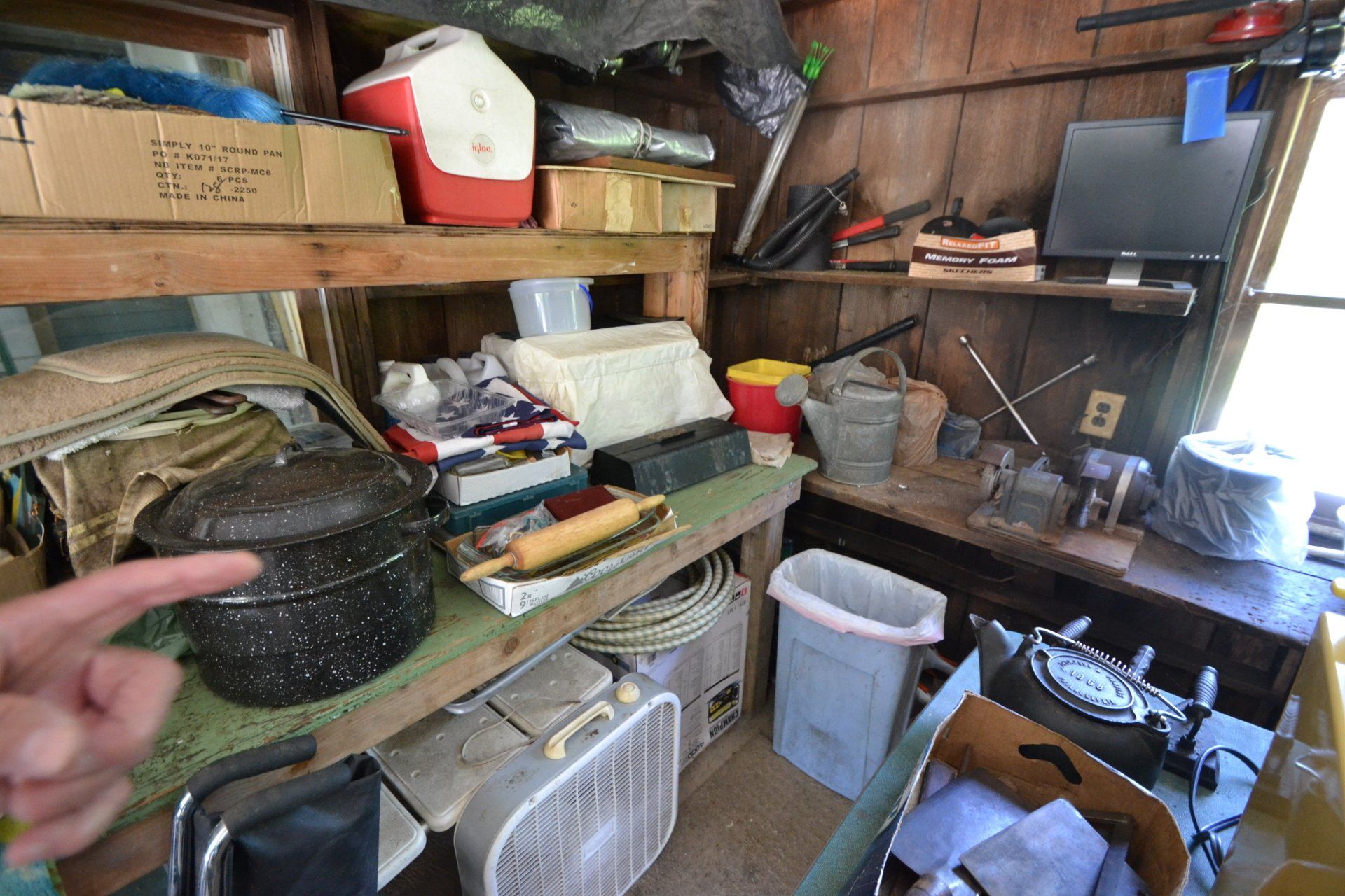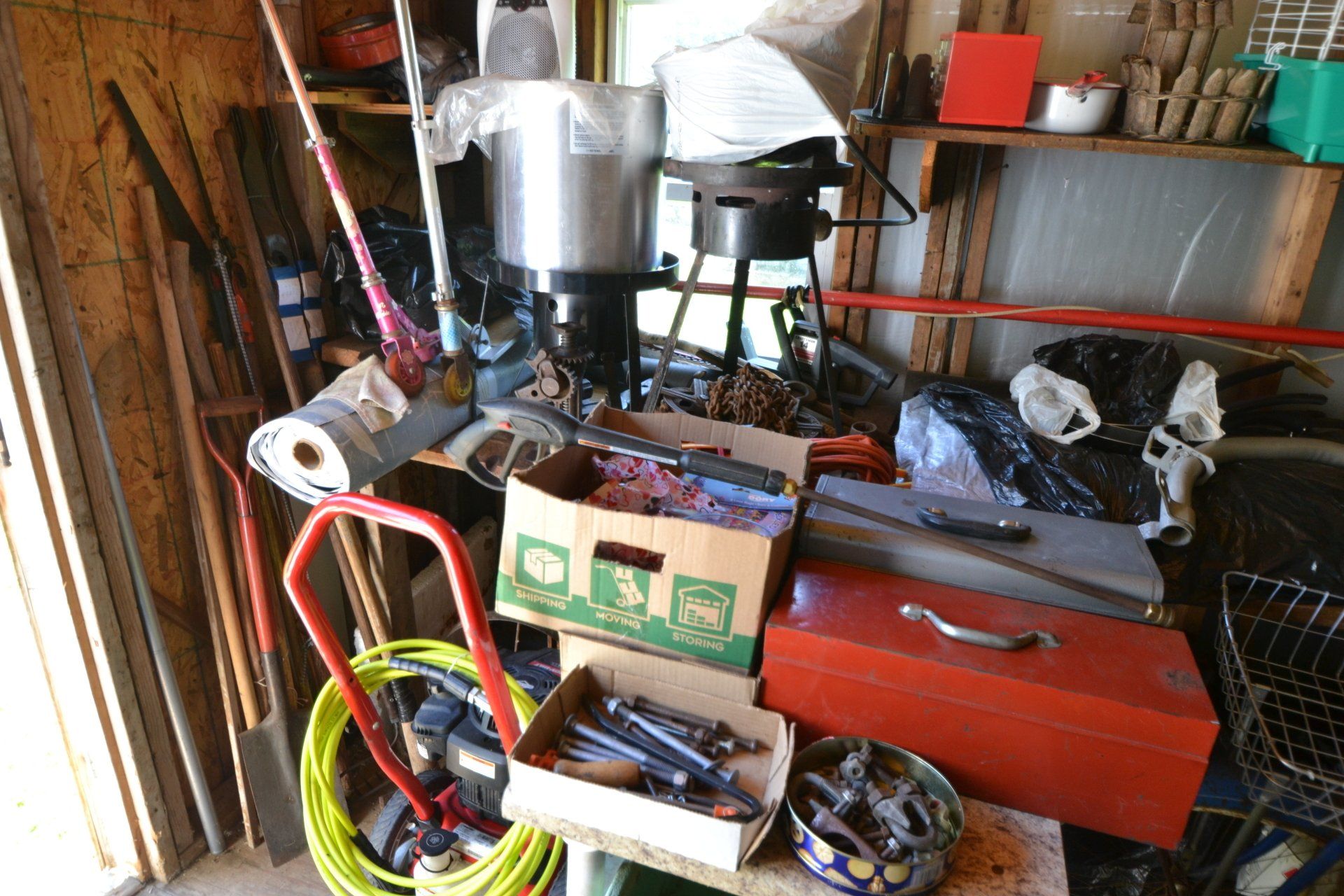 Copper Clad H-series, wood burning kitchen range, complete, functional and very nice; Sceinch kitchen cabinet w/ flour bin and sifter; butchers block; several small cast iron kitchen and laundry stoves; 25 cent Aristocrat slot machine; dozens and dozens cast skillets, Griswold, Wagner, etc; cast iron pitcher pump; large cast iron pots; several lard presses; nice cream and milk cans; wash boilers; Gem cistern pump; very large cast iron pot with spider, lid and handle; Crosley style baby stroller; brass oil can; zinc top jars; Radio Flyer wagon; several old wagons; large selection of great older bikes in good condition; corn sheller; old step stool; old automotive equipment; reel type mower; crockery; lanterns; several park benches; child’s park bench; brass; porcelain; sleds; laundry tubs with base and ringer; meat cleavers; some really nice fishing poles; small pot-belly stove; cast tea pot; collection of churns- Daisy, hand cranks, tumbler, dasher styles; meat saws; bells; tins; bottle capper; tobacco hand setter; cross cut saws wheat scythes; buck saw; meat grinders; tobacco grinder; cast iron bean pots; bee smoker; boxes of knives; cigarette lighters; wash boards; Audiovox display with several vintage radios and speakers; Troy-Bilt pressure washer; Acetylene tanks, torches and cart; garden tools; hand tools; hitches; chain fall; jacks tool boxes; mini roto-tiller; bull float; much more!