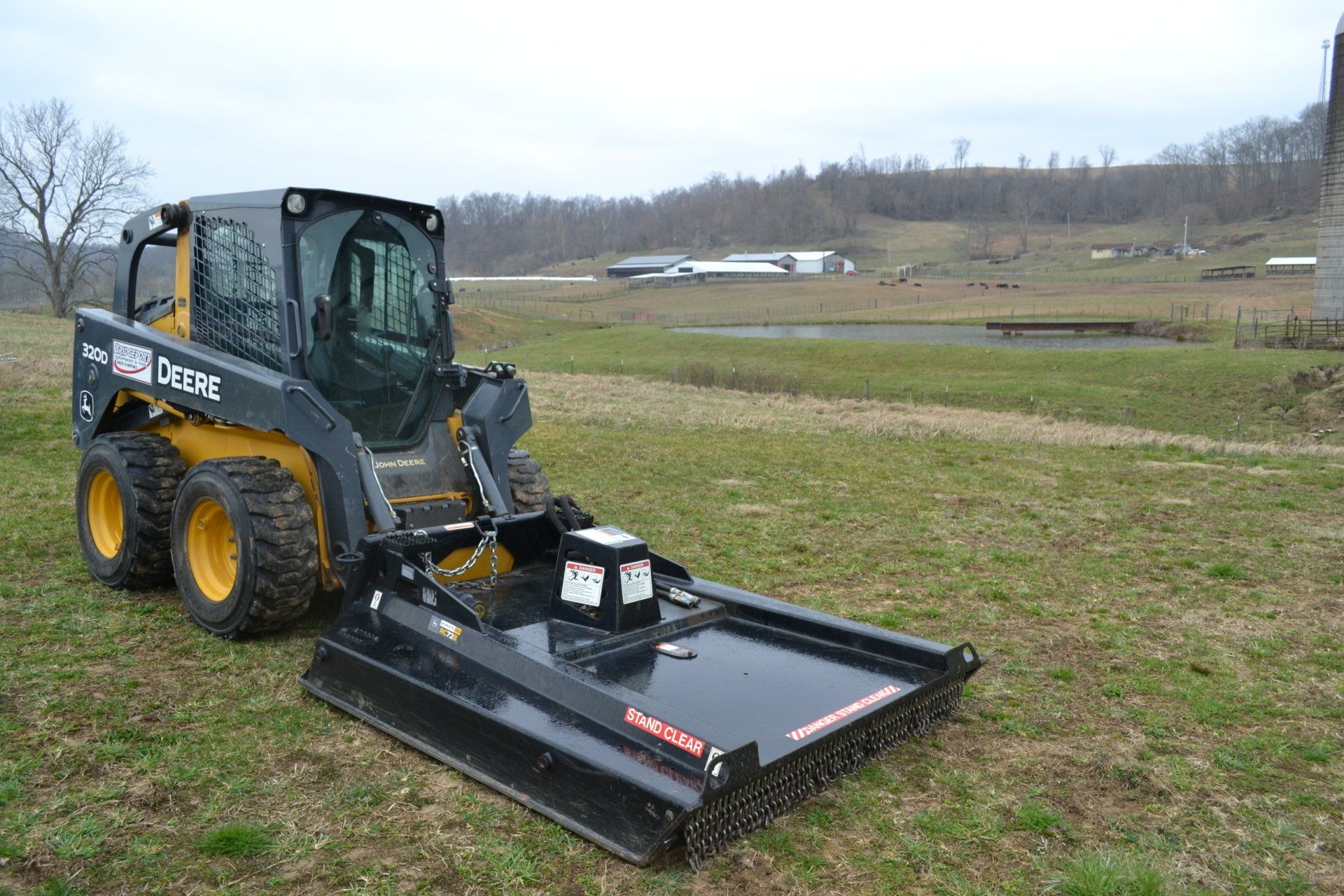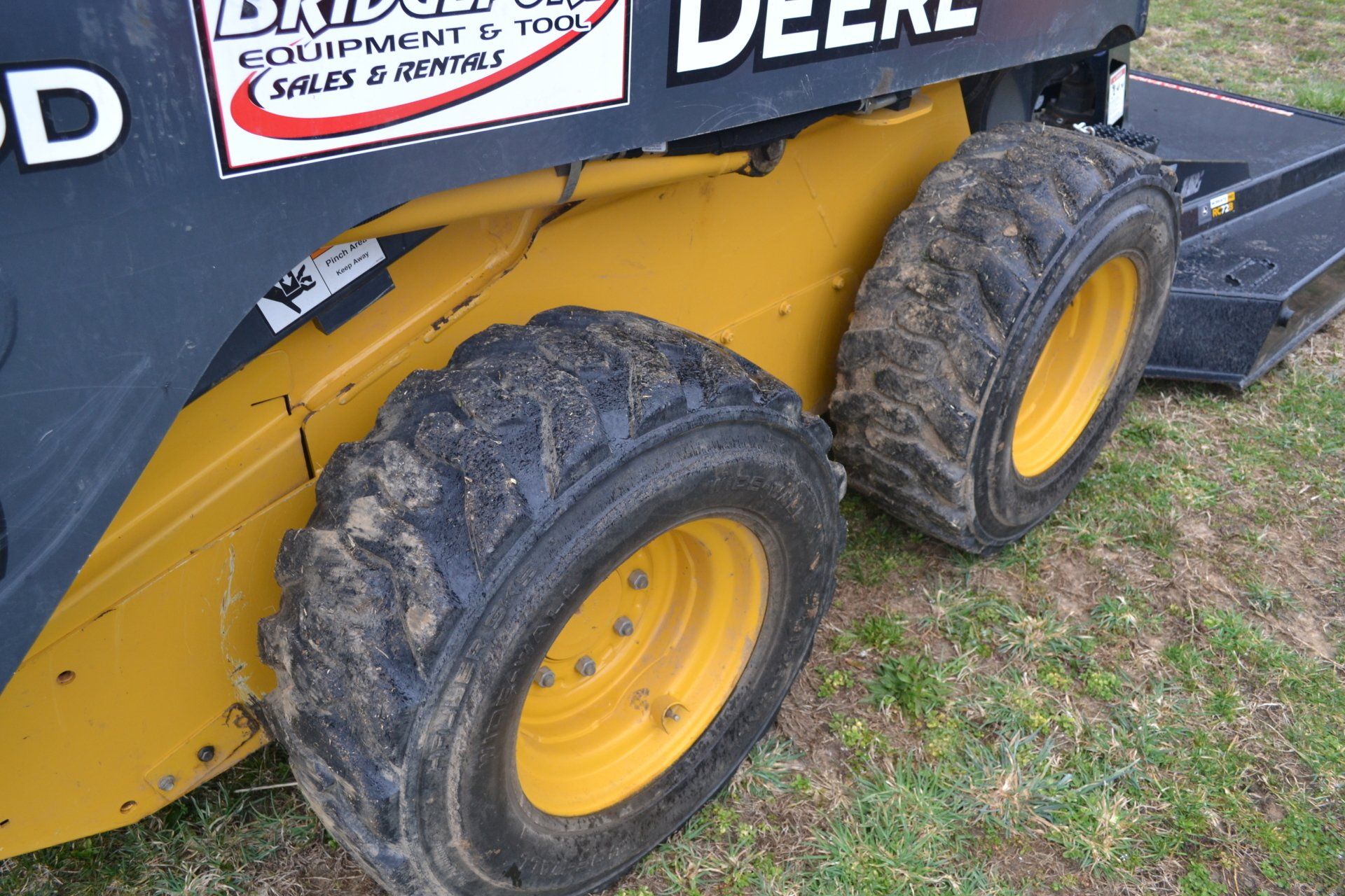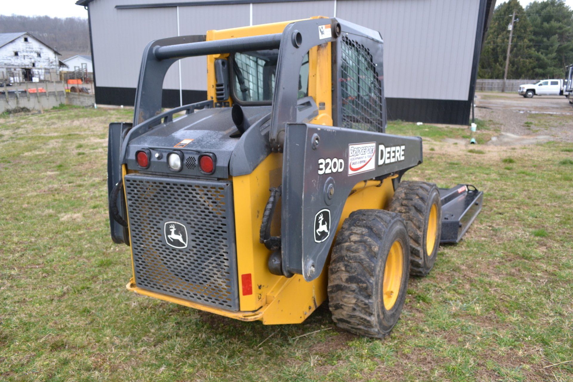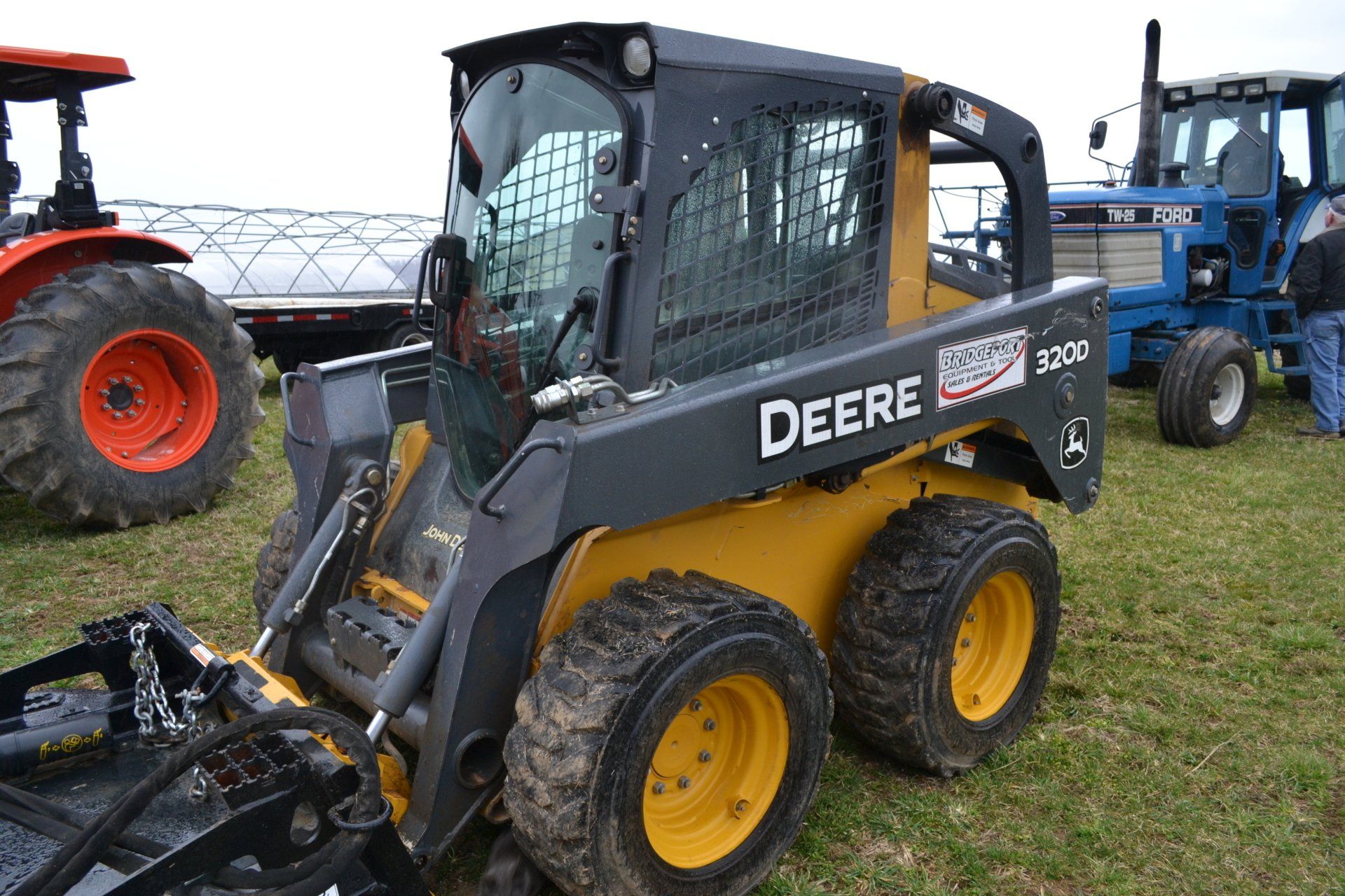 John Deere 320D-cab, AC, electric disconnect, 571 hours; 72” John Deere rotary cutter; Bale Spear; Pilot Forks; Grapple; Post Hole Digger-9”, 12”, 15” auger; Tracks