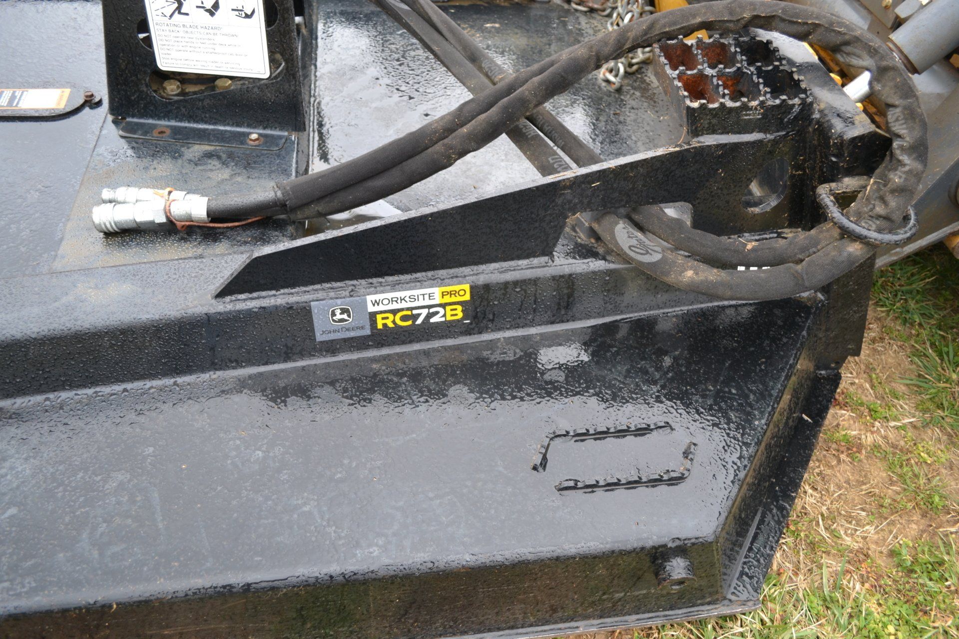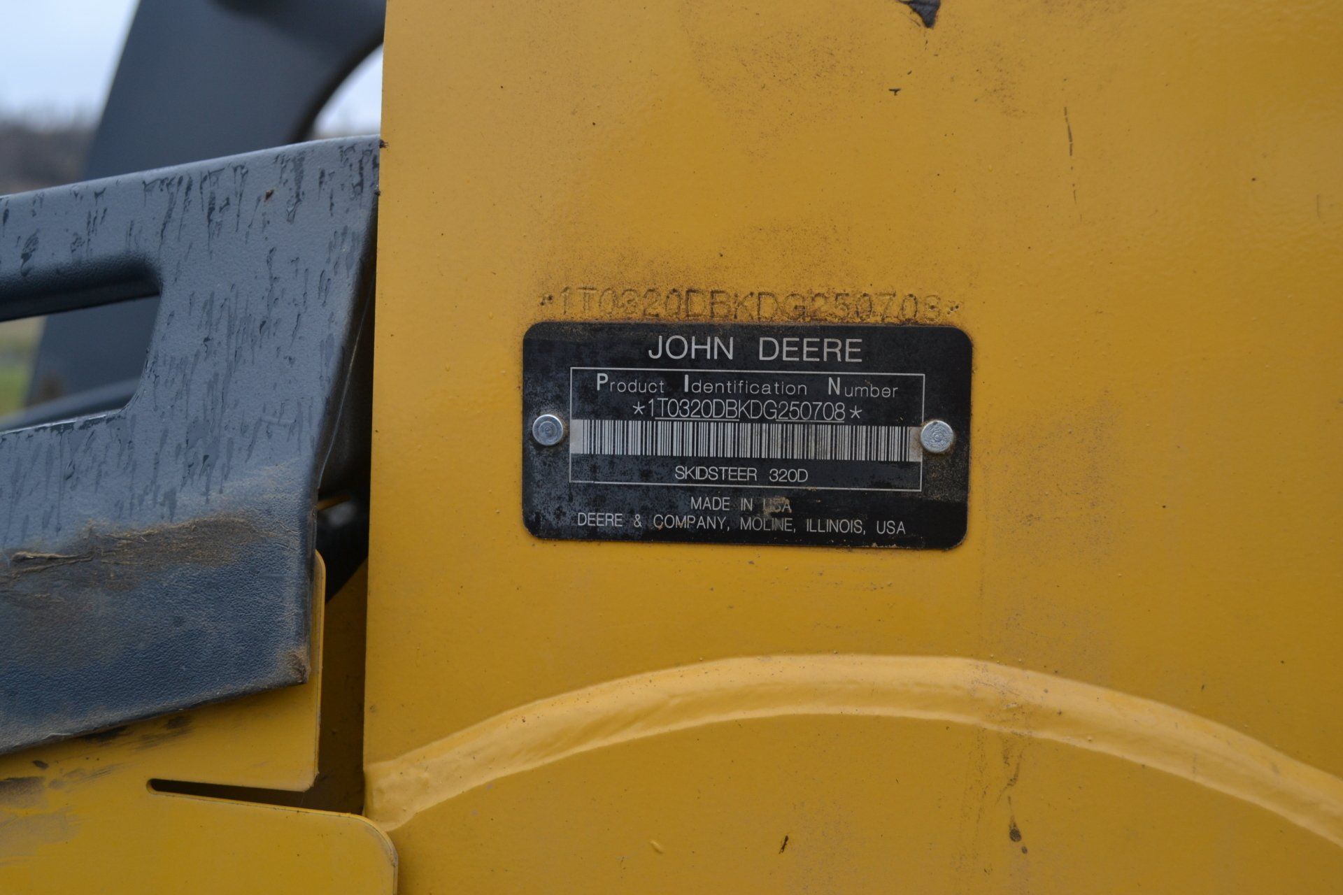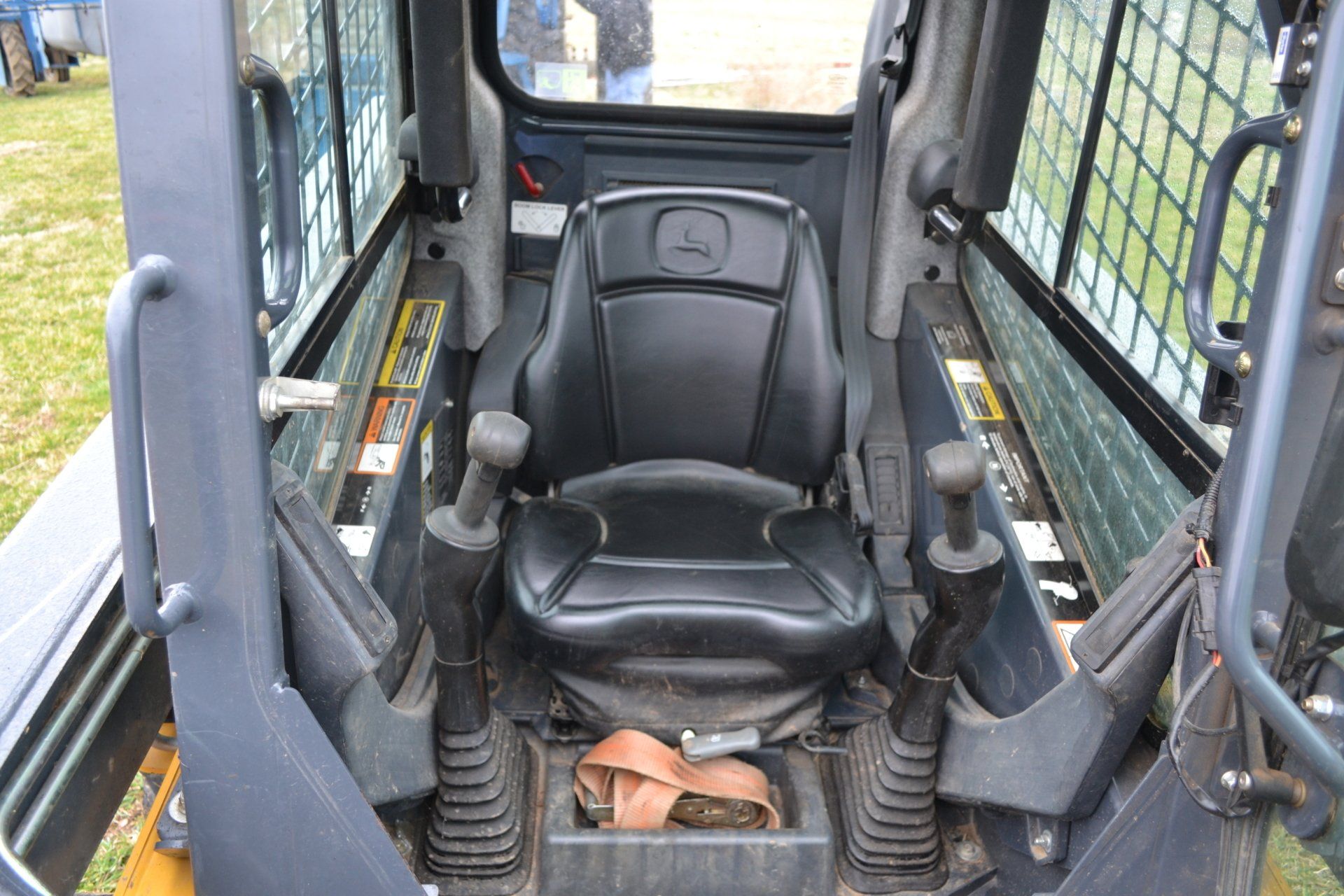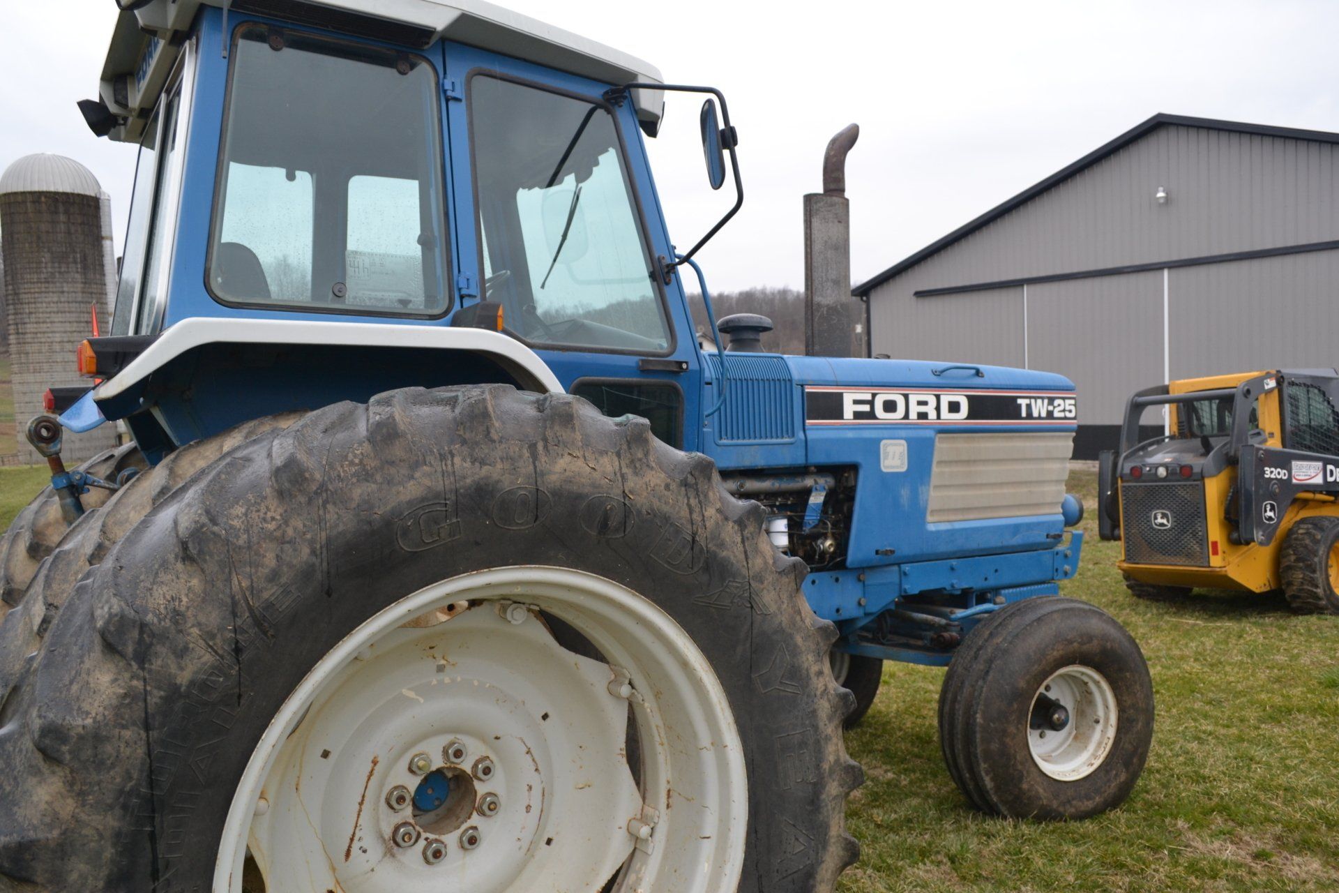 John Deere 320D-cab, AC, electric disconnect, 571 hours; 72” John Deere rotary cutter; Bale Spear; Pilot Forks; Grapple; Post Hole Digger-9”, 12”, 15” auger; Tracks