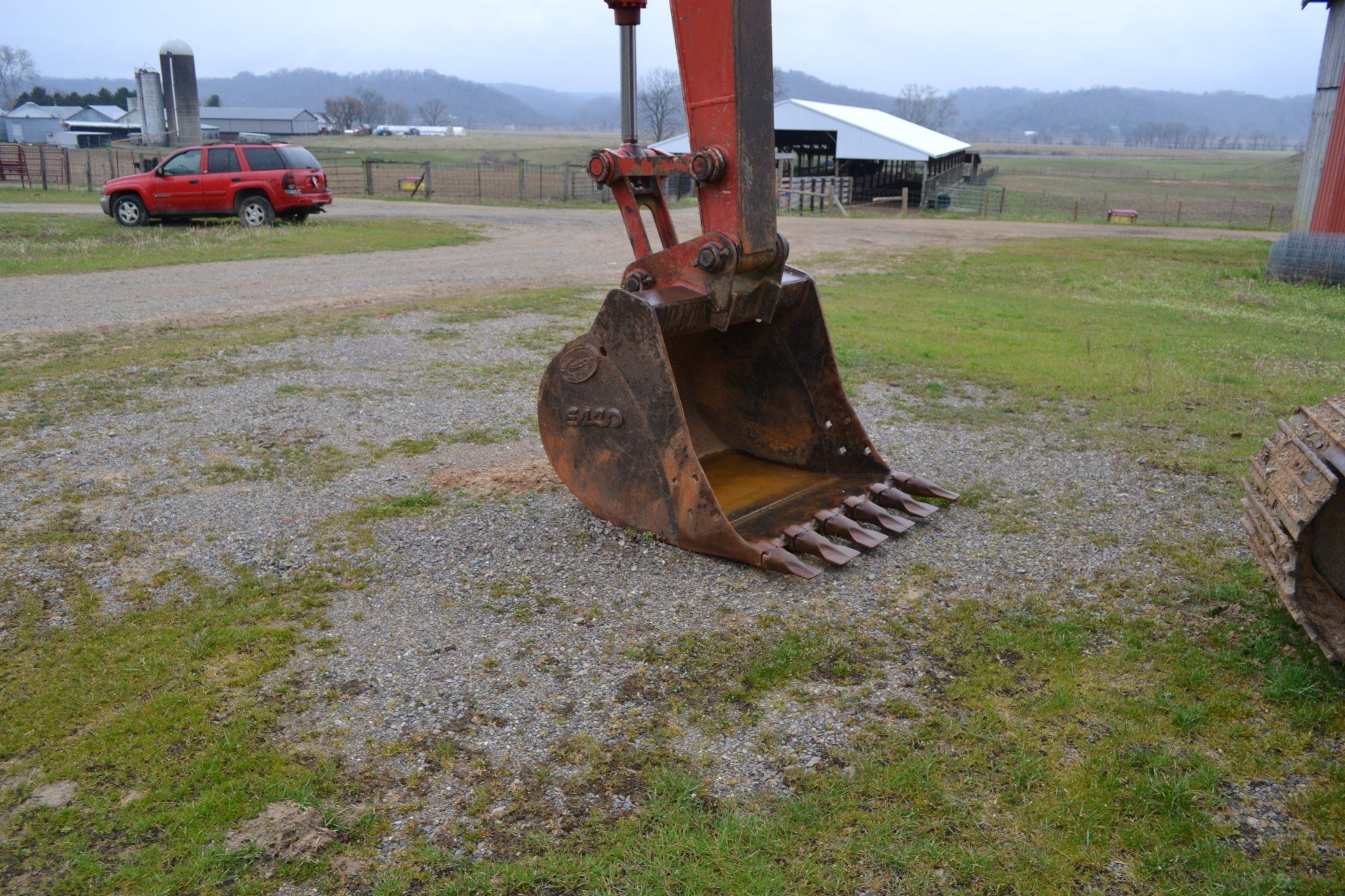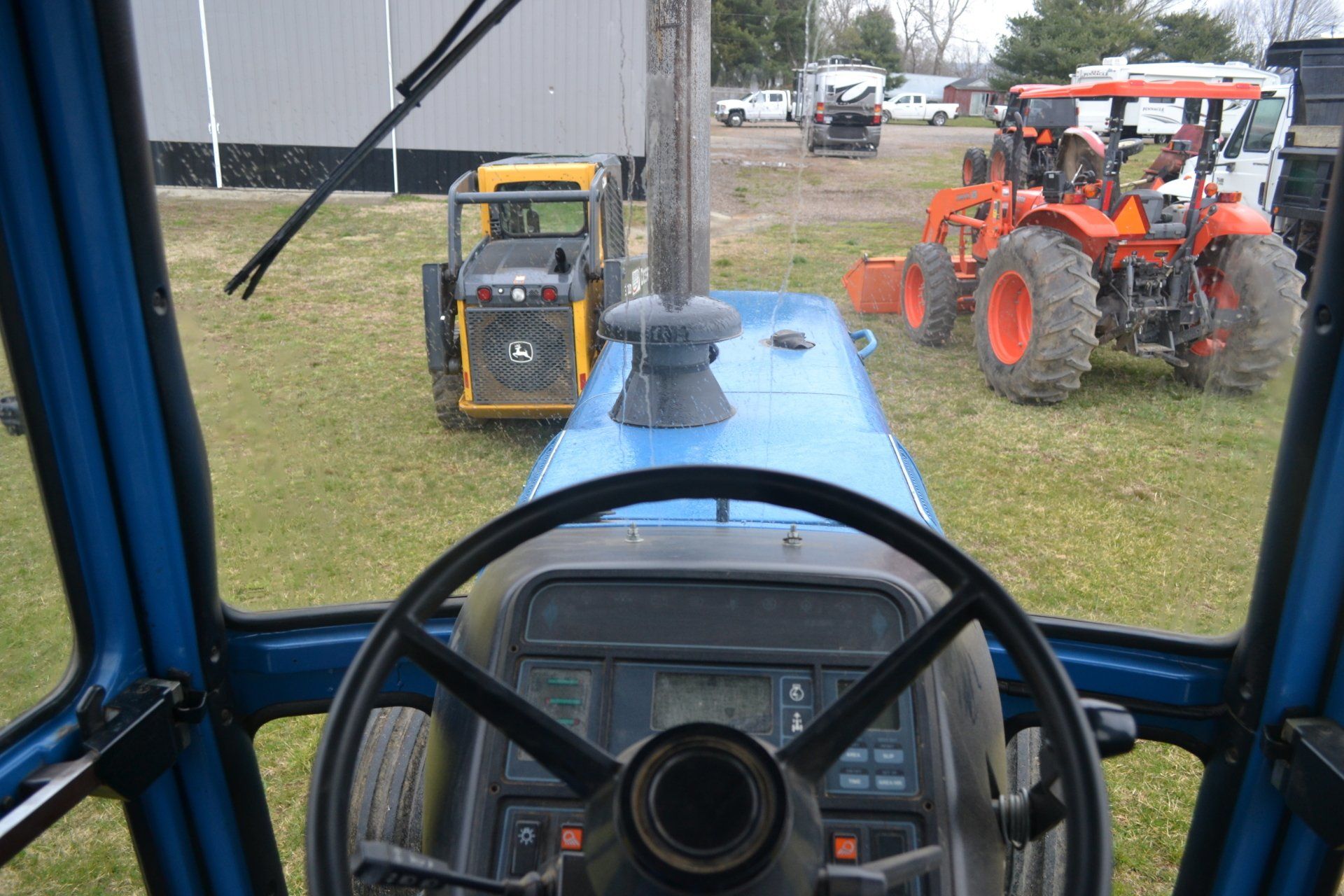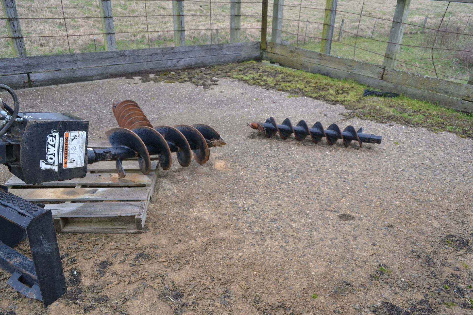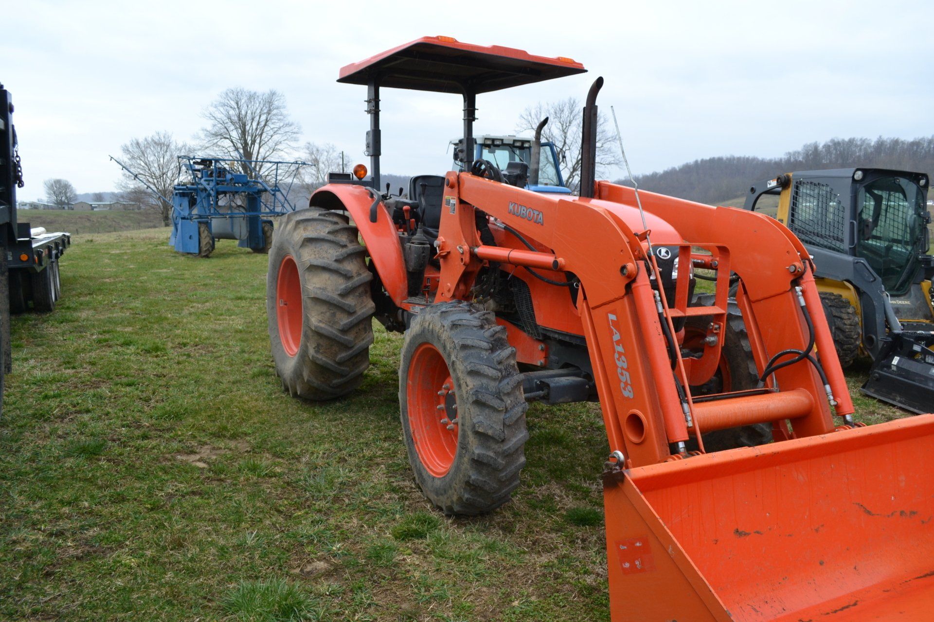 John Deere 320D-cab, AC, electric disconnect, 571 hours; 72” John Deere rotary cutter; Bale Spear; Pilot Forks; Grapple; Post Hole Digger-9”, 12”, 15” auger; Tracks