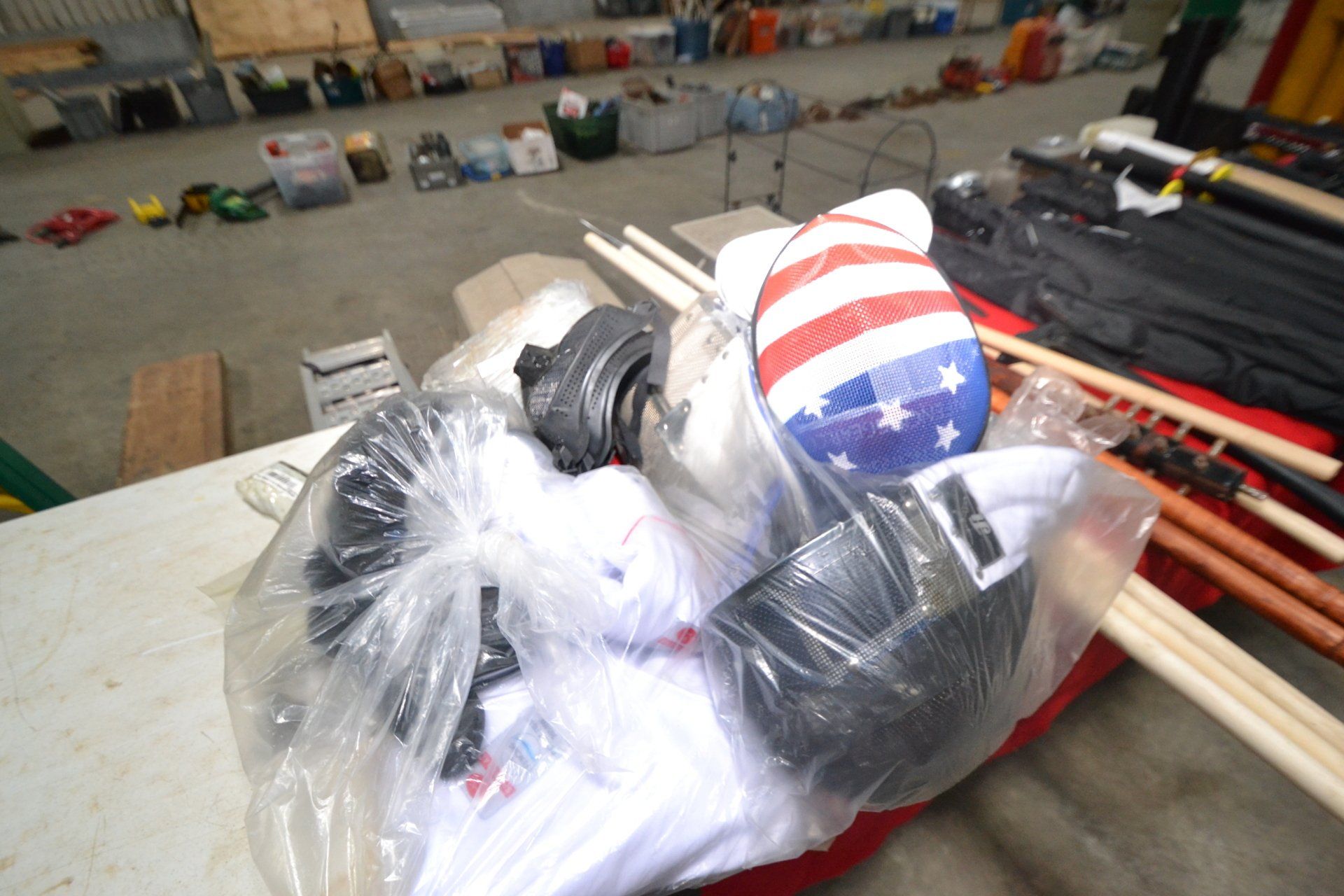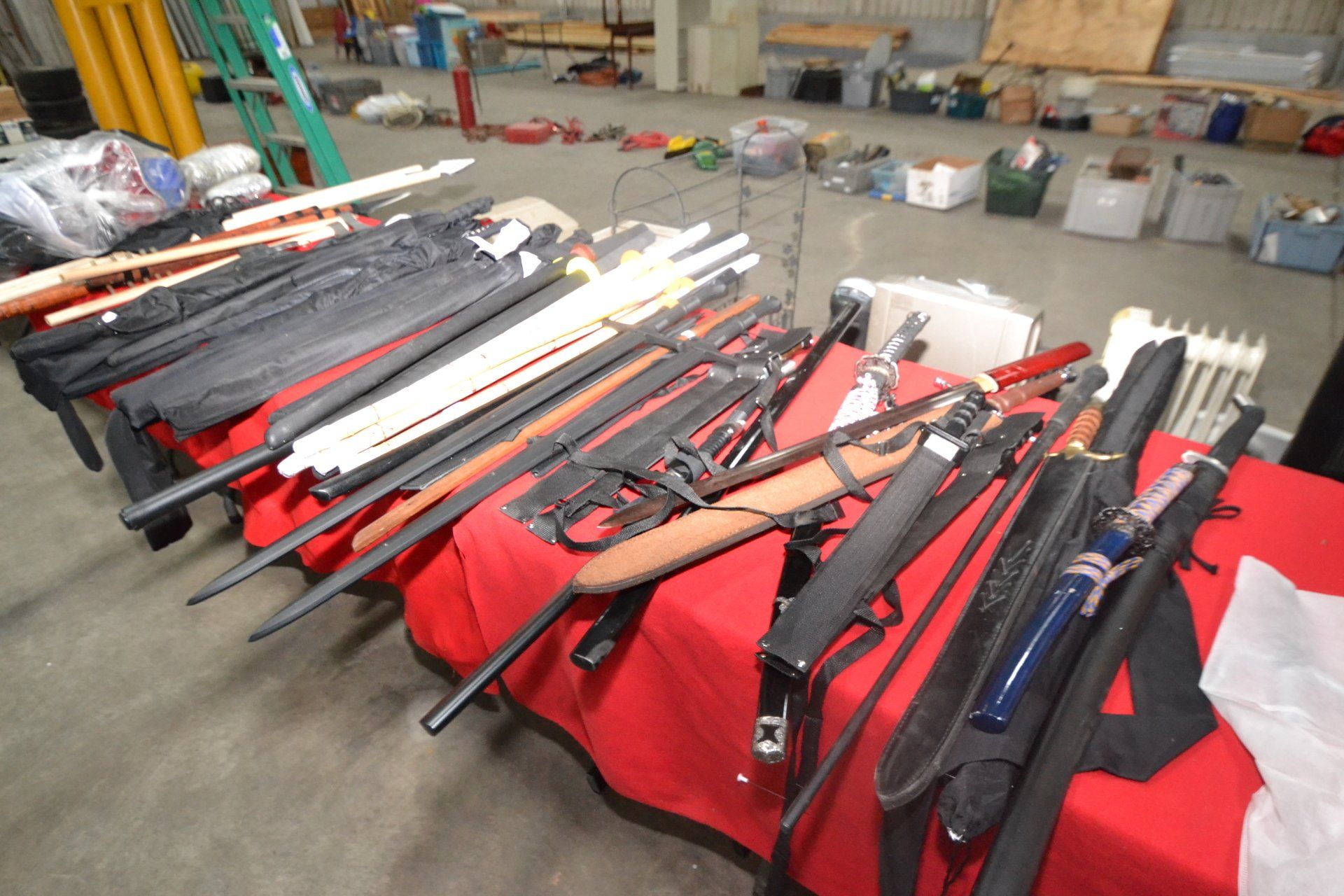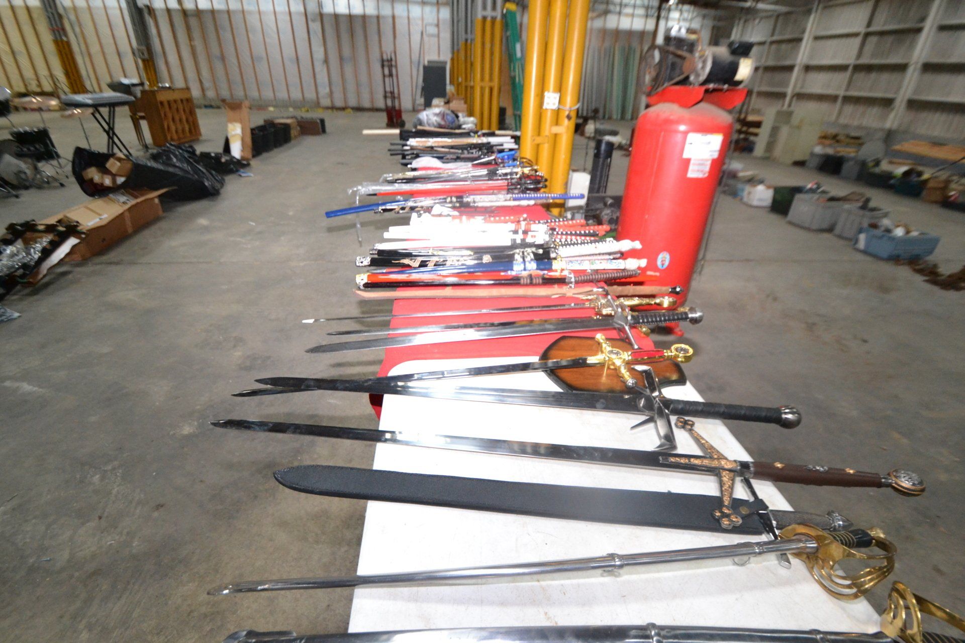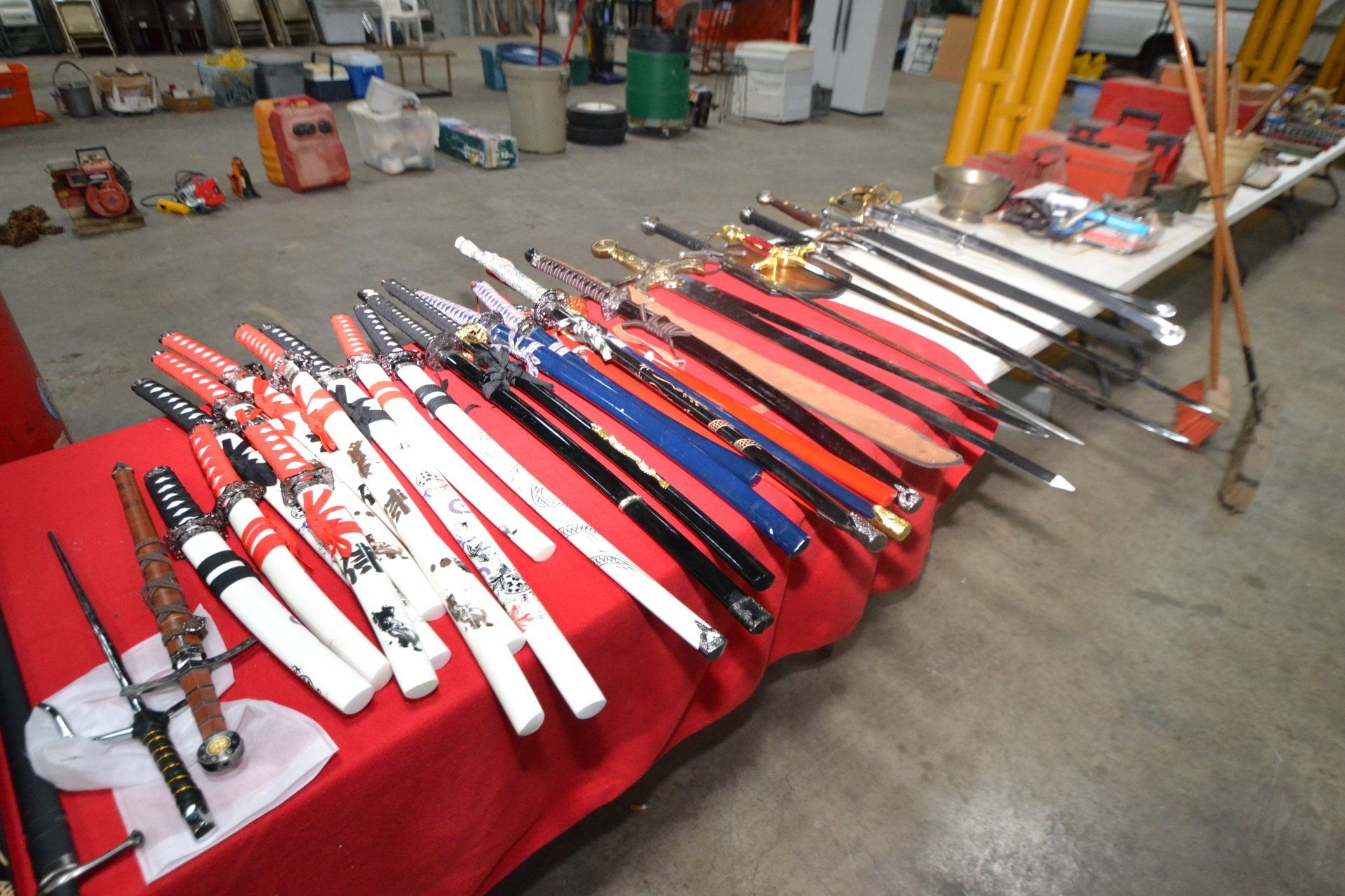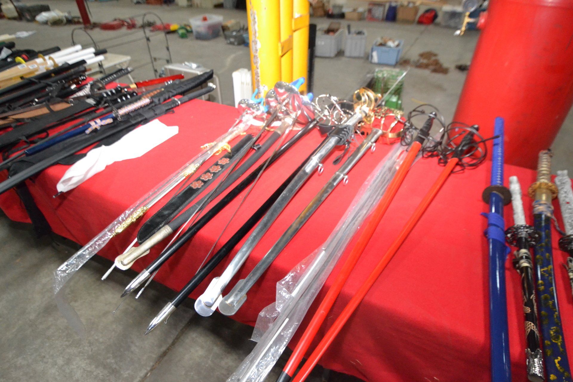 Swords-Admittedly we have no knowledge about swords so we’re hoping you do! We have dozens and dozens of swords, knives, lances, axes, fencing rapiers, protective gear, medieval style chain mail, etc. See photos for more detail.