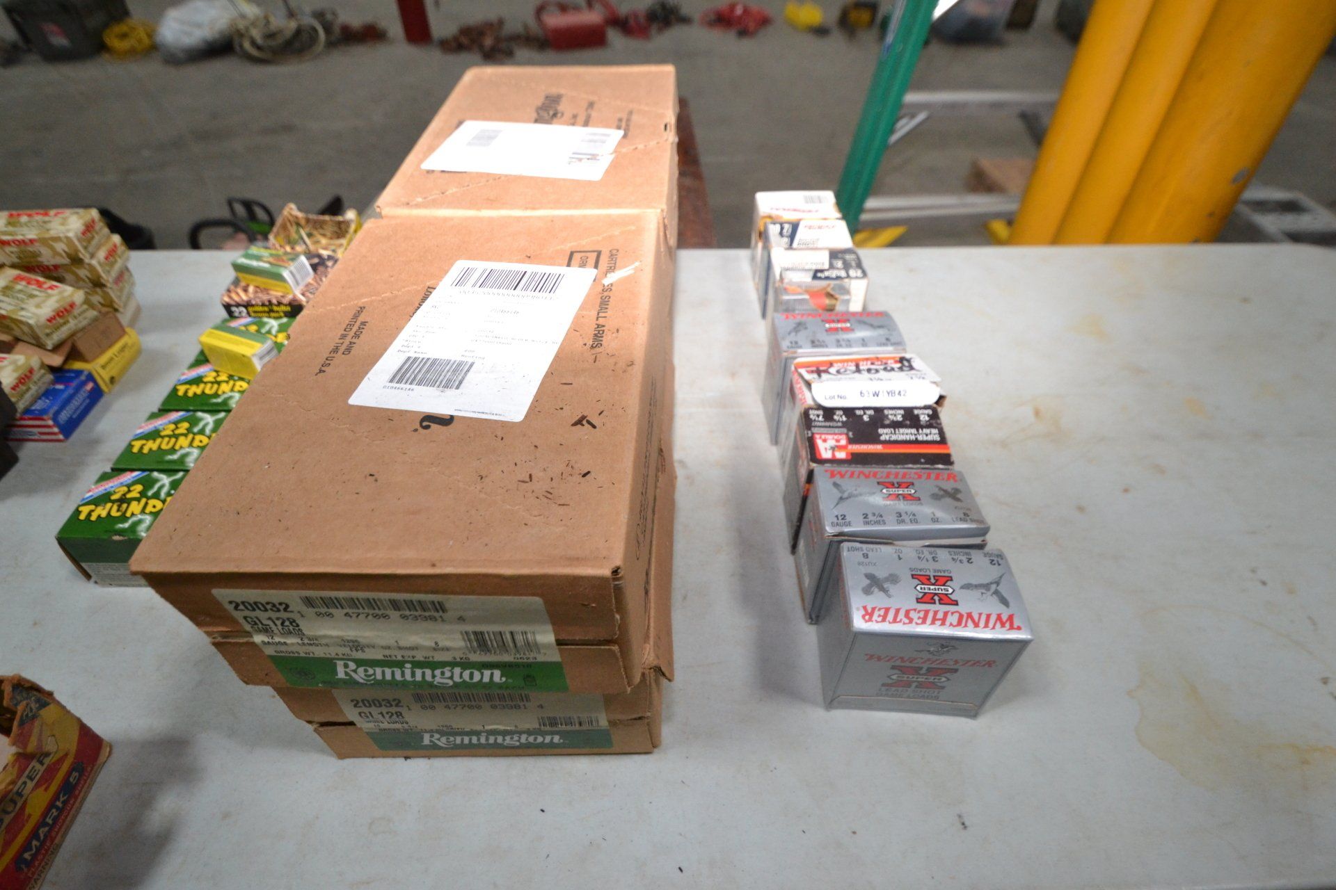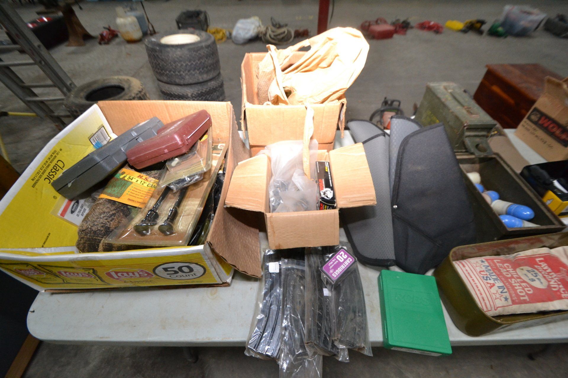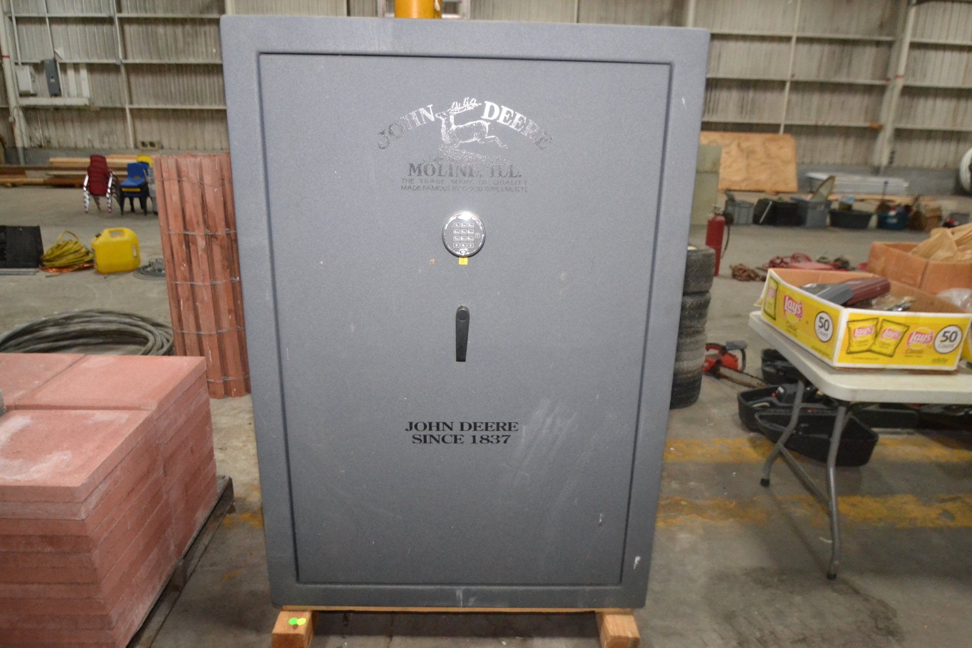 Guns-Large John Deere gun safe, Savage .223 w/ scope, Browning Light 12 shotgun, 12 gauge shotgun w/ pistol grip, old single shot shotgun; 4 cases Remington 12 guage-8 shot; misc. shotgun shells; 4 full bricks of .22 cal; approximately 600 rounds 9mm; 500 rounds .45; 100+ rounds .223; miscellaneous .44, .308; pistol cases; gun cases; targets; boxes and boxes of clay pigeons.