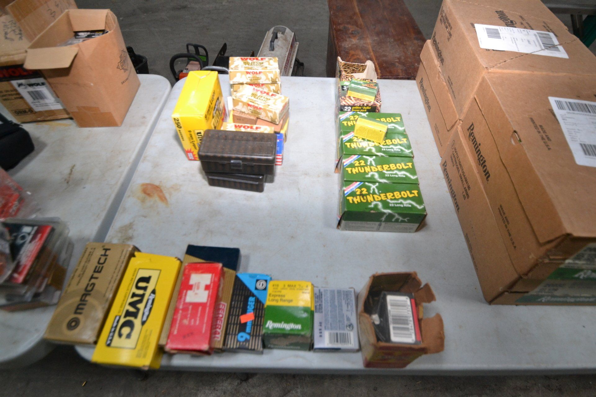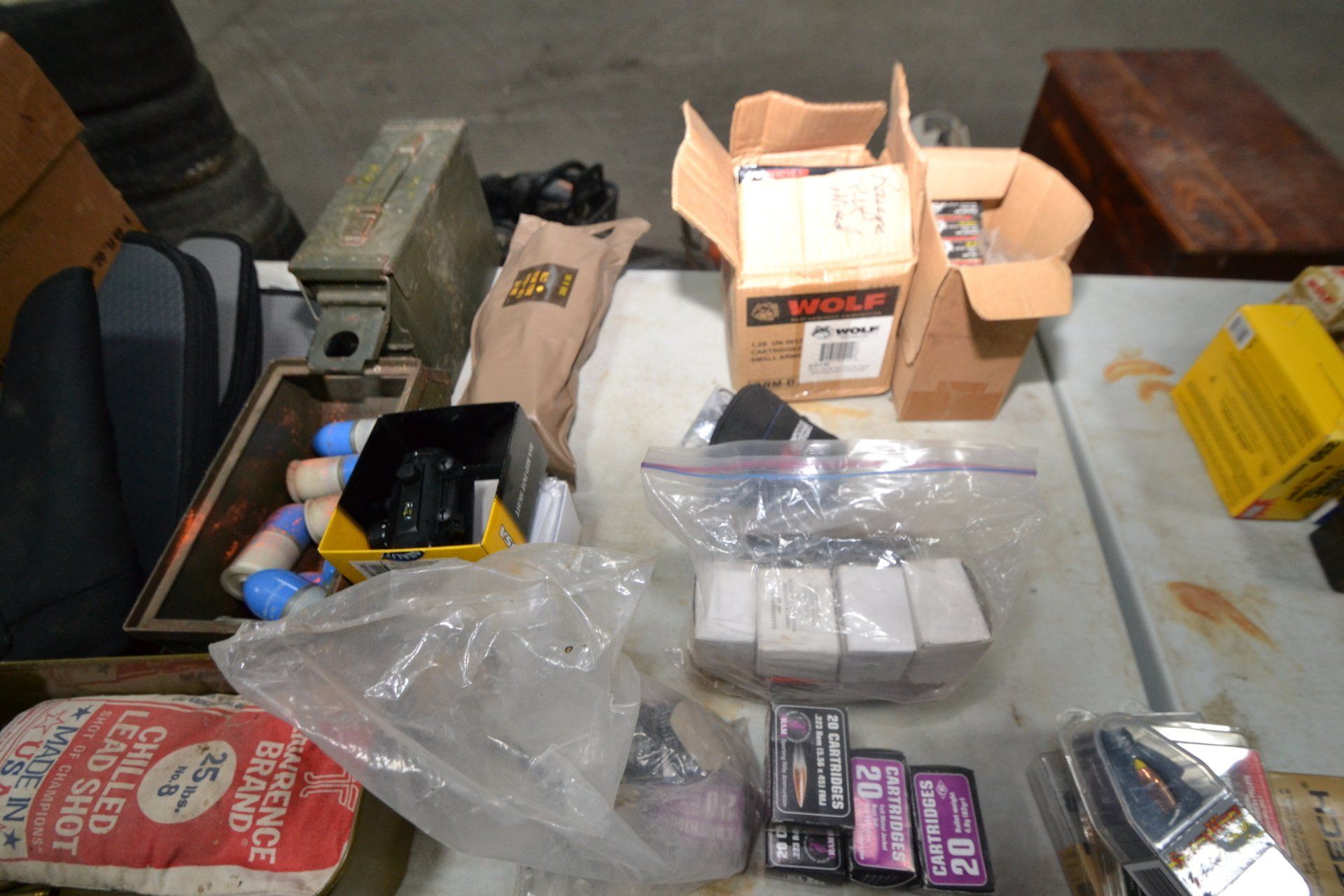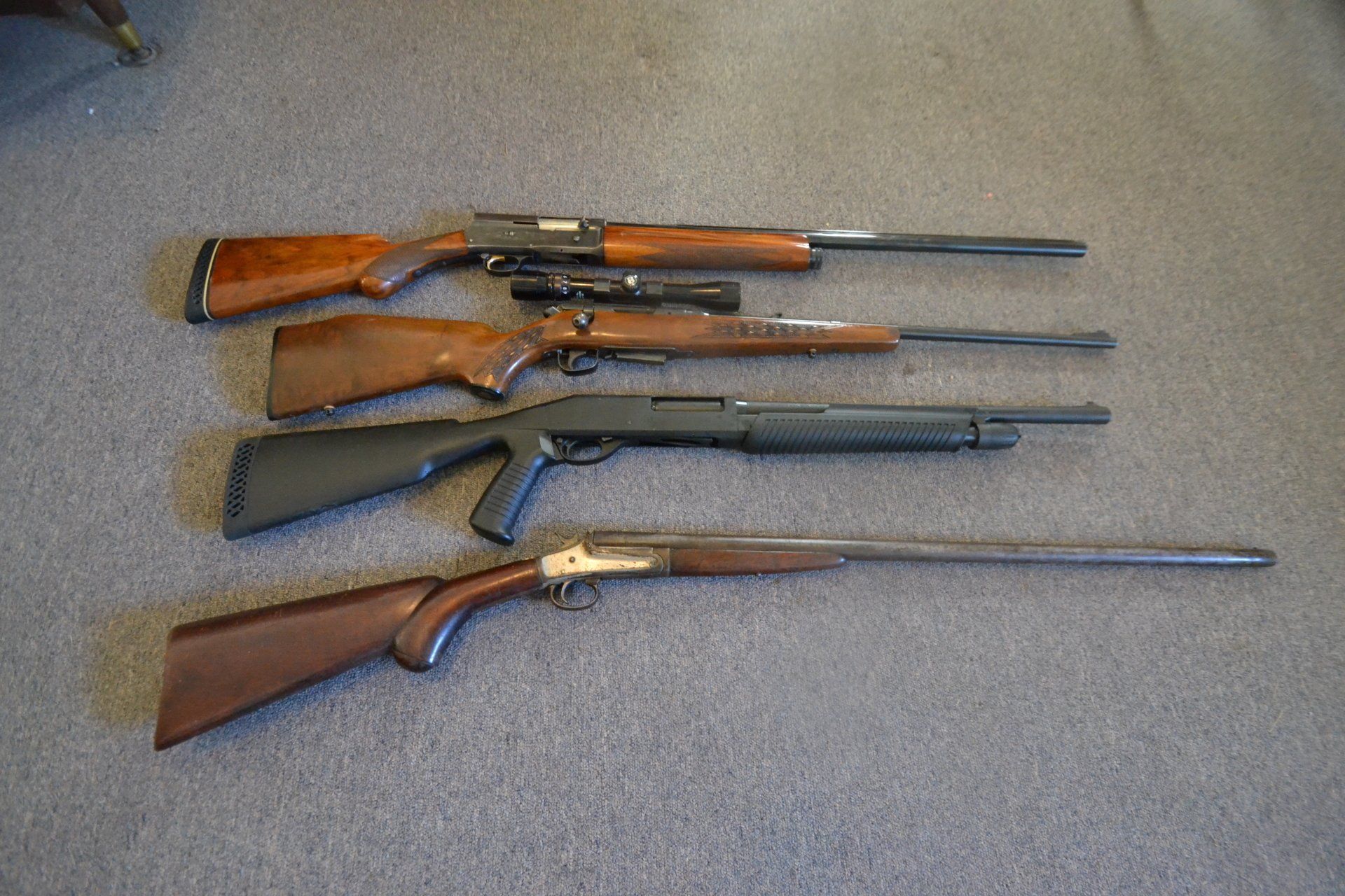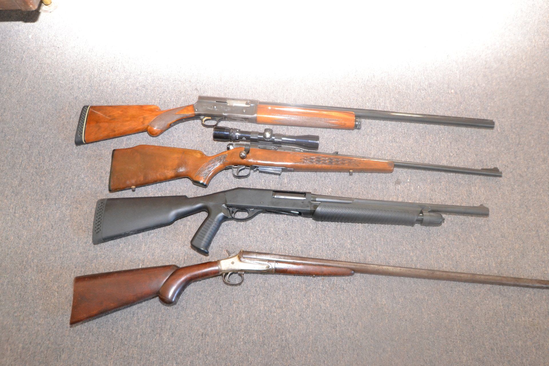 Guns-Large John Deere gun safe, Savage .223 w/ scope, Browning Light 12 shotgun, 12 gauge shotgun w/ pistol grip, old single shot shotgun; 4 cases Remington 12 guage-8 shot; misc. shotgun shells; 4 full bricks of .22 cal; approximately 600 rounds 9mm; 500 rounds .45; 100+ rounds .223; miscellaneous .44, .308; pistol cases; gun cases; targets; boxes and boxes of clay pigeons.