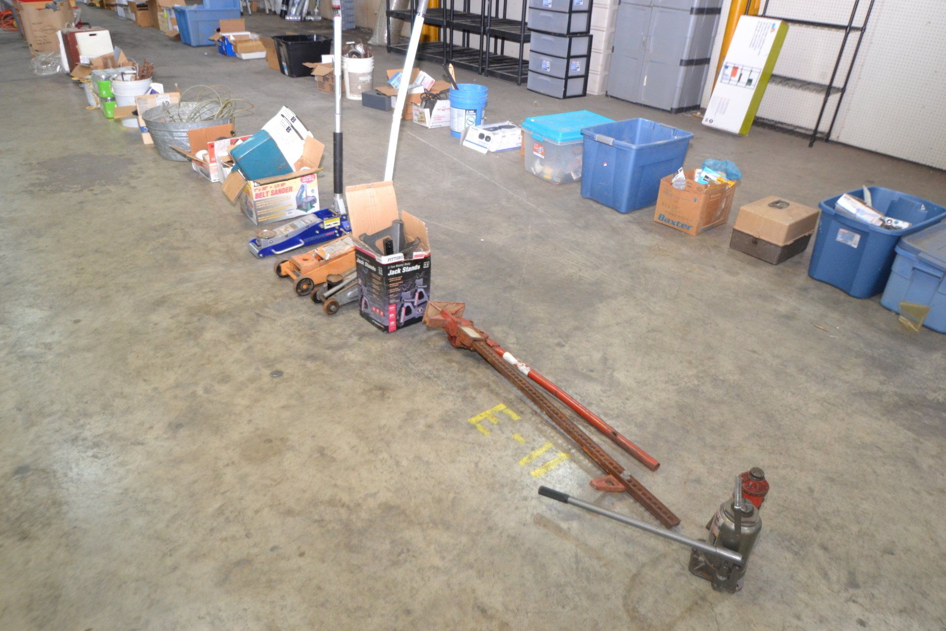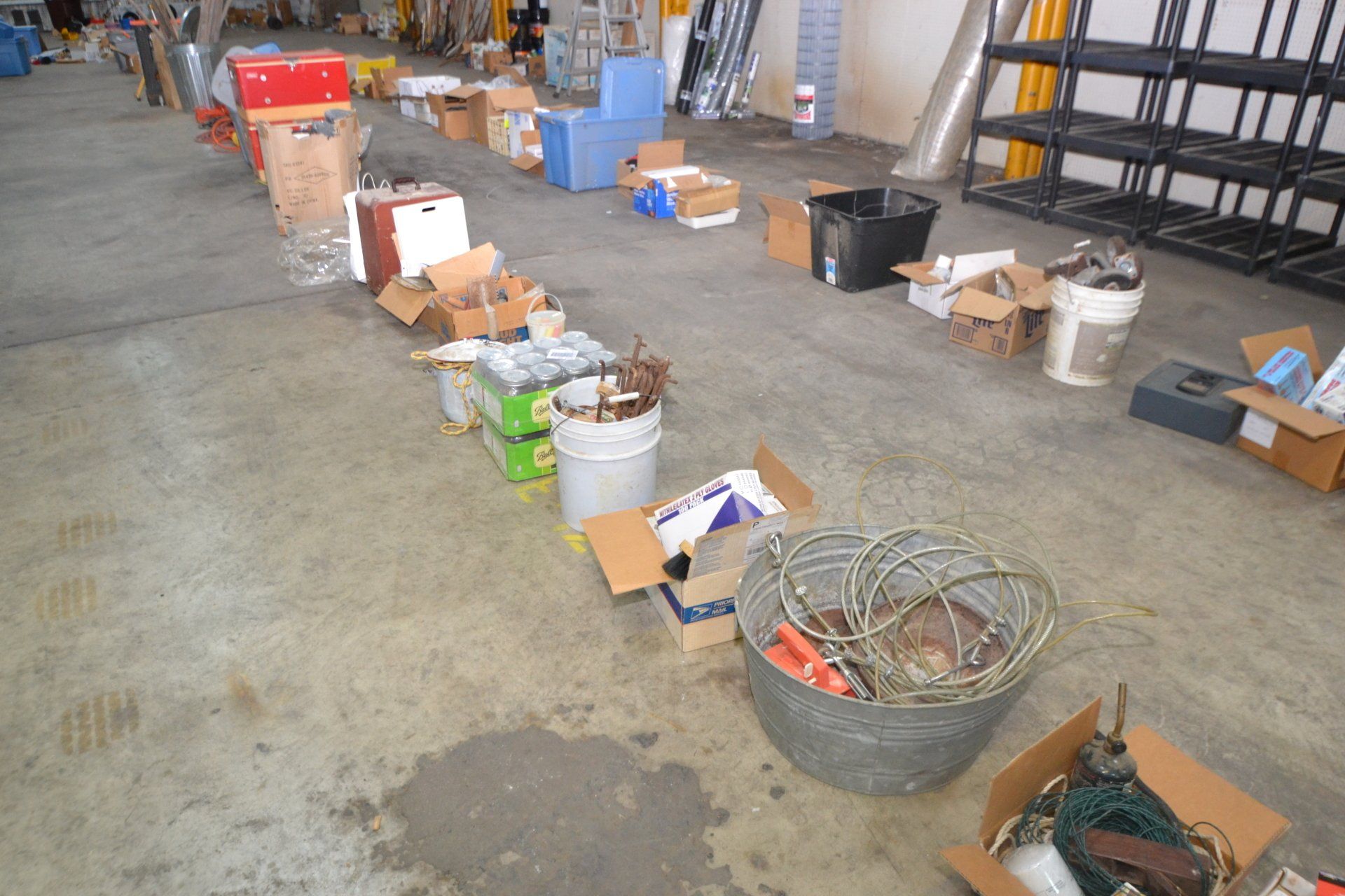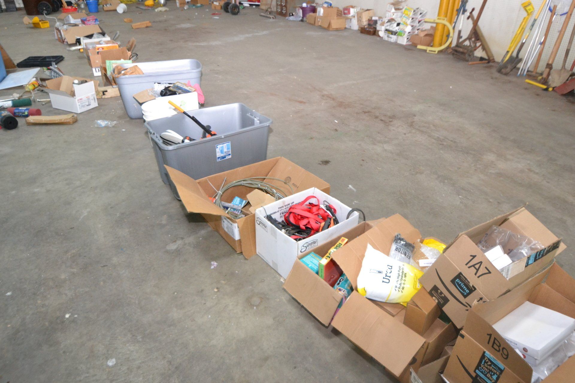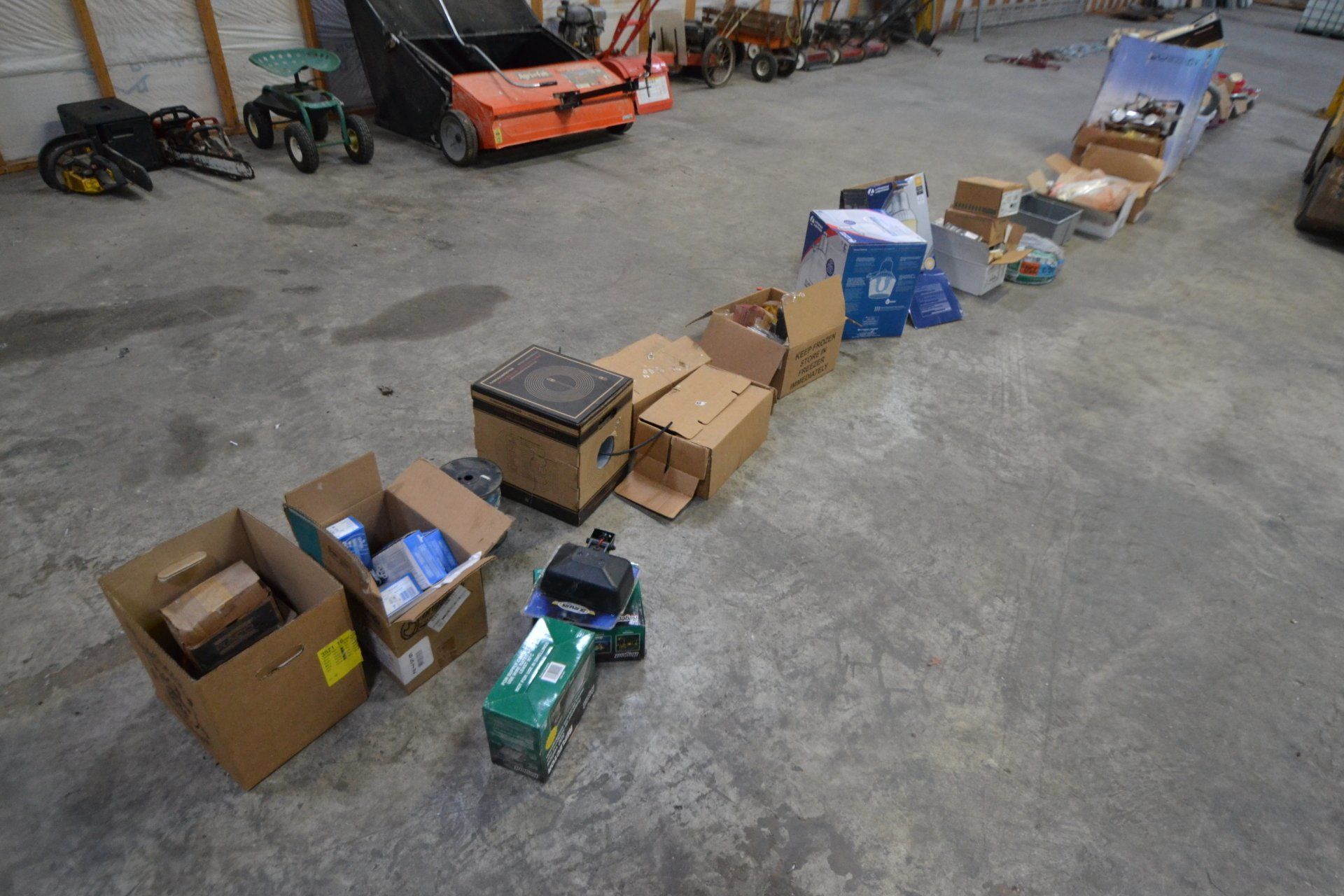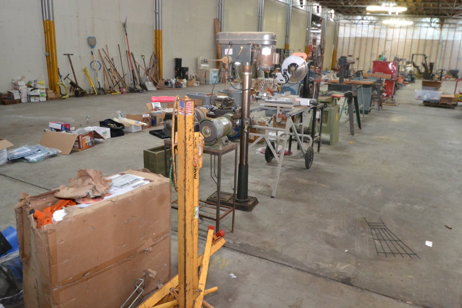 Miscellaneous-new cement mixer; power drain opener; tool cabinets; tool boxes; drill presses; bench grinders; large airless paint sprayer; port-a-powers; floor jacks; hoses; cords; cabinets; shelves; power washer; new LP gas heaters; folding shop crane; boxes of new electric and plumbing parts; panels; breakers; wire; outlets; brass PVC and much, much more.