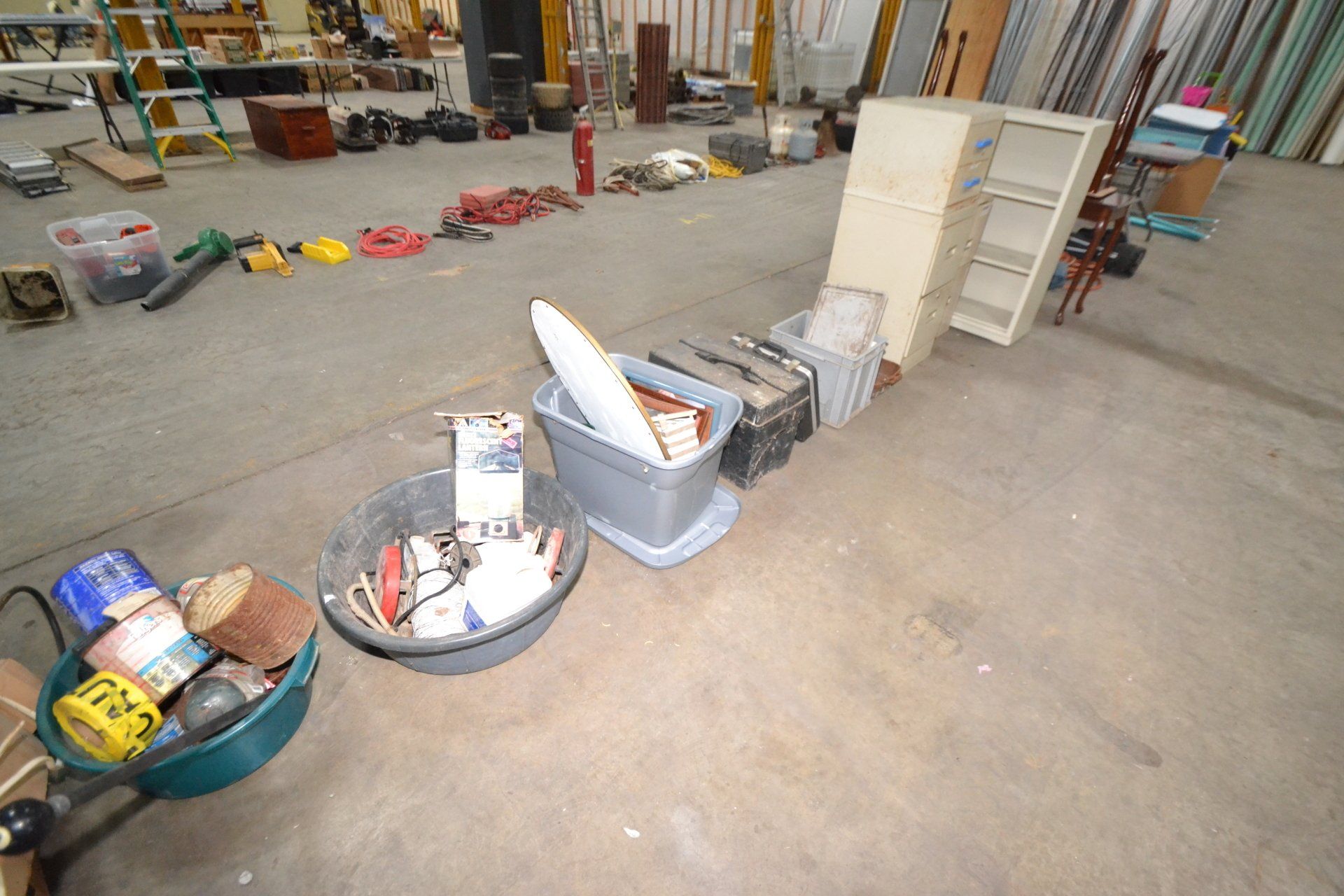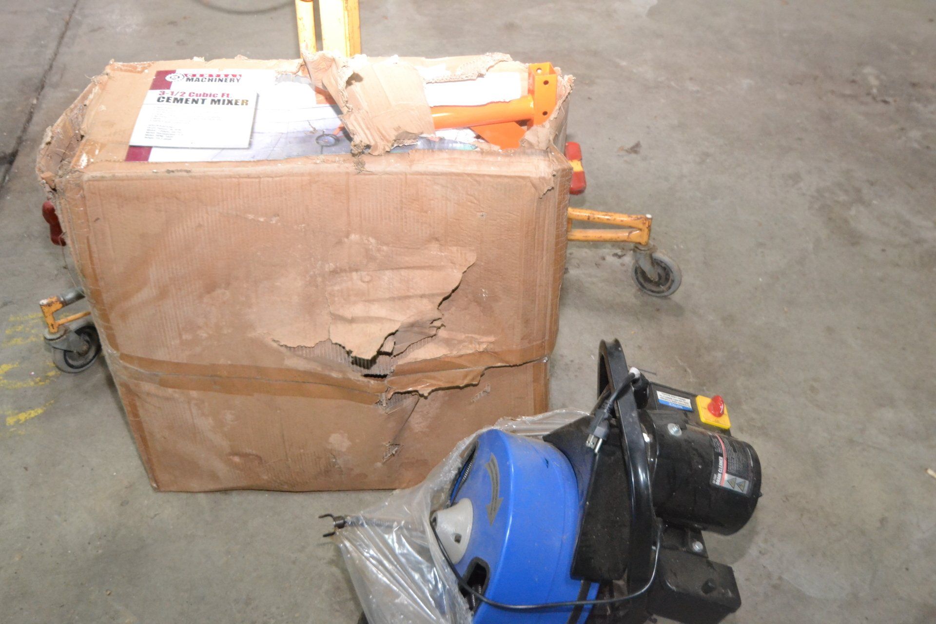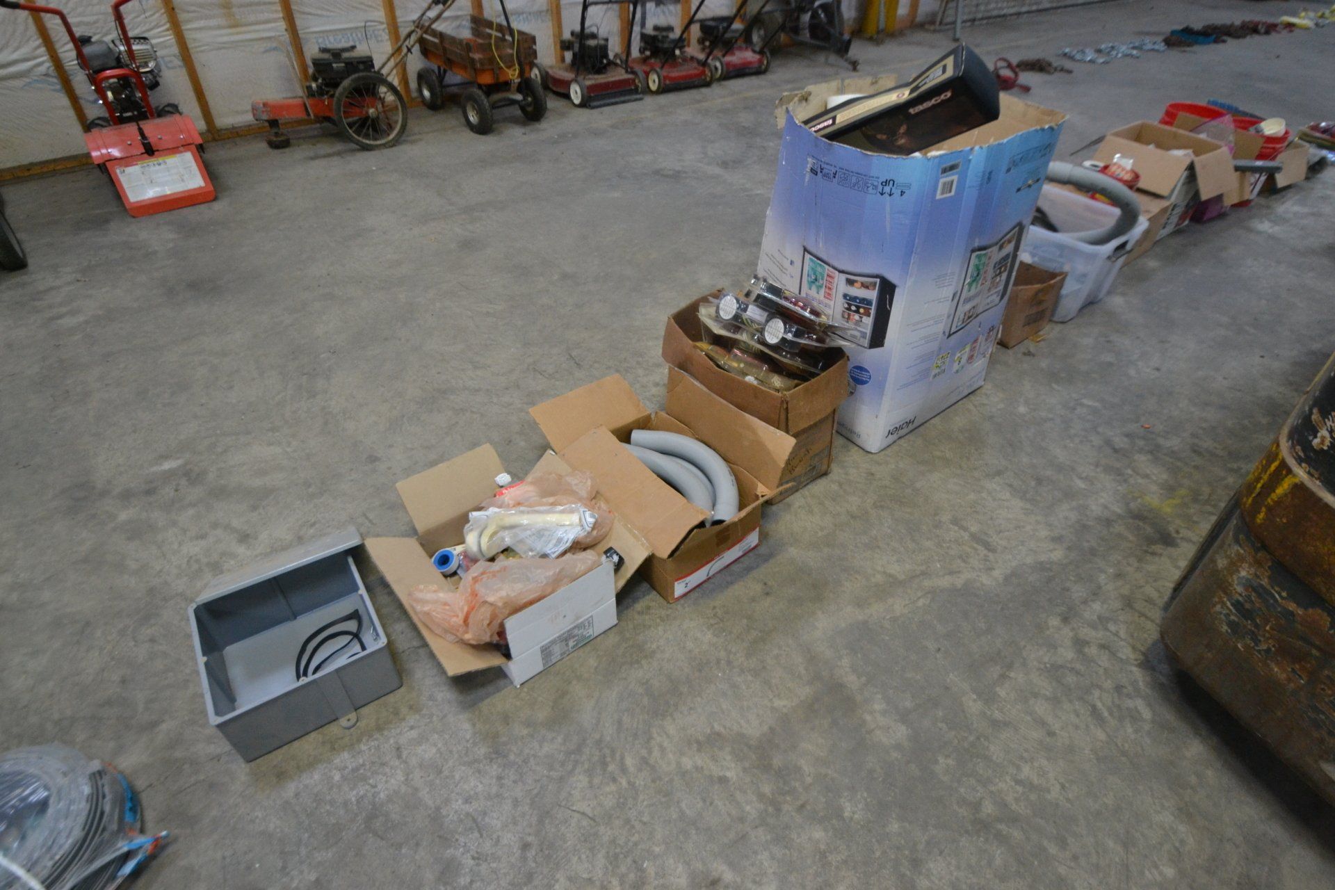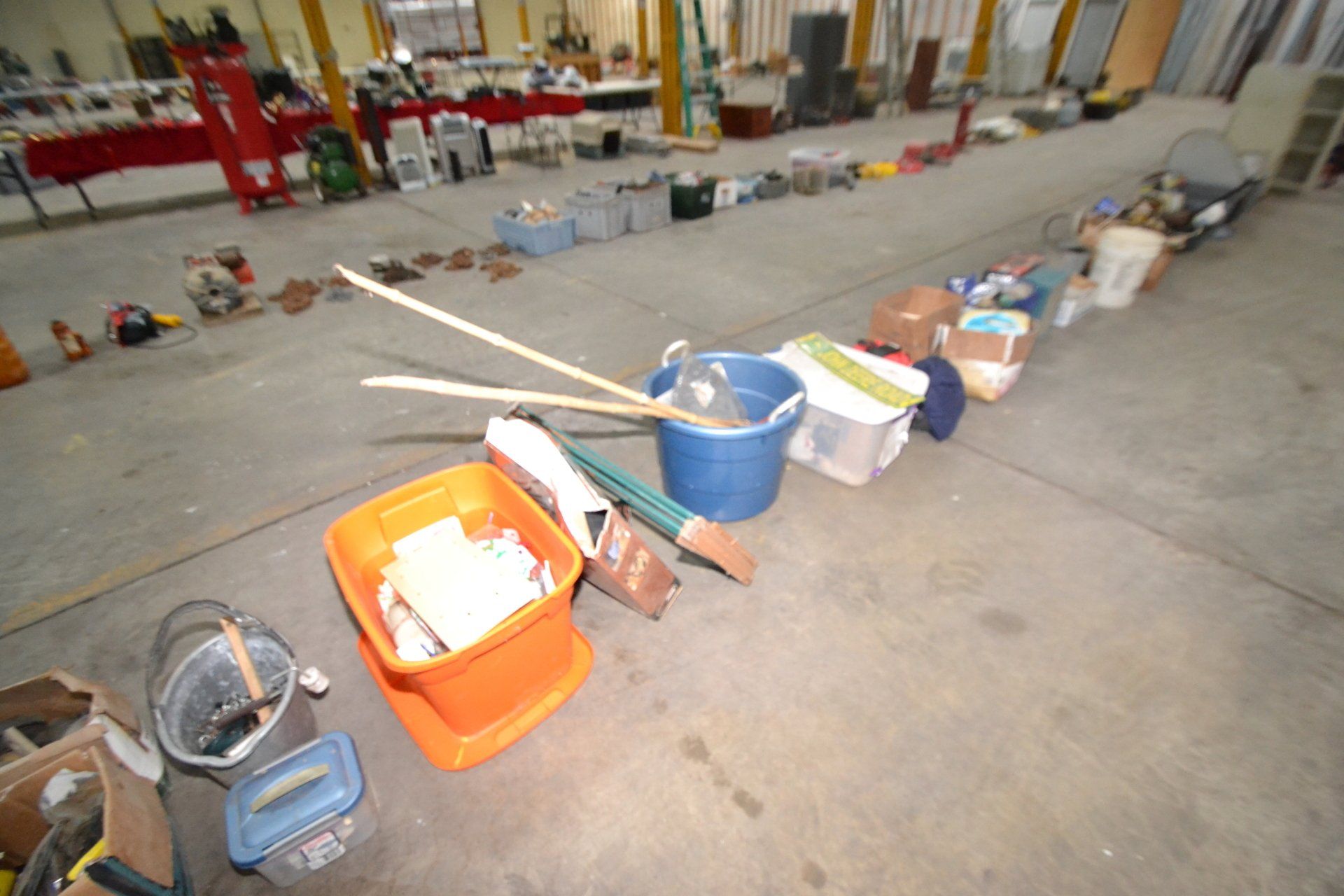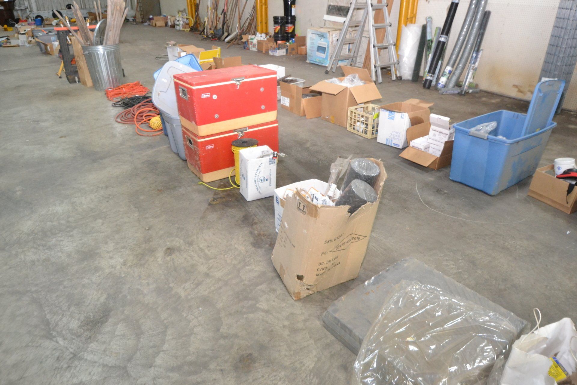 Miscellaneous-new cement mixer; power drain opener; tool cabinets; tool boxes; drill presses; bench grinders; large airless paint sprayer; port-a-powers; floor jacks; hoses; cords; cabinets; shelves; power washer; new LP gas heaters; folding shop crane; boxes of new electric and plumbing parts; panels; breakers; wire; outlets; brass PVC and much, much more.