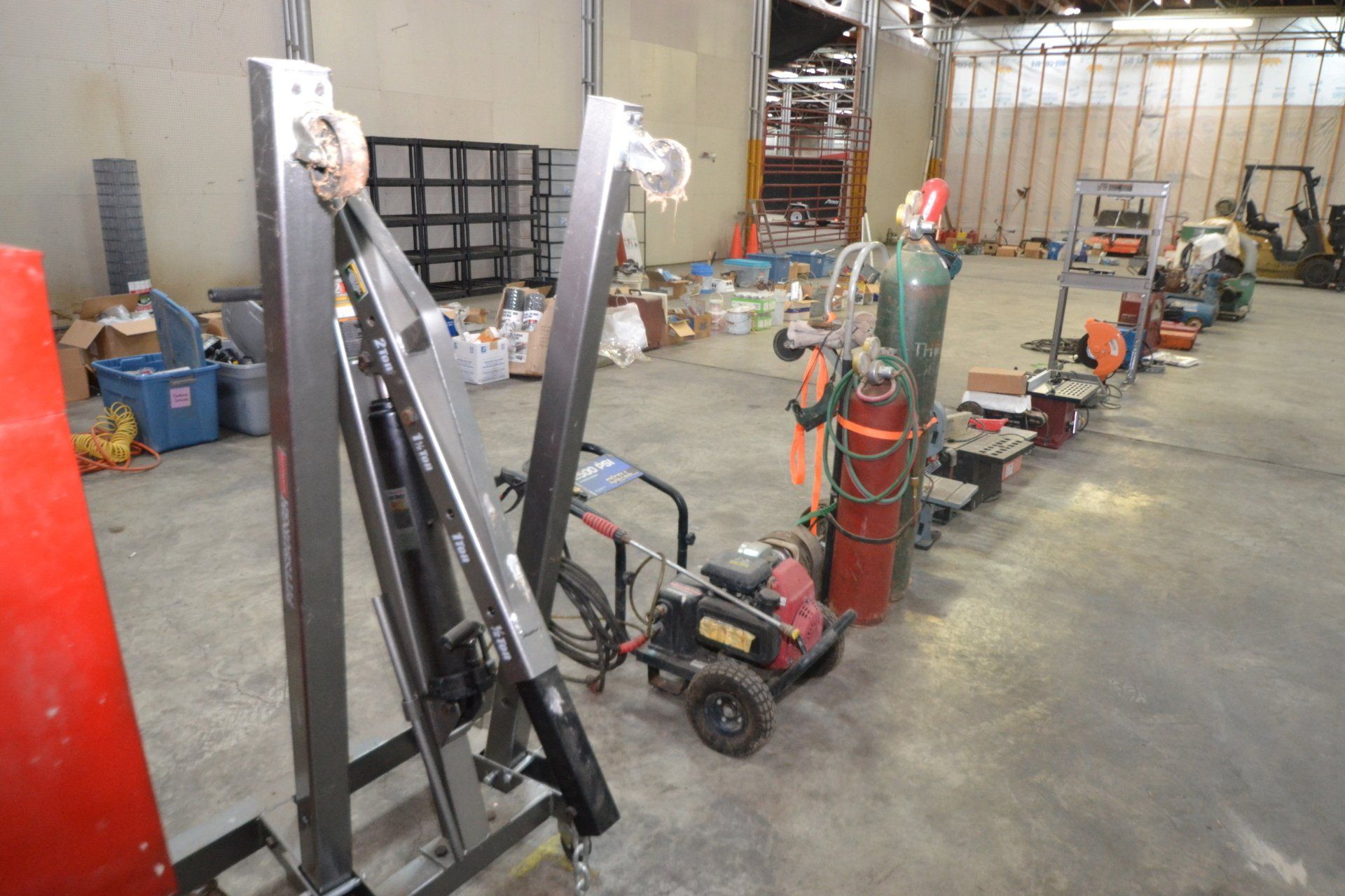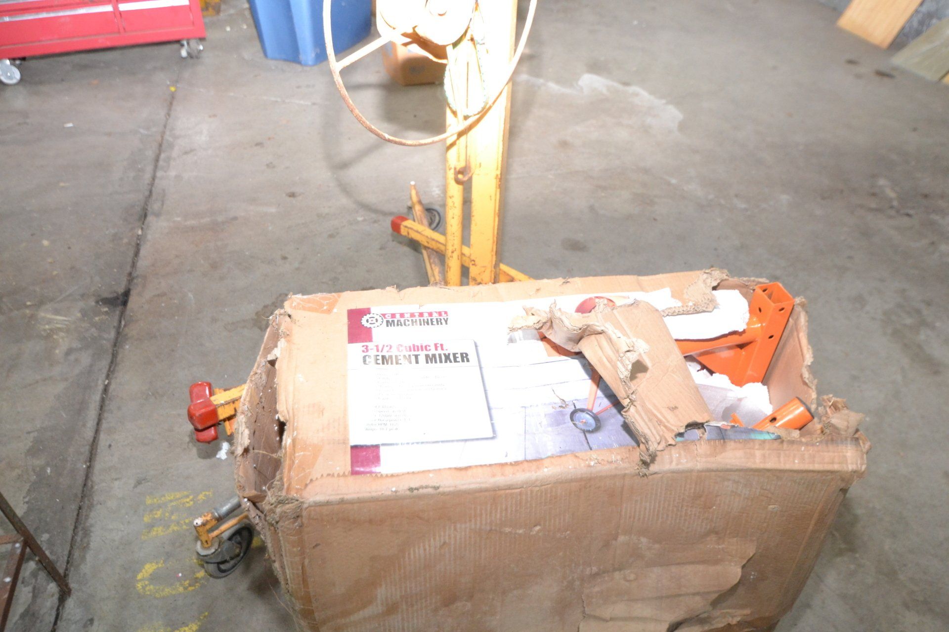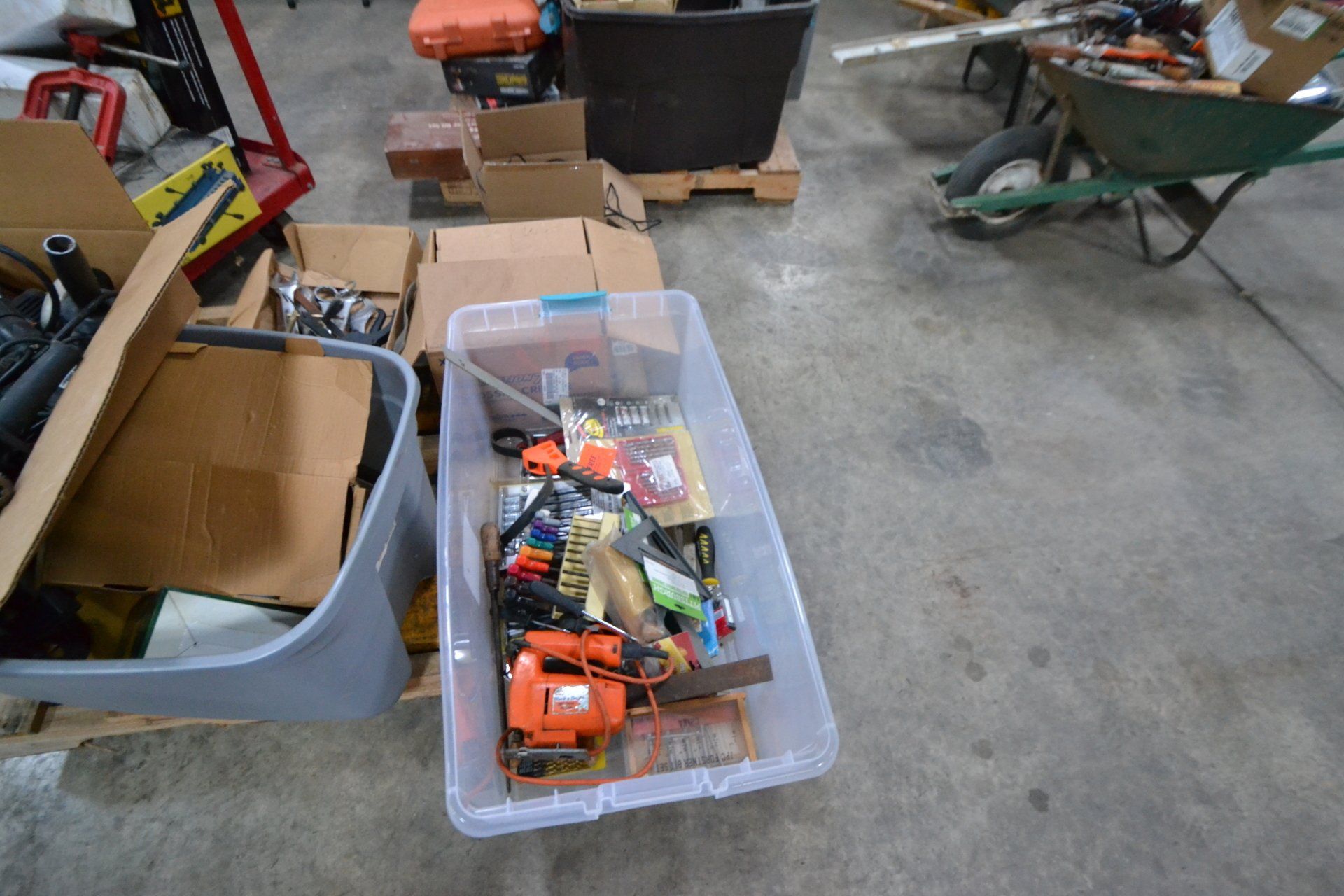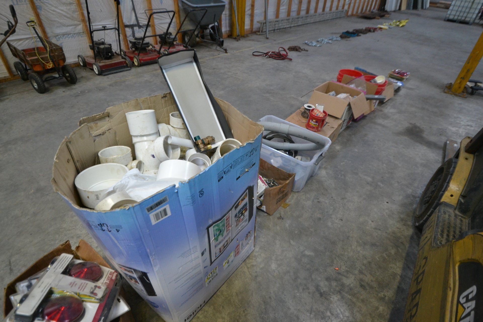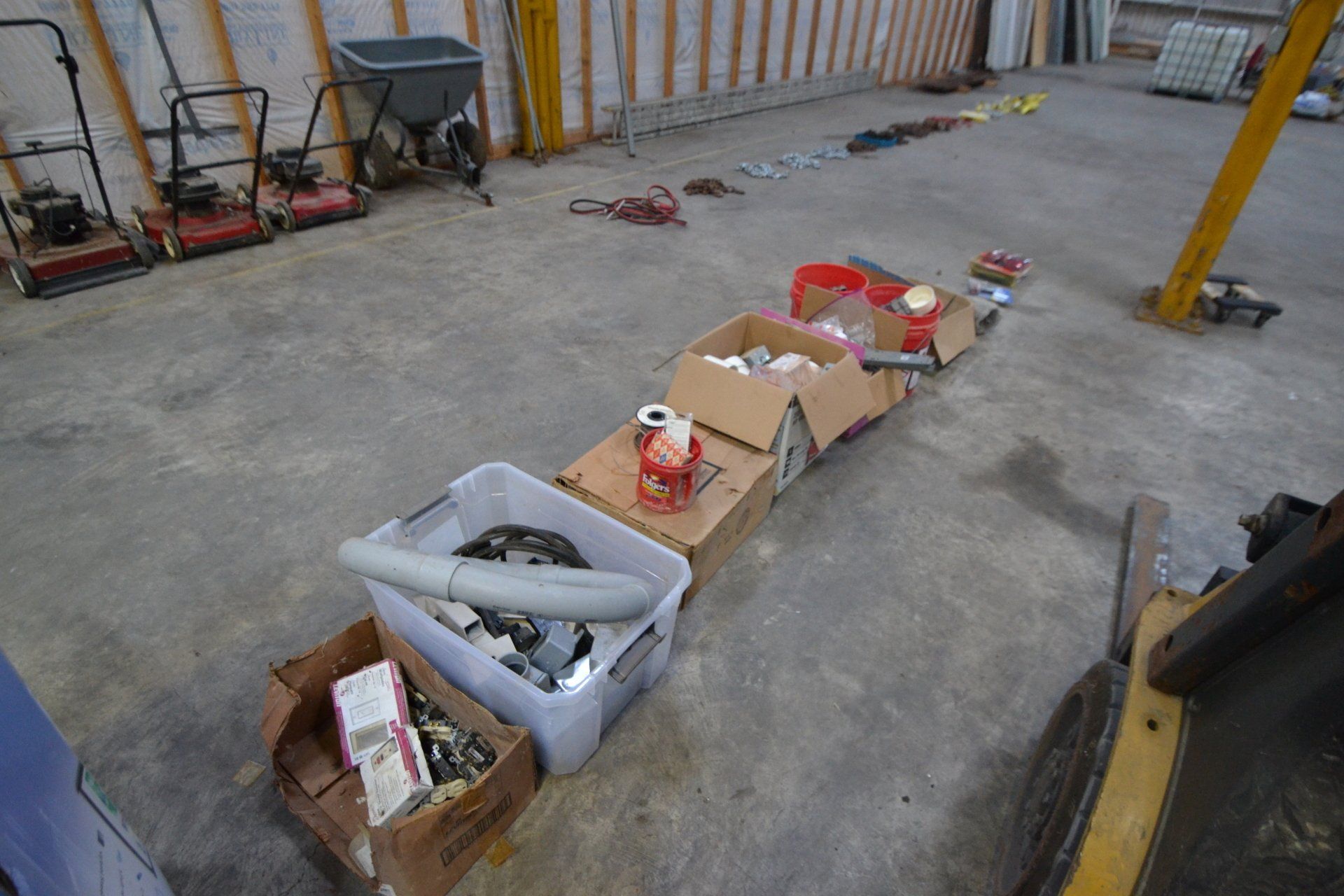 Miscellaneous-new cement mixer; power drain opener; tool cabinets; tool boxes; drill presses; bench grinders; large airless paint sprayer; port-a-powers; floor jacks; hoses; cords; cabinets; shelves; power washer; new LP gas heaters; folding shop crane; boxes of new electric and plumbing parts; panels; breakers; wire; outlets; brass PVC and much, much more.
