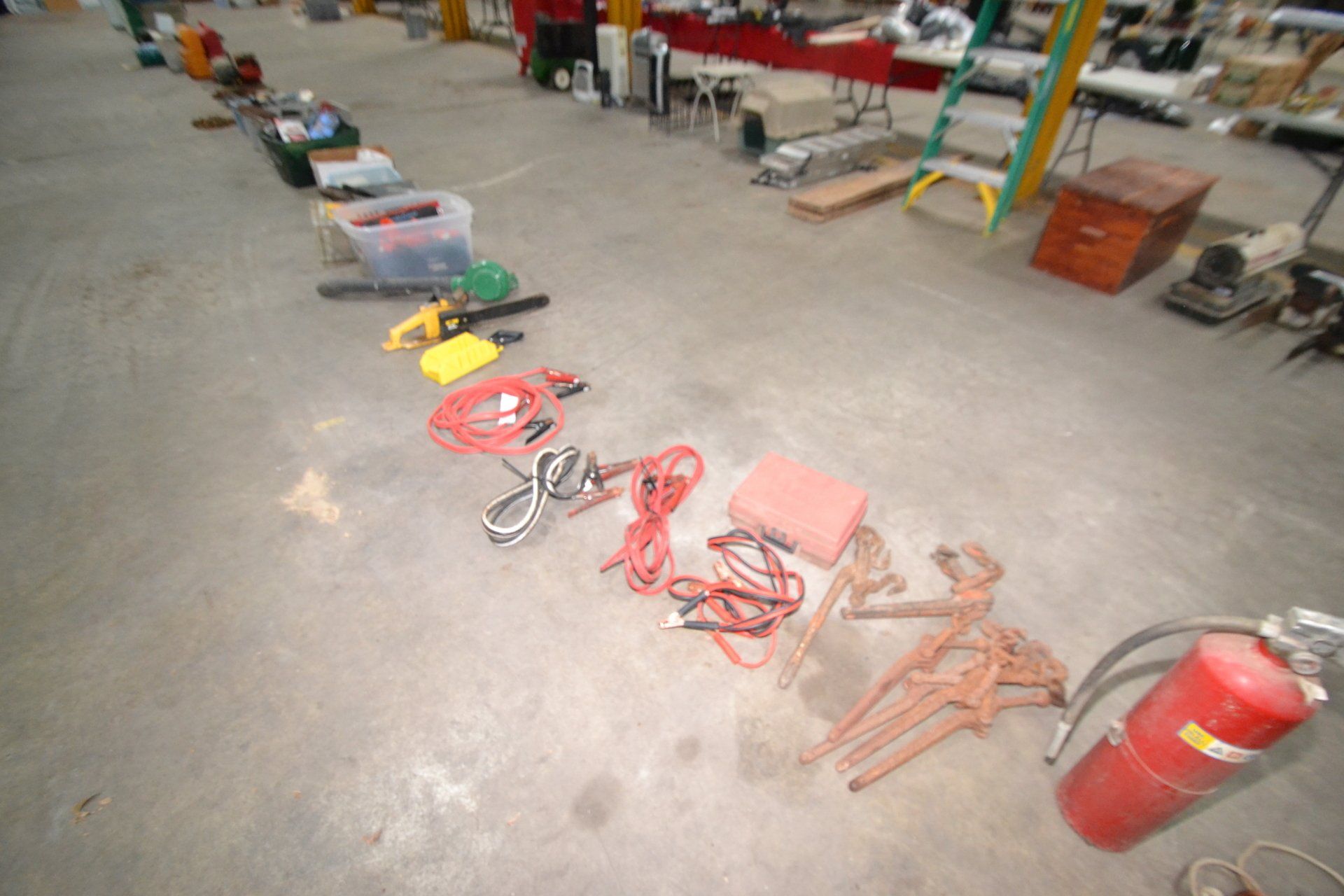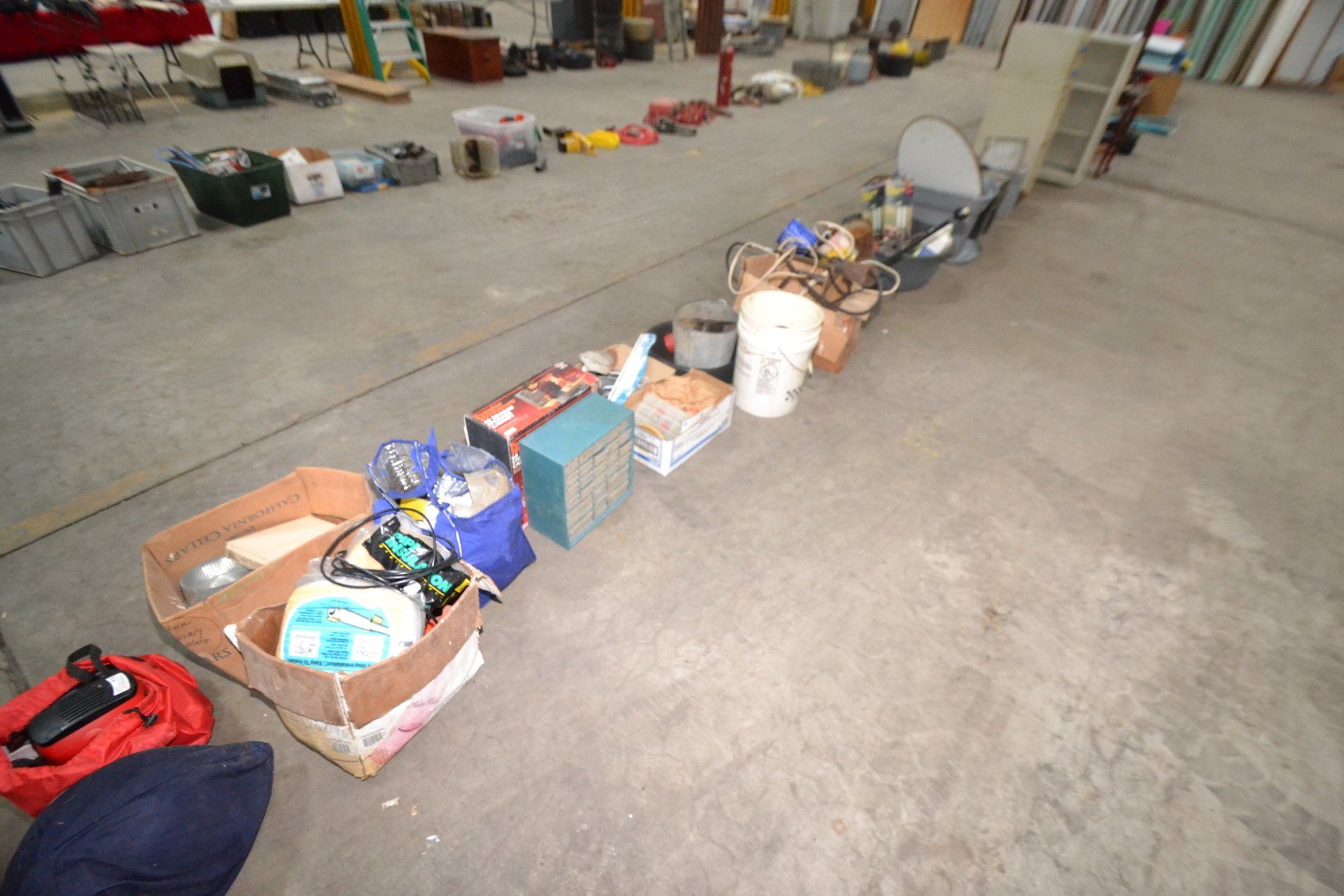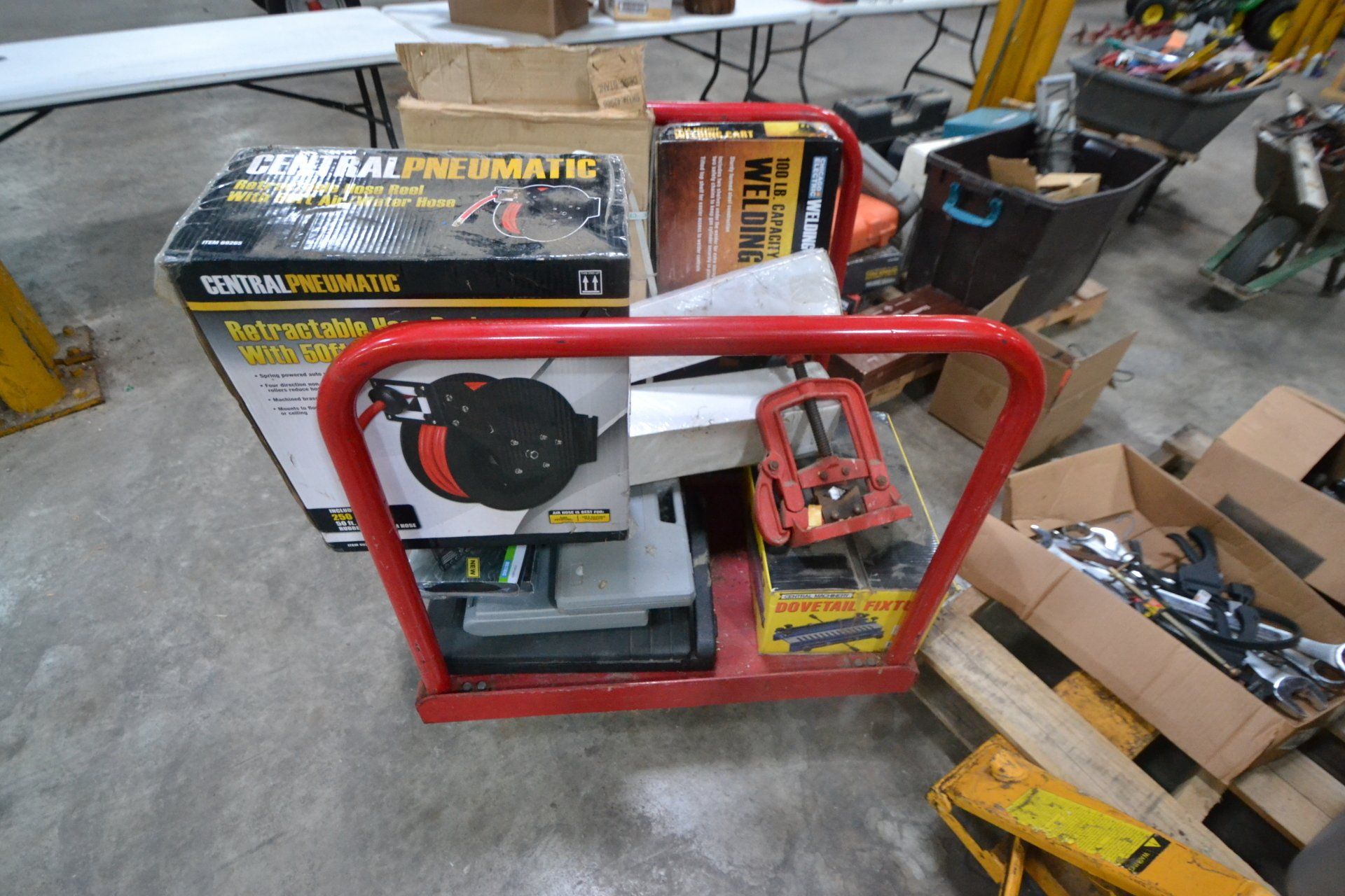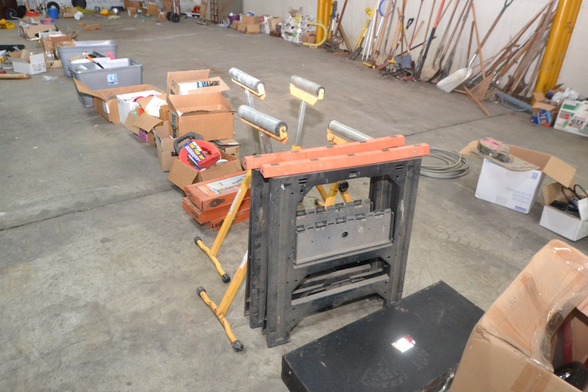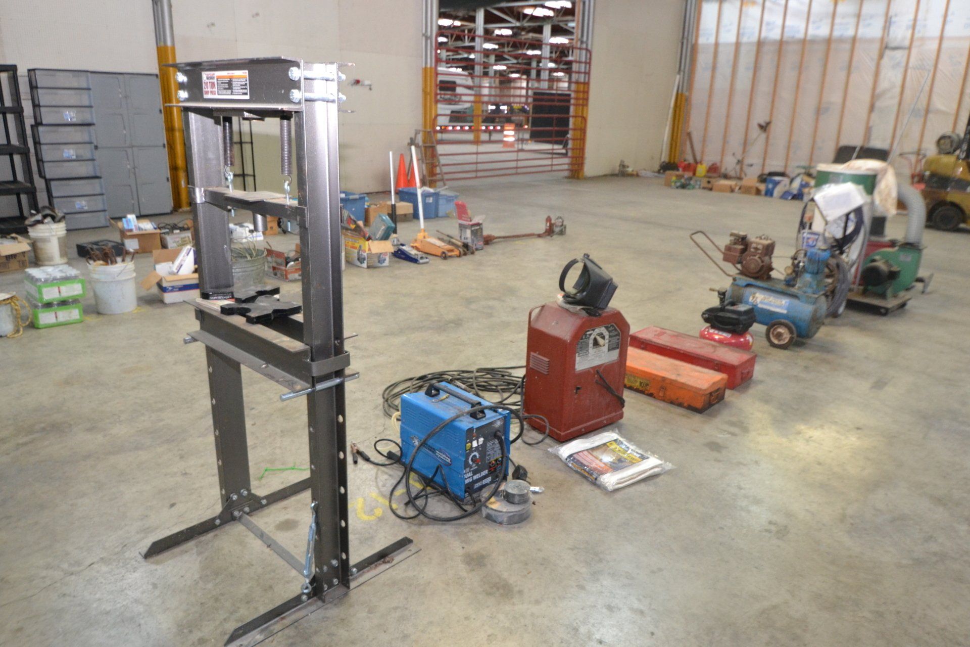 Miscellaneous-new cement mixer; power drain opener; tool cabinets; tool boxes; drill presses; bench grinders; large airless paint sprayer; port-a-powers; floor jacks; hoses; cords; cabinets; shelves; power washer; new LP gas heaters; folding shop crane; boxes of new electric and plumbing parts; panels; breakers; wire; outlets; brass PVC and much, much more.