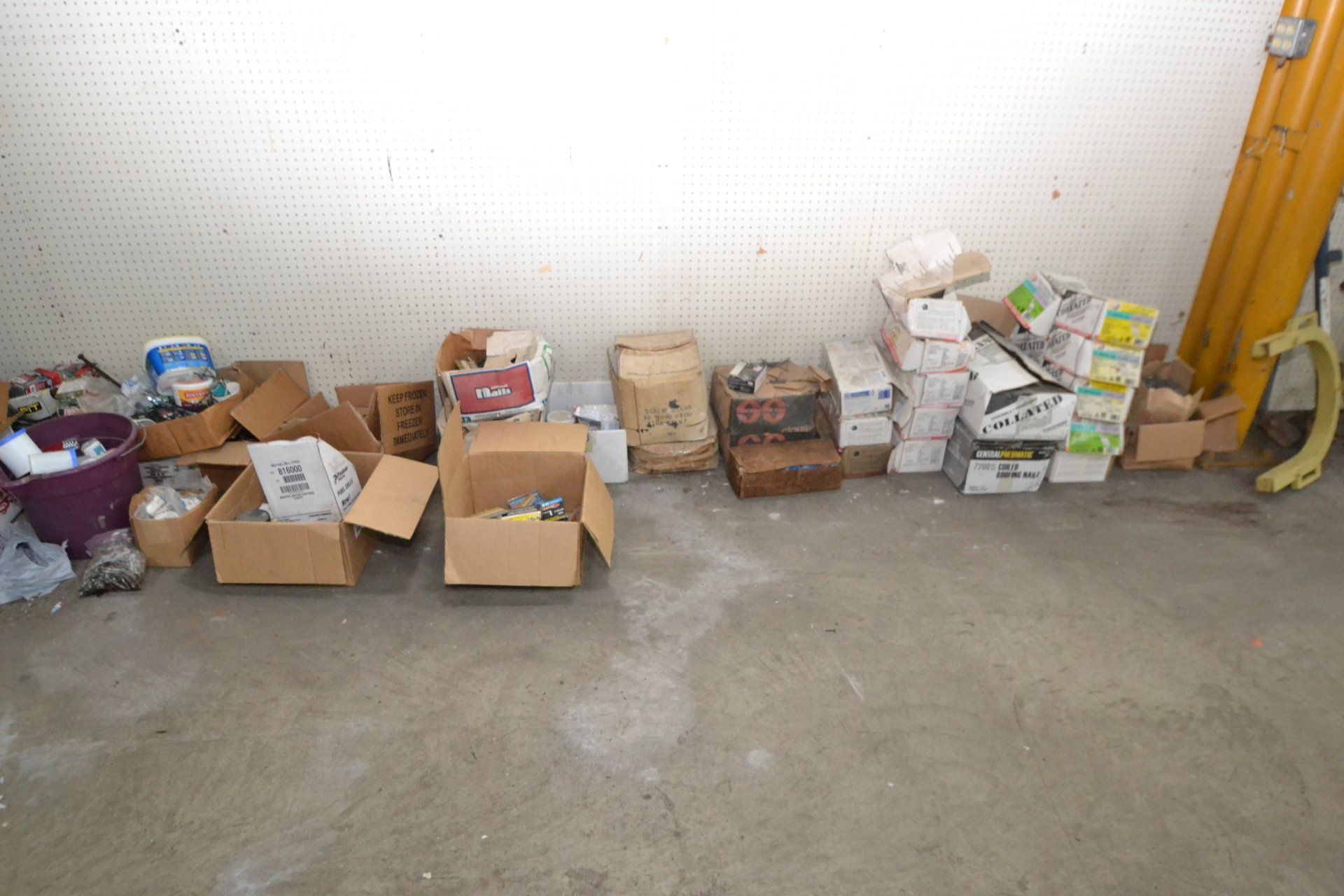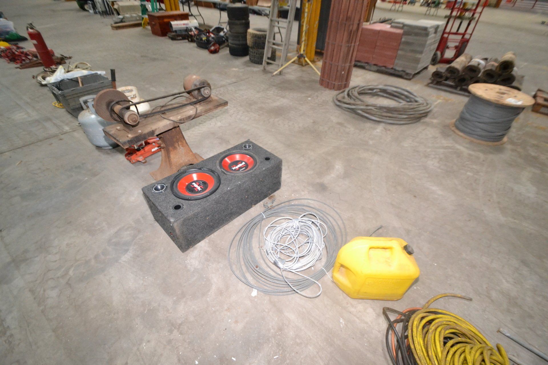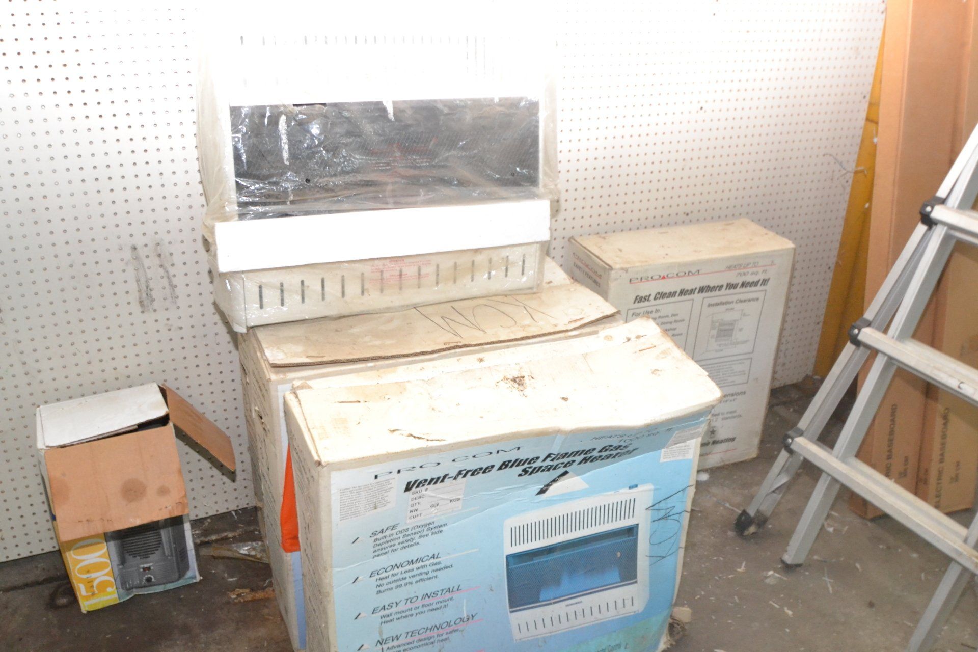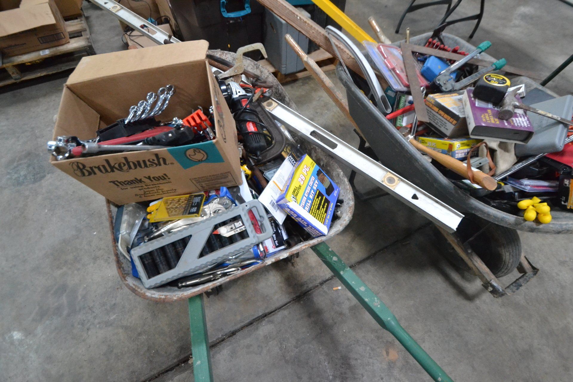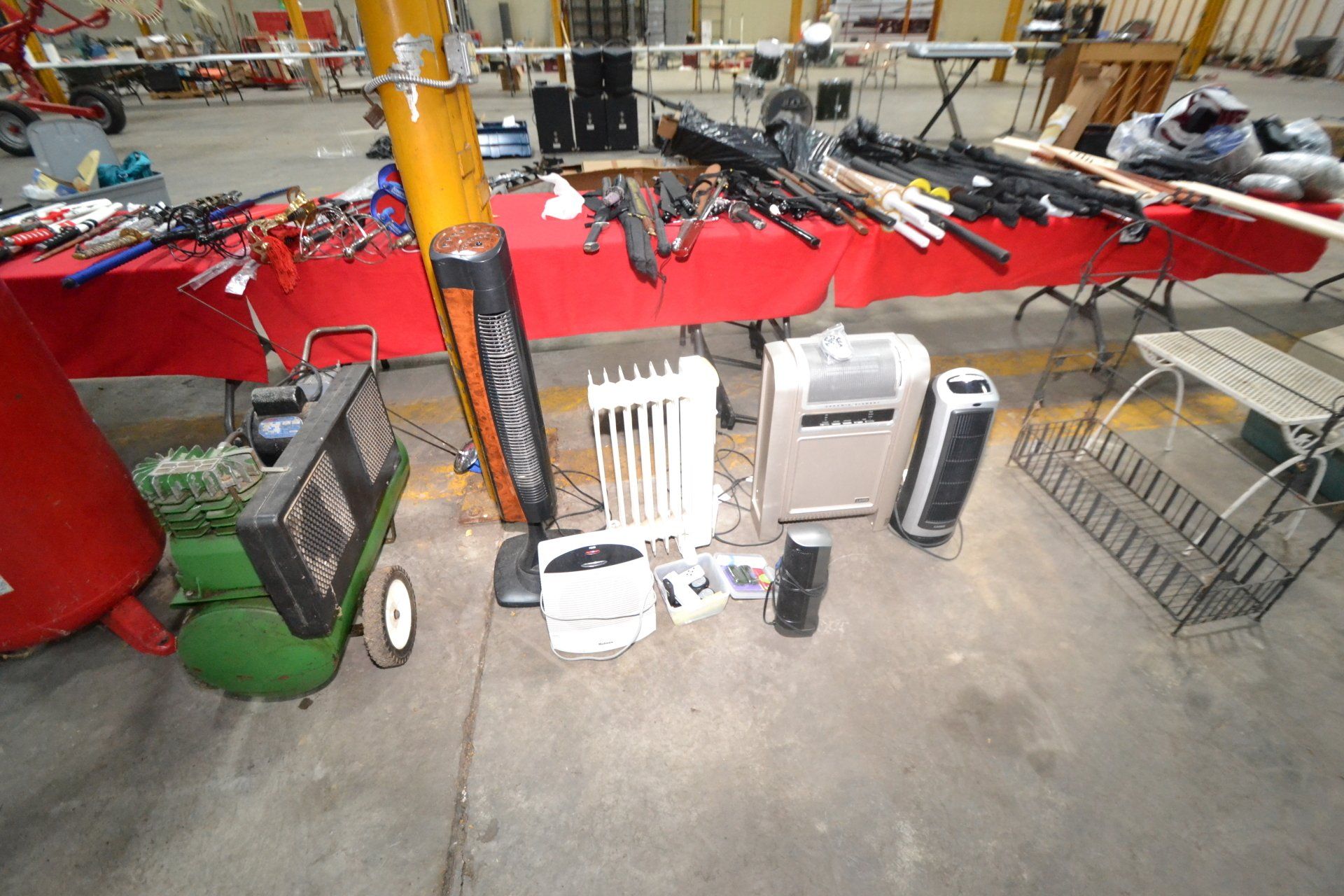 Miscellaneous-new cement mixer; power drain opener; tool cabinets; tool boxes; drill presses; bench grinders; large airless paint sprayer; port-a-powers; floor jacks; hoses; cords; cabinets; shelves; power washer; new LP gas heaters; folding shop crane; boxes of new electric and plumbing parts; panels; breakers; wire; outlets; brass PVC and much, much more.