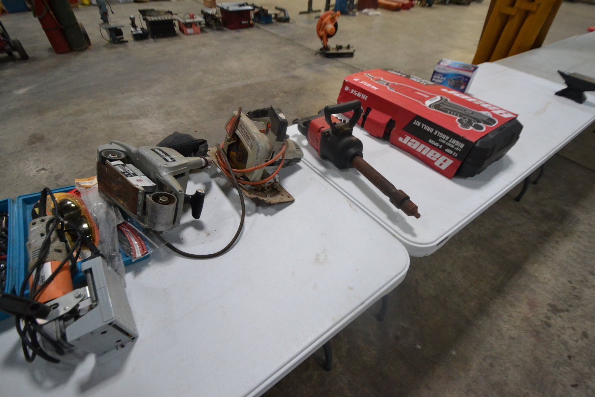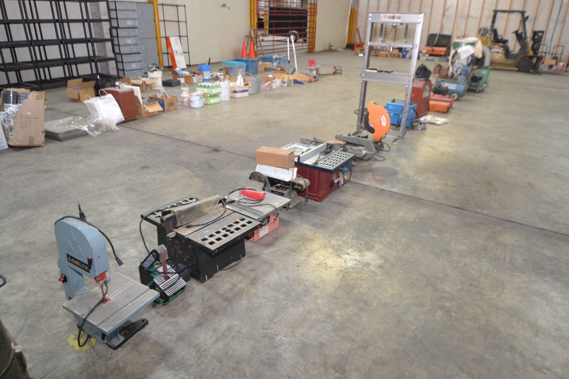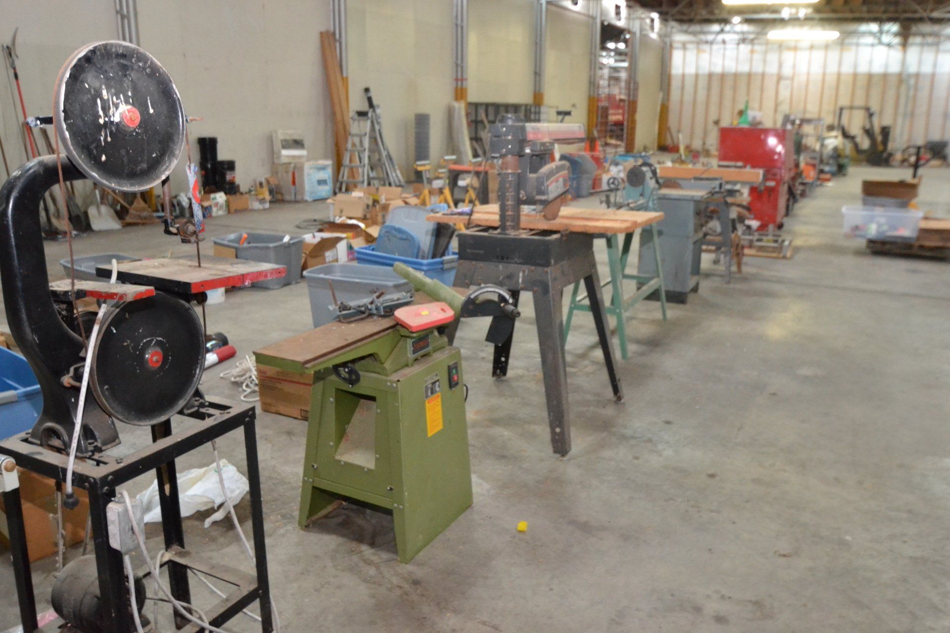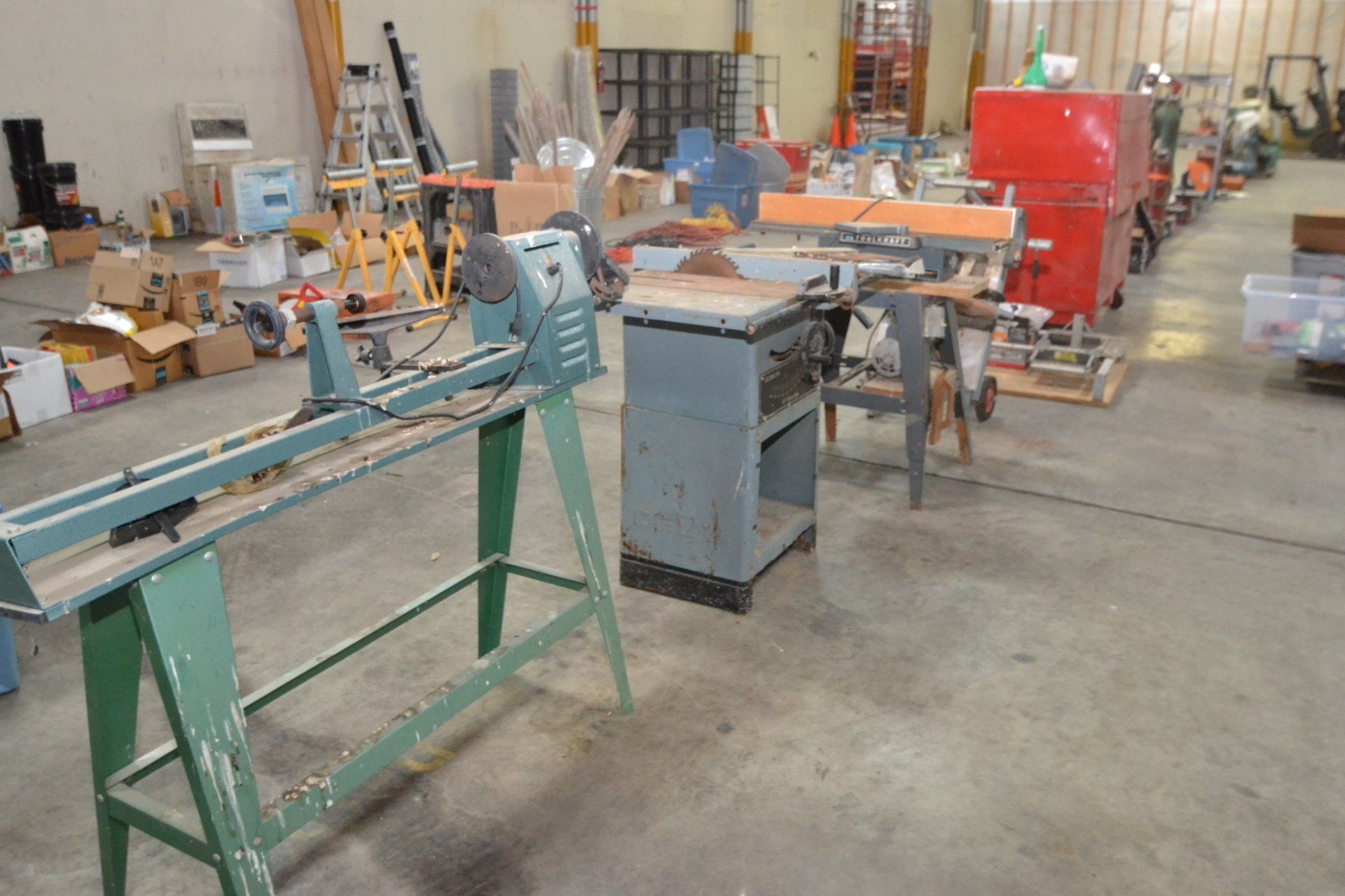 Tools-Tools-Tools-Tools-Woodworking tools-table saws, lathes, jointers, band saws, radial arm saws, planers, sawdust vac, much more. Drywall lift, 20 ft. aluminum walk board; welders-stick, wire, feed, acetylene; tables and tables of wrenches, sockets, power tools, safety equipment; ladders; work benches.