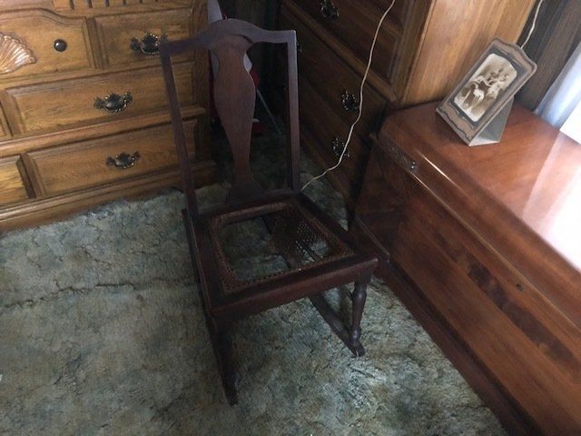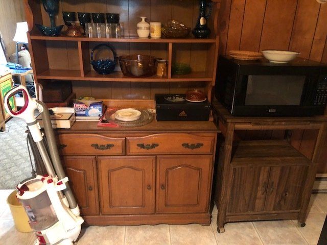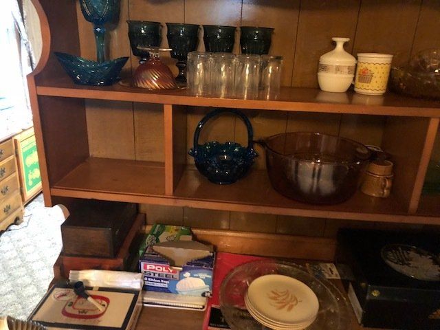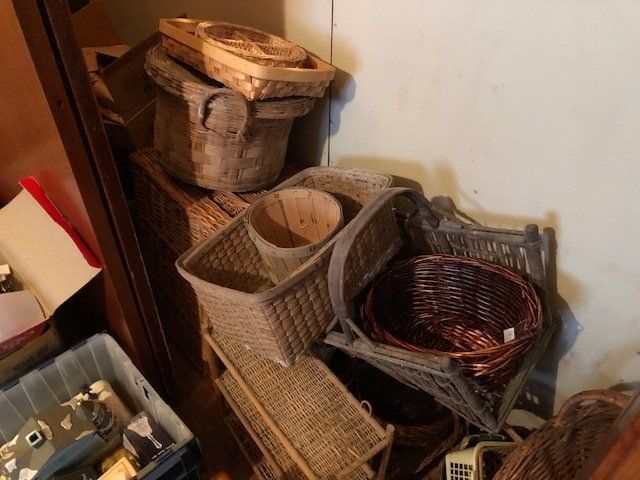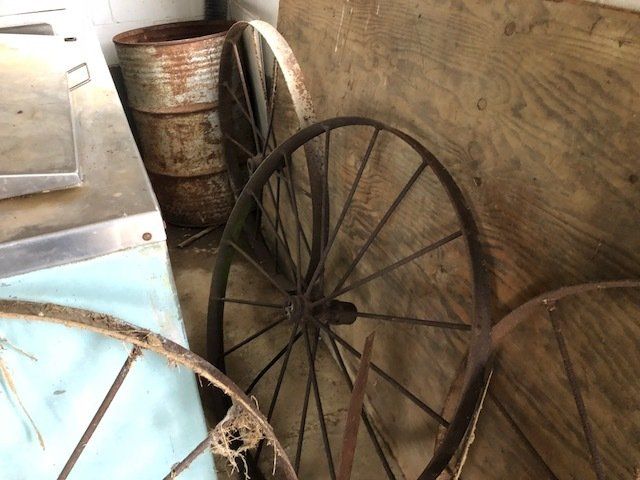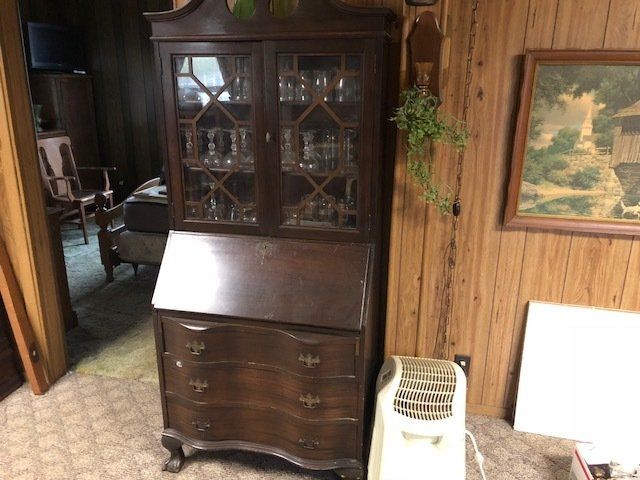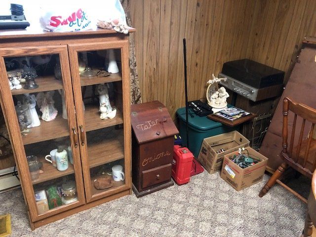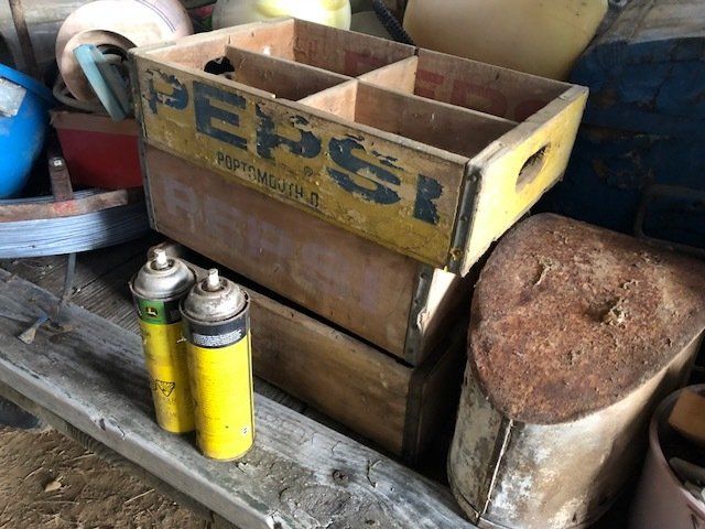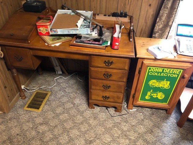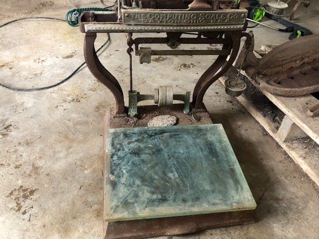 Gem well pump; platform scales; rare scale from The Computing Scale Co. Dayton; asbestos shingle cutter; steel implement wheels; old beverage crates; antique baby buggy; drop front secretary; glass front pie safe; china cabinet; bachelors chest; tobacco baskets; Winston clock; Camel clock; antique adding machine; old toy box; blanket chest; cane and leather bottom chairs; whiskey bottle collection; pewter; silver; Elkhart clarinet; old glassware; milk glass; oil lamps; lots of baskets; cake stand; Rascal motorized scooter; wooden desk; metal desk; walkers and wheelchairs; Heir ref/freezer; upright freezer; washer and dryer; chest of drawers; bedroom set; knick knacks; Duncan Fife drum stand; Shark vacuum; lamps; cookware; more.