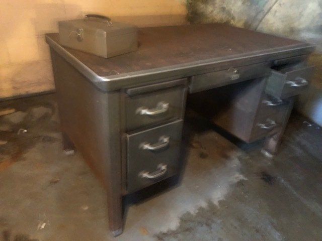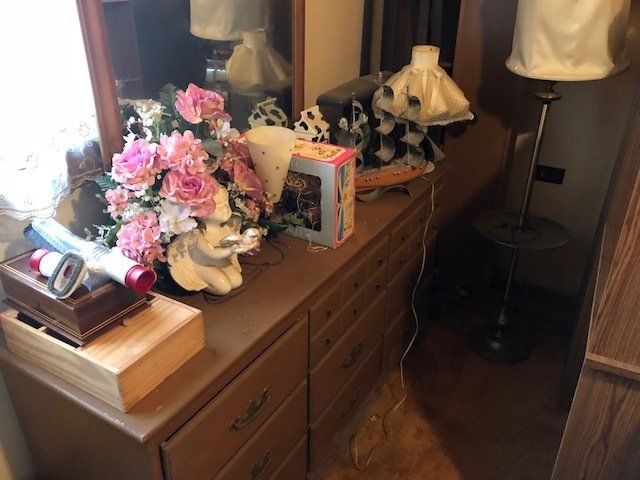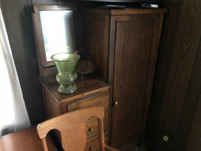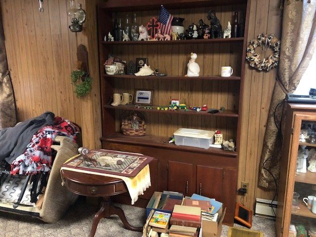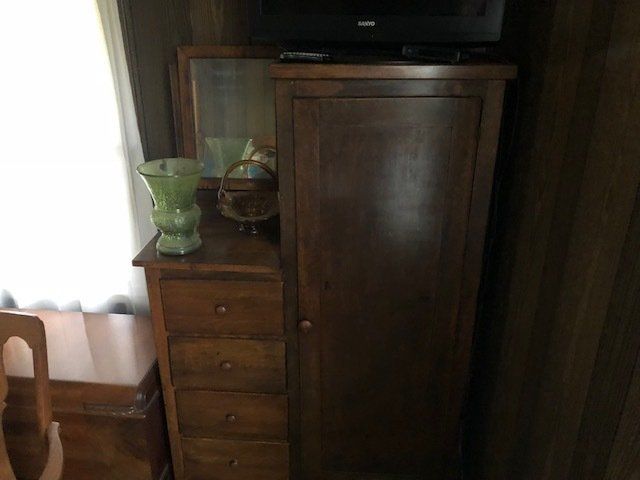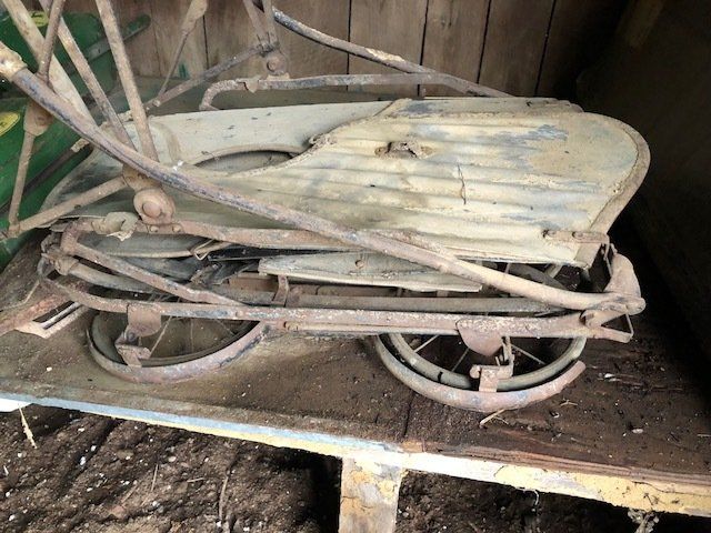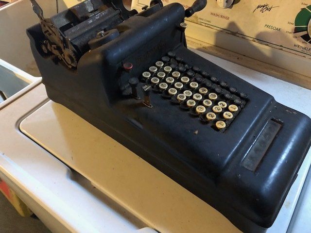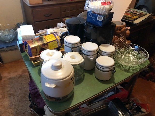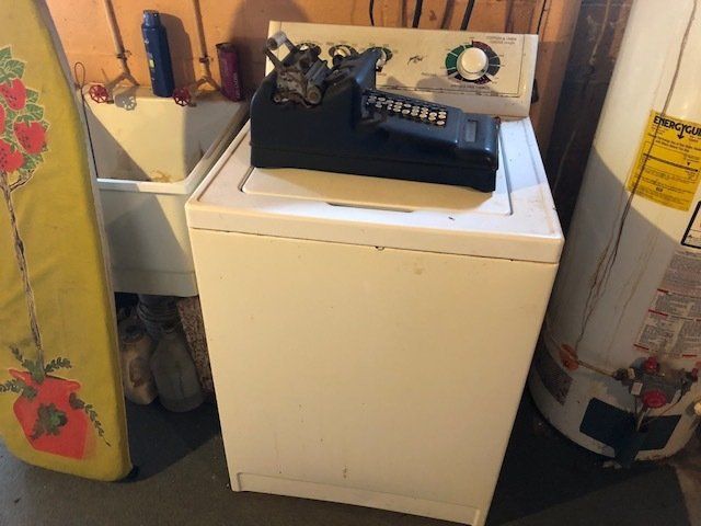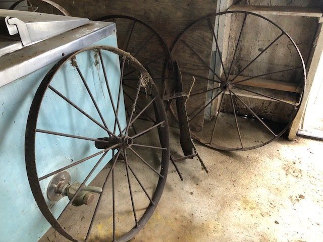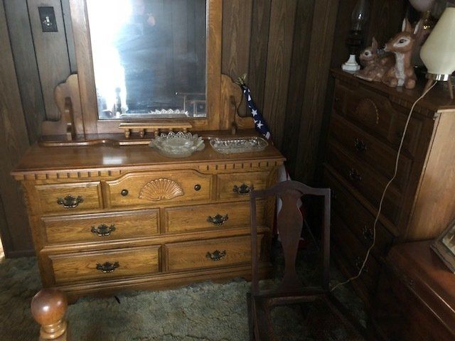 Gem well pump; platform scales; rare scale from The Computing Scale Co. Dayton; asbestos shingle cutter; steel implement wheels; old beverage crates; antique baby buggy; drop front secretary; glass front pie safe; china cabinet; bachelors chest; tobacco baskets; Winston clock; Camel clock; antique adding machine; old toy box; blanket chest; cane and leather bottom chairs; whiskey bottle collection; pewter; silver; Elkhart clarinet; old glassware; milk glass; oil lamps; lots of baskets; cake stand; Rascal motorized scooter; wooden desk; metal desk; walkers and wheelchairs; Heir ref/freezer; upright freezer; washer and dryer; chest of drawers; bedroom set; knick knacks; Duncan Fife drum stand; Shark vacuum; lamps; cookware; more.