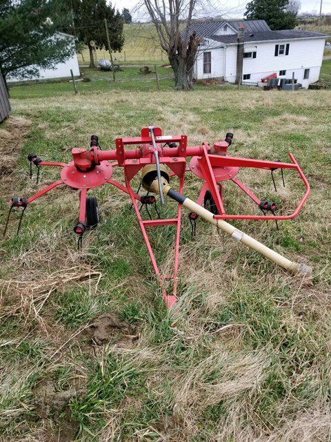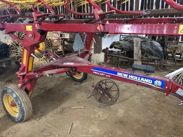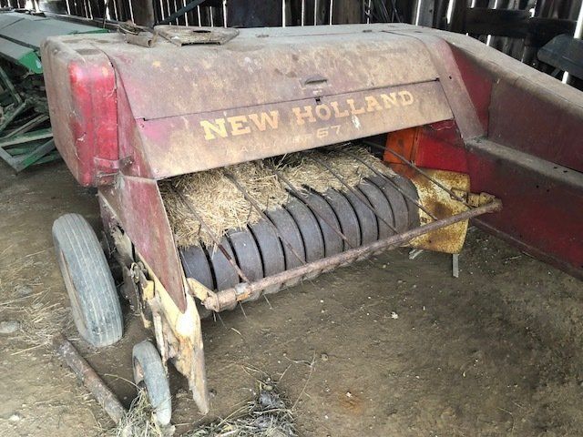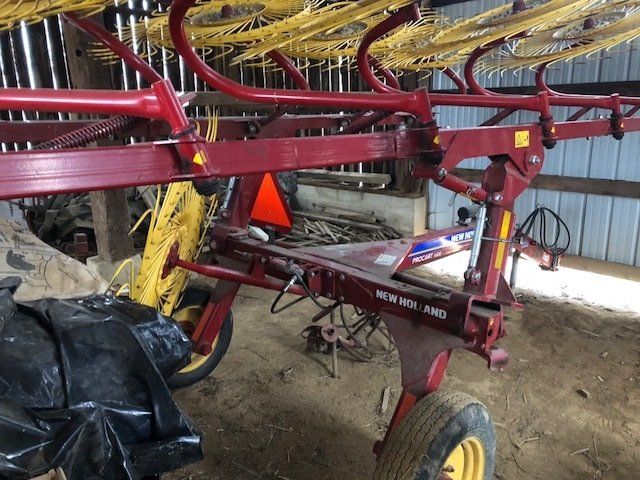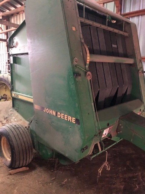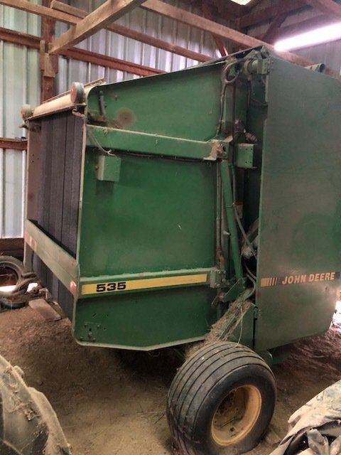 John Deere 535 round baler w/ monitor; JD 265 disc mower; New Holland Procart 1022 wheel rake, 10 wheels w/ kicker; NH Hayliner square baler; several bale spears; 2 basket hay tetter; skeleton style hay elevator; old side delivery rake; more.